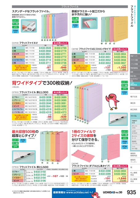 ◀穴をあけてとじるフラットファイル学習ペーパークラフト・素材イベント用品学習支援用品保育安全・安心OA・サプライ用品文具・事務用品日用品電子文具子筆記具筆記具修正用具正ファイル穴をあけてとじるポケットにポケットに入れるとじ具でとじ具ではさみ込むボックス・ボックス・ケースス用途別用途別ファイルファイルサポート用品事務用務接着用品着事務用務ペーパーペーパー鞄机上事務上用品品机上整理上用品用品●●●●まとめ買いパック1組(10冊入)8-632-36548-632-36558-632-36568-632-3657¥1,800¥1,350¥1,485[コクヨ]フラットファイルS(ストロングタイプ)1冊8-632-36508-632-36518-632-36528-632-3653¥180¥137¥150商品種別M価税抜税抜価格税込価格型式/フ-VS10B型式/フ-VS10G型式/フ-VS10P型式/フ-VS10Y青緑ピンク黄「まとめ買いパック」は、各色「1組」単位でお申し込みください。●●●●1冊8-632-26498-632-26508-632-26518-632-26528-632-37108-632-3711¥130¥87¥95まとめ買いパック1組(10冊入)8-632-27698-632-27708-632-27718-632-27728-632-37358-632-3736¥1,300¥846¥930A4判タテ●●●●●●A4判タテ[コクヨ]フラットファイルV商品種別M価税抜税抜価格税込価格型式/フ-V10B型式/フ-V10G型式/フ-V10P型式/フ-V10Y型式/フ-V10CB型式/フ-V10V青緑ピンク黄コバルトブルー紫「まとめ買いパック」は、各色「1組」単位でお申し込みください。●●●●●●●寸法/307(縦)×231(横)mm●背幅/18mm●綴じ厚/15mm●材質/表紙:色板紙(古紙パルプ配合)、綴じ具の押さえ板・スライドコマ:再生ポリスチレン●穴数/2穴(80mm間隔)●適正収容/150枚●包装数:1/10/100●寸法/307(縦)×231横)mm●背幅/18mm●材質/表紙:色板紙(ポリプロピレンフィルム貼り・古紙パルプ配合)、綴じ具押さえ板・スライドコマ:再生ポリスチレン●穴数/2穴(80mm間隔)●適正収容/150枚●包装数:1/10/100背ワイドタイプで300枚収納!※背幅は固定。スタンダードなフラットファイル。樹脂製綴じ具なので保持力が強く書類がずれません。フラットファイル表紙がラミネート加工だから水や汚れに強い!A4判タテA4判タテA3判ヨコ●●⓮●●●1冊のファイルで2サイズの書類を分けて保存できる。A3とA4の2サイズの書類を一緒にとじることができます。まとめ買いパック1組(10冊入)8-632-36938-632-3694¥2,700各色「1組」単位でお申し込みください。¥1,846¥2,030●寸法/307(縦)×231(横)mm●背幅/18mm●表紙厚/0.45mm●材質/色板紙●適正収容/150枚●穴数/2穴(80mm間隔)●包装数:1/10¥191¥210M価税抜税抜価格税込価格1冊8-632-33988-632-3399¥270商品種別型式/フ-VD10B型式/フ-VD10P青ピンク「まとめ買いパック」は、●●[コクヨ]フラットファイル(ダブルとじ具タイプ)●●まとめ買いパック1組(10冊入)8-632-36898-632-36908-632-36918-632-36928-632-43728-632-4373¥1,800¥939¥1,0321冊8-632-30388-632-30398-632-30408-632-30418-632-43188-632-4319¥180¥98¥107商品種別型式/No.021NWBL型式/No.021NWGR型式/No.021NWYL型式/No.021NWPK型式/NO.021NWRBL型式/NO.021NWVLM価税抜税抜価格税込価格ブルーグリーンイエローピンクロイヤルブルーバイオレット「まとめ買いパック」は、各色「1組」単位でお申し込みください。●●●●●●[プラス]フラットファイル厚とじ300●寸法/307(縦)×230(横)mm●背幅/28mm●材質/表紙:ファイルカード紙(再生紙・ノンステッチ加工)、綴じ具:再生ポリプロピレン●穴数/2穴(80mm間隔)●適正収容/300枚●包装数:1/10最大収容500枚の超厚とじタイプ!※背幅は固定。A4判タテ●●●●M価税抜税抜価格税込価格単位¥250¥167¥1831冊[プラス]フラットファイル厚とじ500商品種別型式/No.021SWBL型式/No.021SWGR型式/No.021SWYL型式/No.021SWPKお申込番号8-632-31928-632-31938-632-31948-632-3195ブルーグリーンイエローピンク●⓳●●●寸法/302縦)×230横)mm●背幅/53mm●材質/本体:ファイルカード紙(再生紙2枚使用・ノンステッチ加工)、綴じ具:再生ポリプロピレン●穴数/2穴(80mm間隔)●適正収容/500枚●包装数:1/10※カタログに掲載の商品情報(仕様・価格・税率など)は変更になる場合がございます。最新情報はUCHIDASww.uchidas.netwへ!Vol.20935