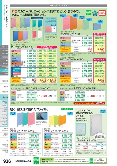 PPフラットファイル11色のカラーバリエーション!!ポリプロピレン製なので、アルコール消毒も可能です。A4ワイドタテA4判タテB5判タテキャリア・パスポートA5判ヨコA5判タテ[ビュートンジャパン]PPフラットファイルB5商品種別ピンクイエローグリーンブルー「まとめ買いパック」は、各色「1組」単位でお申し込みください。267縦)×196横)mm、型式/FF-B5SM価税抜税抜価格税込価格1冊8-632-16378-632-16388-632-16398-632-1640オープン¥130¥143まとめ買いパック1組(10冊入)8-632-17948-632-17958-632-17968-632-1797オープン¥1,260¥1,386●背幅/18mm●表紙厚/0.5mm●材質/ポリプロピレン●穴数/2穴(80mm間隔)●適正収容/160枚●包装数:1/10[ビュートンジャパン]PPフラットファイルA4ワイドまとめ買いパック商品種別ピンクイエローグリーンブルーロイヤルブルーオレンジ「まとめ買いパック」は、各色「1組」単位でお申し込みください。307(縦)×247横)mm、型式/FF-A4SHWM価税抜税抜価格税込価格1冊8-632-39558-632-39568-632-39578-632-39588-632-40698-632-4070オープン¥160¥1761組(10冊入)8-632-39708-632-39718-632-39728-632-39738-632-41668-632-4167オープン¥1,550¥1,705ウチダスオリジナルカラーA4ワイドは2穴クリアファイルを収納してもはみ出さない幅広タイプ。ワイド表紙ピンクイエローグリーンブルーエメラルドグリーンスカイブルー※キャリア・パスポートにオススメの2穴成績表ファイルはP.946・947に掲載しております。チェリーピンクホワイトロイヤルブルーオレンジバイオレットまとめ買いパック1組(10冊入)8-632-17908-632-17918-632-17928-632-17938-632-29478-632-29488-632-43558-632-32188-632-32198-632-42668-632-4267オープン¥1,240¥1,3641組(100冊入)8-632-40288-632-40298-632-40308-632-40318-632-40328-632-40338-632-43748-632-40348-632-40358-632-42748-632-4275オープン¥11,748¥12,9221冊8-632-16338-632-16348-632-16358-632-16368-632-28978-632-28988-632-43028-632-32068-632-32078-632-42608-632-4261オープン¥135¥148307(縦)×230(横)mm、型式/FF-A4SM価税抜税抜価格税込価格商品種別ピンクイエローグリーンブルーロイヤルブルーオレンジバイオレットエメラルドグリーンスカイブルーチェリーピンクホワイトオリジナルカラー「まとめ買いパック」は、各色「1組」単位でお申し込みください。[ビュートンジャパン]PPフラットファイルA4●背幅/18mm●表紙厚/0.5mm●材質/ポリプロピレン●穴数/2穴(80mm間隔)●適正収容/160枚●包装数:1/10●背幅/18mm●表紙厚/0.5mm●材質/ポリプロピレン●穴数/2穴(80mm間隔)●適正収容/160枚●包装数:1/10[ビュートンジャパン]PPフラットファイルA5タテ商品種別お申込番号M価税抜税抜価格税込価格単位220縦)×163横)mm、型式/FF-A5Sピンクイエローグリーンブルー●背幅/15mm●表紙厚/0.45mm●材質/ポリプロピレン●穴数/2穴(80mm間隔)●適正収容/140枚●包装数:1/58-632-44308-632-44318-632-44328-632-4433ピンクイエローグリーンブルー¥130¥143オープン1冊160(縦)×225(横)mm、型式/FF-A5Eオープン8-632-44348-632-44358-632-44368-632-4437A5サイズのまとめ買いパックはWEB¥130¥143へ!1冊[ビュートンジャパン]PPフラットファイルA5ヨコ商品種別お申込番号M価税抜税抜価格税込価格単位軽く、耐久性に優れたファイル。A4判タテポリプロピレン製なので水をはじき、汚れも拭き取れます。A4判ヨコスリムタイプの2穴ポリプロピレンファイル。透明表紙だから中身がわかりやすい。A4判タテ青緑ピンク[コクヨ]フラットファイル〈PP〉A4S青緑ピンク黄黄緑オレンジM価税抜¥310商品種別型式/フ-H10B型式/フ-H10G型式/フ-H10P型式/フ-H10Y型式/フ-H10YG型式/フ-H10YR税抜価格¥219お申込番号8-632-37188-632-37198-632-37208-632-37218-632-37228-632-3723税込価格¥240単位1冊黄緑黄[コクヨ]フラットファイル〈PP〉A4Eオレンジ青緑ピンク黄黄緑オレンジM価税抜¥310商品種別型式/フ-H15B型式/フ-H15G型式/フ-H15P型式/フ-H15Y型式/フ-H15YG型式/フ-H15YR税抜価格¥219お申込番号8-632-37248-632-37258-632-37268-632-37278-632-37288-632-3729税込価格¥240単位1冊●寸法/307(縦)×231(横)mm●背幅/20mm●表紙厚/0.8mm●材質/再生発泡ポリプロピレン●穴数/2穴(80mm間隔)●適正収容/150枚●包装数:1/10●寸法/226(縦)×313(横)mm●背幅/20mm●表紙厚/0.8mm●材質/再生発泡ポリプロピレン●穴数/2穴(80mm間隔)●適正収容/150枚●包装数:1/10丈夫な樹脂製とじ具。[ビュートンジャパン]レポートパンチファイルクリヤー商品種別型式/RPF-A4-Cスリムだから持ち運びに便利。お申込番号8-632-3423税込価格税抜価格¥145M価税抜オープン●寸法/305(縦)×222(横)mm●背幅/17mm●表紙厚/0.3mm●材質/ポリプロピレン●穴数/2穴単位1冊¥159(80mm間隔)●適正収容/100枚●包装数:1/20936Vol.20地球にやさしくお買い物このマークのついた商品は地球環境保護に配慮された商品です。グリーンの文字で商品の判別をしやすくしました。どうぞご利用ください。エコマーク認定品グリーン購入法適合品GPNエコ商品ねっと掲載PPフラットファイル▶穴をあけてとじる学習ペーパークラフト・素材イベント用品学習支援用品保育安全・安心OA・サプライ用品文具・事務用品日用品電子文具電子文筆記具筆記具修正用具修正用ファイル穴をあけてとじるポケットにポケットに入れるとじ具で