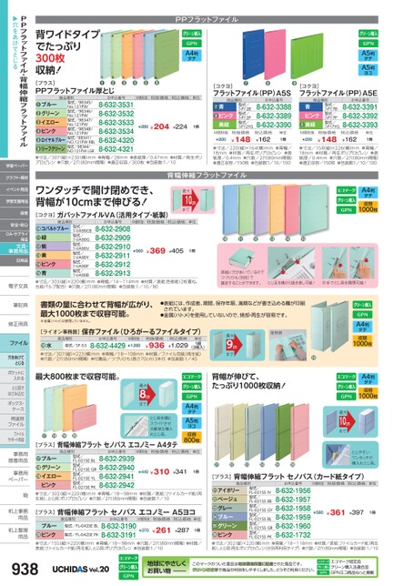 背ワイドタイプでたっぷり300枚収納!PPフラットファイルA4判タテA5判タテA5判ヨコ❼❽●[コクヨ]フラットファイル(PP)A5S[コクヨ]フラットファイル(PP)A5E青ピンク黄緑●M価税抜¥200商品種別型式/フ-P17B型式/フ-P17P型式/フ-P17YGお申込番号8-632-33918-632-33928-632-3393税抜価格¥148税込価格¥162単位1冊お申込番号8-632-33888-632-33898-632-3390商品種別型式/フ-P12B型式/フ-P12P型式/フ-P12YG青ピンク黄緑●●M価税抜¥200税抜価格¥148税込価格¥162単位1冊●寸法/220縦)×164横)mm●背幅/18mm●材質/再生ポリプロピレン●表紙厚/0.4mm●穴数/2穴(80mm間隔)●適正収容/150枚●包装数:1/10/100●寸法/158縦)×226横)mm●背幅/18mm●材質/再生ポリプロピレン●表紙厚/0.4mm●穴数/2穴(80mm間隔)●適正収容/150枚●包装数:1/10/100●●❺❻M価税抜税抜価格税込価格単位¥280¥204¥2241冊お申込番号8-632-35318-632-35328-632-35338-632-35348-632-43208-632-4321商品種別型式/98345/No.121PW型式/98346/No.121PW型式/98347/No.121PW型式/98348/No.121PW型式/98341/NO.121PWRBL型式/98344/NO.121PWLGRブルーグリーンイエローピンクロイヤルブルーリーフグリーン●●●●●●[プラス]PPフラットファイル厚とじ●●●寸法/307縦)×230(横)mm●背幅/28mm●表紙厚/0.47mm●材質/再生ポリプロピレン●穴数/2穴(80mm間隔)●適正収容/300枚●包装数:1/10背幅伸縮フラットファイル最大10cmまでA4判タテ収容1000枚単位●●●●●●¥560¥369¥4051冊ワンタッチで開け閉めでき、背幅が10cmまで伸びる![コクヨ]ガバットファイルVA(活用タイプ・紙製)M価税抜税抜価格税込価格お申込番号8-632-29088-632-29098-632-29108-632-29118-632-29128-632-2913商品種別型式/フ-VA90CB型式/フ-VA90G型式/フ-VA90V型式/フ-VA90Y型式/フ-VA90P型式/フ-VA90Bコバルトブルー緑紫黄ピンク青●●●●●●電子文具電子文●寸法/303(縦)×220(横)mm●背幅/14〜114mm●材質/表紙:色板紙(2枚重ね、古紙パルプ配合)●穴数/2穴(80mm間隔)●包装数:1/10/80表紙に穴があいているのでつづりひも(別売)で固定することができます。とじ足を横から抜き差し可能!片手でとじ具を開閉可能!PPフラットファイル・背幅伸縮フラットファイル▶穴をあけてとじる学習ペーパークラフト・素材イベント用品学習支援用品保育安全・安心OA・サプライ用品文具・事務用品日用品筆記具筆記具修正用具修正用ファイル穴をあけてとじるポケットにポケットに入れるとじ具でとじ具ではさみ込むボックス・ボックス・ケース用途別用途別ファイルファイルサポート用品書類の量に合わせて背幅が広がり、最大1000枚まで収容可能。※金属(ハトメ)は使用していません。●表紙には、作成者、期間、保存年限、満期などが書き込める欄が印刷されています。●金属(ハトメ)を使用していないので、焼却・再生が容易です。[ライオン事務器]保存ファイル(ひろがーるファイルタイプ)商品種別お申込番号税抜価格水型式/SF-53●(3冊入)●寸法/307(縦)×223(横)mm●背幅/18〜108mm●材質/ファイル用紙(再生紙)●穴数/2穴(80mm間隔)●付属品/つづりひも(長さ70cm)3本付●包装数:1/408-632-4429¥936税込価格¥1,029単位1組M価税抜¥1,360最大9cmまで使用例●最大800枚まで収容可能。最大8cmまで●●●●とじ具を横にスライドさせる簡単な横入れとじ具。背幅が伸びて、たっぷり1000枚収納!A4判タテA5判ヨコ収容800枚A4判タテ収容1000枚A4判タテ収容1000枚とじやすいワンタッチの横入れとじ具。最大10cmまで¥580¥361¥3971冊型式/FL-021SSIV型式/FL-021SSBE型式/FL-021SSGY型式/FL-021SSBL型式/FL-021SSGR型式/FL-021SSPKお申込番号8-632-19568-632-19578-632-19588-632-19598-632-19608-632-1732アイボリーベージュグレーブルーグリーンピンク●●●●●●¥440¥310¥3411冊●●●●●●[プラス]背幅伸縮フラットセノバス(カード紙タイプ)商品種別M価税抜税抜価格税込価格単位[プラス]背幅伸縮フラットセノバスエコノミーA4タテ商品種別M価税抜税抜価格税込価格単位型式/FL-021SEBL型式/FL-021SEGR型式/FL-021SEYL型式/FL-021SEPKお申込番号8-632-29398-632-29408-632-29418-632-2942ブルーグリーンイエローピンク●●●事務用事務接着用品接着用事務用事務用ペーパーペーパー鞄鞄●寸法/302縦)×220(横)mm●背幅/18〜98mm●材質/表紙:ファイルカード紙(再生紙)、とじ具:ポリプロピレン●穴数/2穴(80mm間隔)●包装数:1/10机上事務机上事用品用品机上整理机上整用品用品[プラス]背幅伸縮フラットセノバスエコノミーA5ヨコ商品種別ブルーピンク●型式/FL-042SEBL型式/FL-042SEPKお申込番号8-632-31908-632-3191M価税抜税抜価格税込価格単位¥370¥261¥2871冊●寸法/155(縦)×220(横)mm●背幅/18〜98mm●穴数/2穴(80mm間隔)●材質/表紙:ファイルカード紙(再生紙)、とじ具:ポリプロピレン●包装数:1/10●寸法/302(縦)×220(横)mm●背幅/18〜118mm●材質/表紙:ファイルカード紙(再生紙)、とじ具:再生ポリプロピレン(分別再利用タイプ)●穴数/2穴(80mm間隔)●包装数:1/10Vol.20地球にやさしくお買い物このマークのついた商品は地球環境保護に配慮された商品です。グリーンの文字で商品の判別をしやすくしました。どうぞご利用ください。エコマーク認定品グリーン購入法適合品GPNエコ商品ねっと掲載