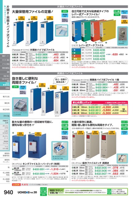 片開きパイプ式ファイル大量保管用ファイルの定番!収容約300枚❶収容約500枚❷収容約800枚❸A4判タテ背見出し差替可能自立可能で丈夫な貼表紙タイプのレバー式アーチファイル!底部に縁金が付いているため丈夫です。A4ワイドタテ背見出し差替可能収容約580枚❹❺❻80mm[ハピラ]レバー式アーチファイル商品種別型式/SGLAF8BL型式/SGLAF8GR型式/SGLAF8RD型式/SGLAF8YEお申込番号8-632-42368-632-42378-632-42388-632-4239❼レバー操作で簡単開閉。M価税抜税抜価格税込価格単位¥1,060¥620¥6821冊●寸法/308縦)×280(横)mm●背幅/80mm●綴じ厚/58mm●材質/表紙:オレフィン素材貼表紙、芯材:古紙パルプ配合率100%再生紙●穴数/2穴(80mm間隔)●背見出し差替可能●包装数:1※インデックスは付いていません。青緑赤黄色●●●●M価税抜税抜価格税込価格単位¥463¥419¥604¥509¥460¥6641冊オープンお申込番号8-632-38068-632-38088-632-3810商品種別背幅/56mm、型式/A4SPFE-3B背幅/76mm、型式/A4SPFE-5B背幅/106mm、型式/A4SPFE-8B綴じ厚/30mm綴じ厚/50mm綴じ厚/80mm●●●[Tanoseeオリジナル]片開きパイプ式ファイル●寸法/307(縦)×240(横)mm●材質/表紙:ポリプロピレンフィルム貼り、芯材:再生紙100%●穴数/2穴(80mm間隔)●背見出し差替可能●包装数:1※インデックスは付いていません。56mm76mm106mm両開きパイプ式ファイル抜き差しに便利な両開きファイル!収容約300枚安心・信頼の国産品質!収容約500枚❾収容約800枚❿❽A4判タテ背見出し差替可能M価税抜税抜価格税込価格単位¥482¥428¥591¥530¥470¥6501冊オープンお申込番号8-632-38038-632-38048-632-3805商品種別背幅/45mm、型式/ORPA4S-3B背幅/65mm、型式/ORPA4S-5B背幅/95mm、型式/ORPA4S-8B綴じ厚/30mm綴じ厚/50mm綴じ厚/80mm●●●[Tanoseeオリジナル]両開きパイプ式ファイル1冊●寸法/307(縦)×246(横)mm●材質/ポリプロピレンフィルム貼り、芯材:古紙パルプ配合●穴数/2穴(80mm間隔)●背見出し差替可能●包装数:1※インデックスは付いていません。※1組単位申込。税抜価格¥4,260¥3,880¥5,300税込価格¥4,686¥4,268¥5,830単位1組(10冊入)お申込番号8-632-38128-632-38138-632-3814まとめ買いパック商品種別綴じ厚/30mm綴じ厚/50mm綴じ厚/80mm●●●ワンプッシュオープンのとじ具を使用。45mm65mm膨大な量の書類の一括収納を可能に。便利な取っ手付き!!⓫収容1000枚⓬収容1500枚95mm※10冊入は、10冊専用箱でのご提供ではありません。大量の保存に最適。閲覧・差し替えも便利な両開きタイプ。コストを抑えたボード表紙で、資料の保存用ファイルとしておすすめ。⓭収容300枚⓮収容500枚⓯収容800枚A4判タテA4判タテ背見出し差替可能お申込番号8-632-34358-632-34368-632-3437M価税抜¥540¥550¥790税抜価格税込価格単位¥378¥415¥385¥423¥553¥6081冊商品種別背幅/47mm、型式/4073-R背幅/65mm、型式/4075-R背幅/94mm、型式/4078-R綴じ厚/30mm綴じ厚/50mm綴じ厚/80mm●●●[キングジム]保存ファイルドッチ両開き●寸法/307(縦)×240(横)mm●材質/表紙:印刷ボード表紙、綴じ具:ポリプロピレン●穴数/2穴(80mm間隔)●包装数:1/20(30・50mm)、1/10(80mm)※インデックスは付いていません。[キングジム]キングファイルスーパードッチ〈特厚〉⓫⓬綴じ厚/100mm綴じ厚/150mm商品種別お申込番号M価税抜税抜価格税込価格単位背幅/116mm、型式/3510-B背幅/166mm、型式/3515-B8-632-3201¥1,870¥1,310¥1,4418-632-3203¥2,180¥1,524¥1,6761冊●寸法/307(縦)×252(横)mm●材質/貼表紙:オレフィン素材、表紙芯材:再生紙、綴じ具:スチール●穴数/2穴(80mm間隔)●カラーインデックス1組付●背見出し差替可能●包装数:1/5LOOKP.975インデックスを掲載しております。116mm166mm取っ手付きなのでスムーズに取り出し可能。47mm65mm94mmVol.20地球にやさしくお買い物このマークのついた商品は地球環境保護に配慮された商品です。グリーンの文字で商品の判別をしやすくしました。どうぞご利用ください。エコマーク認定品グリーン購入法適合品GPNエコ商品ねっと掲載片開き・両開きパイプ式ファイル▶穴をあけてとじる学習ペーパークラフト・素材イベント用品学習支援用品保育安全・安心OA・サプライ用品文具・事務用品日用品電子文具電子文筆記具筆記具修正用具修正用ファイル穴をあけてとじるポケットにポケットに入れるとじ具でとじ具ではさみ込むボックス・ボックス・ケース用途別用途別ファイルファイルサポート用品事務用事務接着用品接着用事務用事務用ペーパーペーパー鞄鞄机上事務机上事用品用品机上整理机上整用品用品