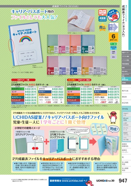 ◀ポケットに入れる成績表ファイル(ヨコ入れ)学習ペーパークラフト・素材イベント用品学習支援用品保育安全・安心OA・サプライ用品文具・事務用品日用品電子文具子筆記具筆記具修正用具正ファイル穴をあけて穴をあけてとじるポケットに入れるとじ具でとじ具ではさみ込むボックス・ボックス・ケースス用途別用途別ファイルファイルサポート用品事務用務接着用品着事務用務ペーパーペーパー鞄机上事務上用品品机上整理上用品用品コれ6ヨ入ポケット成績表ファイル(ヨコ入れ)キャリア・パスポート用のファイルとしても大人気!キャリア・パスポート成績表におすすめ使用例※用紙はサンプルです。ライトグリーンピンクオレンジモスグリーンA4/A3判ヨコ中紙なし2穴ワインレッドホワイトネイビーイエロークリアー(乳白)まとめ買い6ポケット5冊入[ウチダ]2穴成績表ファイルA4ヨコ6ポケット5冊入商品種別お申込番号商品種別ブルー使用例※用紙はサンプルです。穴があいているので保管に便利!6ポケット1冊[ウチダ]2穴成績表ファイルA4ヨコ6ポケット1冊商品種別お申込番号商品種別お申込番号ホワイトネイビーイエロークリアー(乳白)ライトグリーンピンクオレンジモスグリーンワインレッドブルー●寸法/305(縦)×228(横)mm●シート数/3枚(6ポケット)●表紙厚/透明表紙:0.18mm、裏表紙:0.38mm●背幅/1mm●材質/再生ポリプロピレン●中紙なし●包装数:5冊パック1/10ライトグリーンピンクオレンジモスグリーンワインレッドブルー8-632-35158-632-35168-632-35178-632-35188-632-35198-632-35208-632-35668-632-35678-632-35688-632-35698-632-35708-632-35718-632-35218-632-35228-632-35238-632-3524ホワイトネイビーイエロークリアー(乳白)税抜価格¥567税抜価格¥120税込価格¥132M価税抜オープンM価税抜オープン単位1冊お申込番号8-632-35728-632-35738-632-35748-632-3575税込価格¥623単位1組(5冊入)2穴成績表ファイルは成績表用としてだけではなく、キャリア・パスポート用としてもご活用いただけます。UCHIDAS提案!!キャリア・パスポート向けファイル児童・生徒一人に1学年ごとに1冊で管理小学校での使用イメージ1年間でひとり1冊2穴クリアファイルキャリアパスポートの用紙を入れる。6年間でひとり1冊2穴用フラット・リングファイルワイド幅表紙のファイルにとじればクリアファイルがはみ出る心配もありません。はみ出るスッキリ!はみ出さない!1年生2年生3年生4年生5年生6年生完成!一般的な表紙の2穴用ファイルワイド幅表紙の2穴用ファイル2穴成績表ファイルをキャリア・パスポートにおすすめする理由●薄くて軽いので、児童・生徒が家に持ち帰るのも負担軽減。校内での管理も省スペースに。●学年別に色分けしたり、学校区内でA小学校はピンク、B小学校はブルーなどと使い分けることができます。●紙のままでの保管よりもクリアファイルを活用する方が、長期間の保管に適しています。●リングファイルなどと組み合わせて使用することで、数年分の書類を蓄積・管理ができます。※カタログに掲載の商品情報(仕様・価格・税率など)は変更になる場合がございます。最新情報はUCHIDASww.uchidas.netwへ!Vol.20