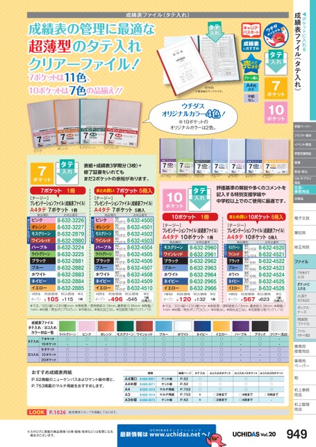 ◀ポケットに入れる成績表ファイル(タテ入れ)学習ペーパークラフト・素材イベント用品学習支援用品保育安全・安心OA・サプライ用品文具・事務用品日用品電子文具子筆記具筆記具修正用具正ファイル穴をあけて穴をあけてとじるポケットに入れるとじ具でとじ具ではさみ込むボックス・ボックス・ケースス用途別用途別ファイルファイルサポート用品事務用務接着用品着事務用務ペーパーペーパー鞄机上事務上用品品机上整理上用品用品LOOKP.1026通信簿用スタンプを掲載しております。※カタログに掲載の商品情報(仕様・価格・税率など)は変更になる場合がございます。最新情報はUCHIDASww.uchidas.netwへ!Vol.20成績表ファイル(タテ入れ)成績表の管理に最適な管適超薄型のタテ入れクリアーファイル!7ポケットは11色、10ポケットは7色の品揃え!!タテ入れ使用例※通知表はサンプルです。ウチダスオリジナルカラー4色!※10ポケットのオリジナルカラーは2色。キャリア・パスポート成績表におすすめA4判タテ中紙なしタテ入れ7ポケット10ポケットパープルライトグリーンブラックブルーホワイトネイビーイエロー10ポケットタテ入れ評価基準の解説や多くのコメントを記入する特別支援学級や中学校以上でのご使用に最適です。10ポケット5冊入まとめ買い[テージー]プレゼンテーションファイル(成績表ファイル)A4タテ10ポケット5冊入商品種別型式/PTFU-10-32型式/PTFU-10-18型式/PTF-10-01型式/PTF-10-02型式/PTF-10-06型式/PTF-10-30型式/PTF-10-07お申込番号8-632-45208-632-45218-632-45228-632-45238-632-45248-632-45258-632-4526モスグリーンワインレッドブラックブルーホワイトネイビーイエローオリジナルカラー10ポケット1冊[テージー]プレゼンテーションファイル(成績表ファイル)A4タテ10ポケット1冊お申込番号8-632-29608-632-29618-632-29628-632-29638-632-29648-632-29658-632-2966商品種別モスグリーンワインレッドブラックブルーホワイトネイビーイエローオリジナルカラーピンク7ポケットオレンジモスグリーンワインレッドタテ入れ表紙+成績表3学期分(3枚)+修了証書をいれてもまだ2ポケットの余裕があります。7ポケット1冊[テージー]プレゼンテーションファイル(成績表ファイル)A4タテ7ポケット1冊7ポケット5冊入まとめ買い[テージー]プレゼンテーションファイル(成績表ファイル)A4タテ7ポケット5冊入商品種別お申込番号8-632-45008-632-45018-632-45028-632-45038-632-45048-632-45058-632-45068-632-45078-632-45088-632-45098-632-4510型式/PTFU-07-12型式/PTFU-07-05型式/PTFU-07-32型式/PTFU-07-18型式/PTF-07-14型式/PTF-07-15型式/PTF-07-01型式/PTF-07-02型式/PTF-07-06型式/PTF-07-30型式/PTF-07-07ピンクオレンジモスグリーンワインレッドパープルライトグリーンブラックブルーホワイトネイビーイエローオリジナルカラーお申込番号8-632-32268-632-32278-632-28798-632-28808-632-32248-632-32258-632-28818-632-28828-632-28838-632-28848-632-2885商品種別ピンクオレンジモスグリーンワインレッドパープルライトグリーンブラックブルーホワイトネイビーイエローオリジナルカラー税抜価格¥105M価税抜オープン(5冊入)●寸法/305(縦)×230横)mm●表紙厚/透明表紙:0.18mm、裏表紙:0.38mm●背幅/1mm●材質/再生ポリプロピレン●中紙なし●角丸加工なし●包装数:5冊パック1/10税込価格¥115税込価格¥545¥496M価税抜オープン税抜価格単位1冊単位1組税抜価格¥120M価税抜オープン(5冊入)●寸法/305(縦)×230(横)mm●表紙厚/透明表紙:0.18mm、裏表紙:0.38mm●背幅/1mm●材質/再生ポリプロピレン●中紙なし●角丸加工なし●包装数:5冊パック1/10税込価格¥623税込価格¥132¥567M価税抜オープン税抜価格単位1冊単位1組成績表ファイルタテ入れ/ヨコ入れタテ入れカラー対応一覧7ポケット10ポケット6ポケット10ポケット20ポケットヨコ入れライトグリーン○-○○○ピンク○-○○○オレンジ○-○○○モスグリーン○○○○○ワインレッド○○○○○ブルー○○○○○ホワイト○○○○○ネイビー○○○○○イエロー○○○○○パープル○----ブラック○○---クリアー(乳白)--○○○おすすめ成績表用紙P.52掲載のニューケンパスおよびケント紙中厚と、P.753掲載のマルチ用紙をおすすめします。種類8-600-39578-600-39718-625-19138-625-19148-600-3973A4薄口A4中厚A4A3A3中厚掲載ページタテ入れヨコ入れ6ポケットヨコ入れ10ポケットヨコ入れ20ポケットケント紙ケント紙マルチ用紙マルチ用紙ケント紙P.52P.52P.753P.753P.52○○○××○○○○○○○○○○2枚まで○2枚まで○4枚まで○4枚まで○9枚まで-