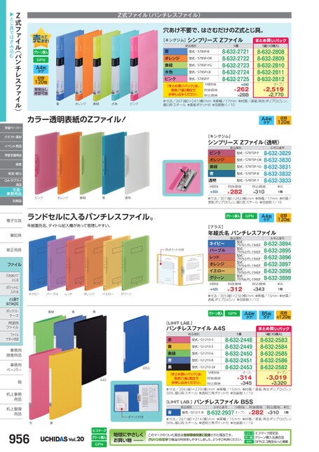 Z式ファイル(パンチレスファイル)穴あけ不要で、はさむだけのZ式とじ具。[キングジム]シンプリーズZファイルA4判タテ収容120枚背見出し差替可能商品種別型式/578SP-B型式/578SP-OR型式/578SP-YG型式/578SP-LB型式/578SP-P青オレンジ黄緑水色ピンク「まとめ買いパック」は、各色「1組」単位でお申し込みください。M価税抜税抜価格税込価格1冊8-632-27218-632-27228-632-27238-632-27248-632-2725¥290¥262¥288まとめ買いパック1組(10冊入)8-632-28088-632-28098-632-28108-632-28118-632-2812オープン¥2,519¥2,770青オレンジ黄緑水色ピンク●寸法/307(縦)×241横)mm●背幅/17mm●材質/表紙:再生ポリプロピレン、綴じ具:スチール●表紙ポケット付●包装数:1/10カラー透明表紙のZファイル!A4判タテ収容120枚Z式ファイル(パンチレスファイル)▶とじ具ではさみ込む学習ペーパークラフト・素材イベント用品学習支援用品保育安全・安心OA・サプライ用品文具・事務用品日用品電子文具電子文筆記具筆記具修正用具修正用ファイル穴をあけて穴をあけてとじるポケットにポケットに入れるとじ具ではさみ込むボックス・ボックス・ケース用途別用途別ファイルファイルサポート用品事務用事務接着用品接着用事務用事務用ペーパーペーパー鞄鞄机上事務机上事用品用品机上整理机上整用品用品ピンクオレンジ黄緑青透明M価税抜¥350[キングジム]シンプリーズZファイル(透明)商品種別型式/578TSP-P型式/578TSP-OR型式/578TSP-YG型式/578TSP-B型式/578TSP-Tお申込番号8-632-38298-632-38308-632-38318-632-38328-632-3833税抜価格¥282税込価格¥310単位1冊●寸法/307(縦)×242(横)mm●背幅/17mm●材質/表紙:ポリプロピレン、綴じ具:スチール●包装数:1/10A4判タテ収容120枚[プラス]年組氏名パンチレスファイル商品種別内ポケット付きネイビーパープルレッドオレンジイエローグリーンM価税抜¥420型式/79761/FL-194SF型式/79762/FL-194SF型式/79763/FL-194SF型式/79764/FL-194SF型式/79765/FL-194SF型式/79766/FL-194SFお申込番号8-632-38948-632-38958-632-38968-632-38978-632-38988-632-3899税抜価格¥312税込価格¥343単位1冊●寸法/305(縦)×230(横)mm●背幅/15mm●材質/表紙:ポリプロピレン●包装数:1/10A4判タテB5判タテ収容約120枚[LIHITLAB.]パンチレスファイルA4S商品種別型式/G1210-3型式/G1210-5型式/G1210-6型式/G1210-8赤黄黄緑青黒「まとめ買いパック」は、各色「1組」単位でお申し込みください。型式/G1210-24M価税抜税抜価格税込価格1冊8-632-24488-632-24498-632-24508-632-24518-632-2453オープン¥314¥345まとめ買いパック1組(10冊入)8-632-25838-632-25848-632-25858-632-25868-632-2582オープン¥3,019¥3,320●寸法/306(縦)×239(横)mm●背幅/15mm●材質/表紙:再生ポリプロピレン50%、綴じ具:スチール●透明三角ポケット付●包装数:1/10[LIHITLAB.]パンチレスファイルB5S商品種別お申込番号M価税抜型式/G1211-8青●寸法/267(縦)×214(横)mm●背幅/15mm●材質/表紙:再生ポリプロピレン50%、綴じ具:スチール●透明三角ポケット付●包装数:1/108-632-2937オープン税抜価格¥282税込価格¥310単位1冊ピンクオレンジ黄緑青透明ランドセルに入るパンチレスファイル。年組番氏名、タイトル記入欄があって管理しやすい。ネイビーパープルレッドオレンジイエローグリーン黄緑青黒B5SA4Sポケット付き赤黄956Vol.20地球にやさしくお買い物このマークのついた商品は地球環境保護に配慮された商品です。グリーンの文字で商品の判別をしやすくしました。どうぞご利用ください。エコマーク認定品グリーン購入法適合品GPNエコ商品ねっと掲載