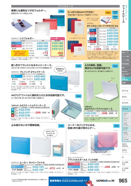 ◀ボックス・ケースファイルケース学習ペーパークラフト・素材イベント用品学習支援用品保育安全・安心OA・サプライ用品文具・事務用品日用品電子文具子筆記具筆記具修正用具正ファイル穴をあけて穴をあけてとじるポケットにポケットに入れるとじ具でとじ具ではさみ込むボックス・ケース用途別用途別ファイルファイルサポート用品事務用務接着用品着事務用務ペーパーペーパー鞄机上事務上用品品机上整理上用品用品取っ手がフラットになるキャリーケース。「抱える」取っ手を持つ」2Wayの使い方ができる新機能取っ手。[セキセイ]プレイング2ウェイケースブルーホワイト商品種別型式/AP-952-10型式/AP-952-70お申込番号8-632-40058-632-4006耐荷重5kgでもOK。A4判A3の資料、図面、賞状などを収納可能です。A3判取っ手付きなので、持ち運びにも便利です。取っ手M価税抜¥1,200税抜価格¥1,020税込価格¥1,122単位1冊●寸法/260(縦)×340(横)×40(幅)mm●シート厚/0.7mm●材質/本体:ポリプロピレン、取っ手:EVA樹脂●包装数:1/10ホワイトブルーA4クリアファイルに資料を入れたまま収納可能です。ロック部分が青、緑、赤の3色で分類にも最適です。A4判[和泉化成]A4ステーショナリーケース商品種別お申込番号M価税抜税抜価格税込価格単位3579B8-632-37063579G8-632-37078-632-3708青型式/緑型式/赤型式/●寸法/317(縦)×253横)×27(幅)mm●材質/ポリプロピレン●包装数:1/96オープン¥200¥2203579R1個[和泉化成]A3アクティブファイルケースお申込番号M価税抜8-632-3709オープン税抜価格¥546税込価格¥600単位1個赤緑青商品種別型式/4303C●寸法/433(縦)×347横)×35幅)mm●材質/ポリプロピレン●包装数:1/24止め具がないので簡単収納。A4判コーナーをバンドでとめる、収納・持ち運び用ホルダー。A4サイズのフォルダーも入ります。使用例ブルーA4判ピンクブルークリア(乳白色)[セキセイ]ムービーキャリーファイル商品種別お申込番号M価税抜税抜価格税込価格単位型式/MV-515F-10ブルークリア(乳白色)型式/●寸法/255(縦)×315(横)×15(幅)mm●シート厚/0.6mm●材質/ポリプロピレン●包装数:1/108-632-13538-632-1357¥373¥410MV-515F-90¥5001冊※マチ幅32mmクリヤー(乳白色)[ビュートンジャパン]フラットホルダーA4バンド付き商品種別お申込番号M価税抜税抜価格税込価格単位ピンクブルークリヤー(乳白色)●寸法/245(縦)×320横)×5〜32(幅)mm●シート厚/0.4mm●材質/ポリプロピレン●包装数:1/208-632-16328-632-16318-632-1630型式/NFH-A4-CP型式/NFH-A4-CB型式/NFH-A4-Cオープン¥206¥2261冊※カタログに掲載の商品情報(仕様・価格・税率など)は変更になる場合がございます。最新情報はUCHIDASww.uchidas.netwへ!Vol.20965携帯にも便利なフタ付フォルダー。差替式のタイトル見出し付き。ファイルケースA4判たっぷり30mmマチ付き!中身が透けて見えない不透明タイプです。背面クリアポケット付き。(タテ・ヨコ共通仕様)10枚入A4判タテA4判ヨコ[プラス]ポケット付エンベロープ(マチ付)タテ・ヨコ商品種別ブルーレッドホワイトブルーレッドホワイト型式/88271/FL-120CH型式/88272/FL-120CH型式/88273/FL-120CH型式/88571/FL-121CH型式/88572/FL-121CH型式/88573/FL-121CHお申込番号8-632-33478-632-33488-632-33498-632-42298-632-42308-632-4231M価税抜オープン税抜価格¥1,005税込価格¥1,105単位1袋(10枚入)●寸法/タテ:335(縦)×240(横)×30(幅)mm、ヨコ:255(縦)×320(横)×30(幅)mm●シート厚/0.2mm●材質/ポリプロピレン●包装数:1/10※コピー用紙や印刷物などは、よく乾燥させてから挿入してください。印刷物によっては、シートに波打ちや反りが発生する場合があります。タテヨコブルーレッドホワイトしっかり留まるプラホック付き。ブルーレッドクリアまとめ買いパック1組(5冊入)8-632-43688-632-43698-632-4370オープン[セキセイ]シスフォルダーブルーレッドクリア商品種別型式/SYF-151-10型式/SYF-151-20型式/SYF-151-901冊8-632-43058-632-43068-632-4307「まとめ買いパック」は、各色「1組」単位でお申し込みください。¥805¥885●寸法/240(縦)×316横)×2(幅)mm●厚み/0.2mm●材質/ポリプロピレン●適正収納枚数/100枚●包装数:1/5¥173¥190M価税抜税抜価格税込価格¥240ブルーレッドホワイト