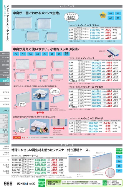 1枚単位1枚A5A4B5B4A4A5B5B6M価税抜¥900¥800¥650¥600税抜価格¥630¥560¥455¥420税込価格¥693¥616¥500¥462単位1枚お申込番号8-632-00728-632-17428-632-00718-632-0070商品種別355(横)×260(縦)×15厚)mm、型式/AZ-75E-10285(横)×225(縦)×15厚)mm、型式/AZ-65E-10250(横)×190(縦)×15厚)mm、型式/AZ-55E-10210(横)×170(縦)×15厚)mm、型式/AZ-50E-10A4B5A5B6●●●●[セキセイ]メッシュケースブルー210mm●材質/本体:オレフィン系シート、ファスナー:鉄●色/ブルー●包装数:1/10285mm170mm●225mm●250mm190mm●355mm260mm●メッシュケース中身が一目でわかるメッシュ生地。スポーツや遠足用の小物整理に。M価税抜税抜価格税込価格単位¥750¥568¥491¥416¥378¥325¥311¥315¥624¥540¥457¥415¥357¥342¥346¥650¥550¥500¥430¥400¥4501枚商品種別寸法/345(横)×260縦)×5厚)mm、型式/MMC-A4-B寸法/285(横)×225縦)×5厚)mm、型式/MMC-B5-B寸法/250(横)×190縦)×5厚)mm、型式/MMC-A5-B寸法/210(横)×170縦)×5厚)mm、型式/MMC-B6-B寸法/165(横)×130縦)×5厚)mm、型式/MMC-A6-B寸法/130(横)×90縦)×5厚)mm、型式/MMC-A7-B寸法/240(横)×115縦)×5厚)mm、型式/MMC-BB-Bお申込番号8-632-30708-632-40368-632-30698-632-30688-632-42328-632-42338-632-4037A4B5A5B6A6A7通帳・小切手サイズ●●●●●❿⓫●材質/オレフィン系シート●包装数:1/10[マグエックス]メッシュケース[マグエックス]メッシュケースマチあり●●●A3A4A5A6A7通帳・小切手サイズ商品種別寸法/470横)×340縦)×50(厚)mm、型式/MMCL-A3寸法/345横)×260縦)×30(厚)mm、型式/MMCL-A4寸法/250横)×190縦)×30(厚)mm、型式/MMCL-A5寸法/165横)×130縦)×30(厚)mm、型式/MMCL-A6寸法/130横)×90縦)×30厚)mm、型式/MMCL-A7寸法/240横)×115縦)×30(厚)mm、型式/MMCL-BB●材質/オレフィン系シート●包装数:1/10お申込番号M価税抜税抜価格税込価格単位8-632-3510¥1,280¥896¥880¥6168-632-3511¥680¥4768-632-3512¥520¥3648-632-4344¥460¥3228-632-4345¥620¥4288-632-4384¥985¥677¥523¥400¥354¥470[マグエックス]メッシュケースデカマチ商品種別●●A3A4A5A6寸法/470横)×340縦)×100(厚)mm、型式/MMCL-A3-D寸法/345横)×260縦)×80厚)mm、型式/MMCL-A4-D寸法/250横)×190縦)×60厚)mm、型式/MMCL-A5-D寸法/165横)×130縦)×60厚)mm、型式/MMCL-A6-Dお申込番号M価税抜税抜価格税込価格8-632-4091¥1,490¥1,043¥1,1478-632-4092¥7548-632-4093¥5778-632-4094¥454¥686¥525¥413¥980¥750¥590●材質/オレフィン系シート●包装数:1/10通帳サイズA3A4A5A6A7B5B6250mm240mm190mm●115mm●285mm225mm●345mm130mm90mm●165mm130mm●210mm260mm●170mm●L字型ファスナーで出し入れ簡単。れんらく袋にも最適です!マチありタイプ。●50mm●マチ通帳・小切手サイズ。●A3は50mmA4・A5・A6・A7・通帳・小切手サイズは30mm圧倒的な収納力!大きく開いて、厚みのある物も入ります。デカマチタイプ。●100mm●マチA3は100mmA4は80mmA5・A6は60mmLOOKP.917ペンサイズのメッシュケースを掲載しております。中身が見えて使いやすい。小物をスッキリ収納!使用例(A7)地球にやさしい再生材を使ったファスナー付き透明ケース。クリアケースマチなし見出しポケット付マチ付[LIHITLAB.]クリヤーケース税抜価格税込価格単位商品種別お申込番号型式/F-72S型式/F-73S型式/F-74SA5Sマチなし240(横)×180(縦)mm、A4Sマチなし335(横)×245(縦)mm、B5Sマチなし290(横)×215(縦)mm、B4Sマチなし395(横)×290(縦)mm、B5マチ付A4マチ付●収容枚数/コピー用紙100枚(マチ付はコピー用紙200枚)●見出しポケット付●材質/オレフィン(バイオマスポリエチレン含有)●包装数:1/25¥214¥235¥287¥315¥255¥280¥395¥434¥355¥390¥396¥4358-632-25088-632-00678-632-00688-632-25098-632-26928-632-2693型式/F-75S305(横)×220(縦)mm、型式/F-73SM350(横)×250(縦)mm、型式/F-74SMM価税抜¥320¥430¥390¥580¥540¥6001枚※仕様およびパッケージが変更となる場合がございます。見出しポケット付30mmのマチ付き。966Vol.20地球にやさしくお買い物このマークのついた商品は地球環境保護に配慮された商品です。グリーンの文字で商品の判別をしやすくしました。どうぞご利用ください。エコマーク認定品グリーン購入法適合品GPNエコ商品ねっと掲載メッシュケース・クリアケース▶ボックス・ケース学習ペーパークラフト・素材イベント用品学習支援用品保育安全・安心OA・サプライ用品文具・事務用品日用品電子文具電子文筆記具筆記具修正用具修正用ファイル穴をあけて穴をあけてとじるポケットにポケットに入れるとじ具でとじ具ではさみ込むボックス・ケース用途別用途別ファイルファイルサポート用品事務用事務接着用品接着用事務用事務用ペーパーペーパー鞄鞄机上事務机上事用品用品机上整理机上整用品用品