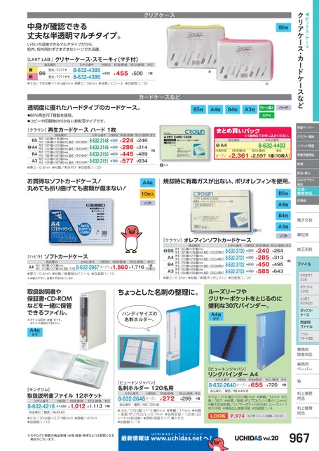 ◀ボックス・ケースクリアケース・カードケースなど学習ペーパークラフト・素材イベント用品学習支援用品保育安全・安心OA・サプライ用品文具・事務用品日用品電子文具子筆記具筆記具修正用具正1枚ファイル穴をあけて穴をあけてとじるポケットにポケットに入れるとじ具でとじ具ではさみ込むボックス・ケース用途別ファイルファイルサポート用品事務用務接着用品着事務用務ペーパーペーパーB5判A4判B4判A3判ソフト●B5取扱説明書や保証書・CD-ROMなどを一緒に保管できるファイル。※ポケットは固定(溶着)式です。ポケットの追加はできません。A4判タテ[キングジム]取扱説明書ファイル12ポケットお申込番号8-632-4216M価税抜¥1,350税抜価格税込価格単位¥1,012¥1,1131冊商品種別型式/2633-LG●寸法/304(縦)×237(横)mm●背幅/47mm●包装数:1/10[ビュートンジャパン]名刺ホルダー120名用お申込番号M価税抜8-632-2648オープン税抜価格¥272税込価格¥299単位1冊商品種別型式/INC-120-SB●寸法/192縦)×115(横)mm●背幅/17mm●材質/表紙:ポリプロピレン0.7mm●名刺収容/120枚(20シート×6枚収納)●透明・両面タイプ、横入れ式●包装数:1/10[ビュートンジャパン]リングバインダーA4お申込番号M価税抜税抜価格8-632-2640オープン¥655税込価格¥720単位1冊鞄商品種別型式/RB-A4W-B●寸法/316(縦)×255(横)mm●背幅/32mm●穴数/30穴●材質/表紙:ポリプロピレン(厚さ1.2mm)●最大収容枚数/クリヤーポケット約45枚、ルーズリーフ約100枚●背見出し差替可能●包装数:1/4LOOKP.97430穴用リフィールを掲載しております。机上事務上用品品机上整理上用品用品へ!Vol.20967※カタログに掲載の商品情報(仕様・価格・税率など)は変更になる場合がございます。最新情報はUCHIDASww.uchidas.netw中身が確認できる丈夫な半透明マルチタイプ。いろいろ収納できるマルチタイプだから、校内、校外問わずさまざまなシーンで大活躍。クリアケースB6判[LIHITLAB.]クリヤーケース・スモーキィ(マチ付)商品種別お申込番号M価税抜税抜価格税込価格単位B6型式/F271キ黄桃●寸法/190(横)×145(縦)mm●厚さ/30mm●材質/ビニール●包装数:1/258-632-43858-632-4386¥455型式/F271モモ¥500¥6001枚透明度に優れたハードタイプのカードケース。カードケースなど●80%再生PET樹脂を使用。●コピーや印刷物の付かない非転写タイプです。[クラウン]再生カードケースハード1枚商品種別お申込番号M価税抜税抜価格税込価格単位¥320●B5A4B4A3内寸/262(横)×186(縦)mm、外寸/268(横)×190(縦)mm、型式/CR-CHB5R-T内寸/307(横)×216(縦)mm、8-632-2148外寸/312(横)×220(縦)mm、型式/CR-CHA4R-T8-632-21498-632-2150外寸/435(横)×307(縦)mm、型式/CR-CHA3R-T8-632-2151内寸/372(横)×263(縦)mm、外寸/380(横)×267(縦)mm、型式/CR-CHB4R-T内寸/425(横)×302(縦)mm、¥380¥600¥780¥224¥246¥286¥314¥445¥489¥577¥6341枚●A4●厚さ/0.4mm●材質/再生PET●包装数:1/20お買得なソフトカードケース!丸めても折り曲げても書類が傷まない!A4判10枚入ソフト黄桃B5判A4判B4判A3判ハードまとめ買いパック商品種別※1組単位申込。お申込番号8-632-4403税抜価格税込価格¥2,361¥2,597単位1組(10枚入)A4●M価税抜オープン焼却時に有毒ガスが出ない、ポリオレフィンを使用。[ハピラ]ソフトカードケース商品種別お申込番号M価税抜税抜価格税込価格内寸/302(横)×213(縦)mm、外寸/312(横)×217(縦)mm、型式/F2508-632-2967オープン¥1,560¥1,716A4●厚さ/0.4mm●材質/軟質塩化ビニール●包装数:1/10※中紙のデザイン変更が予定されています。単位1組(10枚入)[クラウン]オレフィンソフトカードケース商品種別❷B5A4B4A3内寸/263(横)×187(縦)mm、外寸/267(横)×189(縦)mm、型式/CR-SCB5RN-T内寸/306(横)×217(縦)mm、外寸/310(横)×219(縦)mm、型式/CR-SCA4RN-T内寸/373(横)×262(縦)mm、外寸/377(横)×264(縦)mm、型式/CR-SCB4RN-T内寸/432(横)×303(縦)mm、外寸/436(横)×305(縦)mm、型式/CR-SCA3RN-Tお申込番号8-632-37008-632-37018-632-37028-632-3703M価税抜税抜価格税込価格単位¥320¥240¥285¥450¥585¥264¥313¥495¥643¥380¥600¥780●厚さ/0.3mm●材質/軟質ポリオレフィン●包装数:1/20ちょっとした名刺の整理に。ハンディサイズの名刺ホルダー。ルーズリーフやクリヤーポケットをとじるのに便利な30穴バインダー。A4判タテ