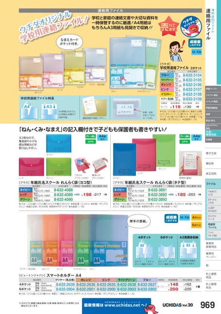 ◀用途別ファイル連絡用ファイル学習ペーパークラフト・素材イベント用品学習支援用品保育安全・安心OA・サプライ用品文具・事務用品日用品電子文具子筆記具筆記具修正用具正ファイル穴をあけて穴をあけてとじるポケットにポケットに入れるとじ具でとじ具ではさみ込むボックス・ボックス・ケースス用途別ファイルファイルサポート用品事務用務接着用品着事務用務ペーパーペーパー鞄机上事務上用品品机上整理上用品用品レッドグリーンフタにはプラホック付き!裏面にはポケット付き!ネイビー[プラス]年組氏名スクールれんらく袋(ヨコ型)M価税抜お申込番号商品種別型式/79831/FL-198SF型式/79833/FL-198SF型式/79836/FL-198SFネイビーレッドグリーン●寸法/230縦)×314(横)mm(マチ最大30mm)●表紙厚/0.3mm●材質/ポリプロピレン●適正収容/約300枚●透明外ポケット付●包装数:1/808-632-40888-632-40898-632-4090¥198¥217税抜価格税込価格¥300単位1冊[プラス]年組氏名スクールれんらく袋(タテ型)M価税抜お申込番号商品種別型式/79741/FL-192SF型式/79743/FL-192SF型式/79746/FL-192SFネイビーレッドグリーン●寸法/305(縦)×223(横)mm(マチ最大10mm)●表紙厚/0.25mm●材質/ポリプロピレン●適正収容/約90枚●透明外ポケット付●包装数:1/808-632-38918-632-38928-632-3893¥185¥203税込価格税抜価格¥280単位1冊グリーンレッド使用例(裏面)厚手の表紙。成績表におすすめA4/A3判4ポケット6ポケット4ポケット6ポケットA3見開き収納クリヤー(乳白色)オレンジピンクライトグリーンブルーポケットポケットポケット(裏面にもあり)ポケットポケットポケット(裏面にもあり)A3用紙も見開きで収容できます。[ビュートンジャパン]スマートホルダーA4商品種別オレンジピンク4ポケット6ポケット●寸法/312(縦)×235(横)mm●厚さ/表紙:0.4mm、中ポケット:0.15mm●材質/ポリプロピレン●包装数:1/20背幅/2mm、型式/NSH-A4-4C背幅/3mm、型式/NSH-A4-6C8-632-26368-632-29018-632-26358-632-2900クリヤー(乳白色)8-632-26398-632-2904ライトグリーン8-632-26388-632-2903ブルーM価税抜8-632-2637オープン8-632-2902税抜価格¥148¥200税込価格¥162¥220単位1冊※カタログに掲載の商品情報(仕様・価格・税率など)は変更になる場合がございます。最新情報はUCHIDASww.uchidas.netwへ!Vol.20969オオリジリ絡連ダダ用チ校ウウ学ナルナルファイル!連絡用ファイル学校と家庭の連絡文書や大切な資料を一時保管するのに最適!A4用紙はもちろんA3用紙も見開きで収納!!なまえカードポケット付き。成績表におすすめA4/A3判オレンジピンク学校用連絡ファイル特長クリアー(乳白色)イエローブルーライトグリーンA4用紙はもちろんA3用紙も見開きで収納可能。連絡用紙が収納しやすい。年組、名前が記入できるカード付き。[ウチダ]学校用連絡ファイル2ポケット商品種別ブルーライトグリーンオレンジピンクイエロークリアー(乳白色)型式/型式/URF-2B型式/URF-2LG型式/URF-2OR型式/URF-2P型式/URF-2YURF-2C税抜価格お申込番号8-632-31048-632-31058-632-31068-632-31078-632-31088-632-3109単位1冊¥119税込価格¥130M価税抜オープン●寸法/310縦)×220(横)mm、表紙:0.4(厚)mm、ポケット:0.15(厚)mm、ネームカードサイズ:40(縦)×63(横)mm●質量/72g●材質/ポリプロピレン●包装数:1/20「ねん・くみ・なまえ」の記入欄付きで子どもも保護者も書きやすい!A4判ヨコA4判タテヨコ型なので、集金袋や小さな提出用紙などが取り出しやすい。ネイビー
