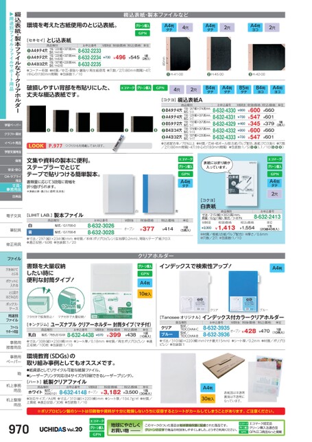 ●H-41-00●H-45-00●H-42-004穴2穴B4判タテA4判タテB5判タテB4判ヨコA4判ヨコ46mm[コクヨ]綴込表紙AM価税抜税抜価格税込価格単位¥730¥496¥5451組(2枚入)●●コーナー布張●材質/中芯・表貼り・裏貼り:再生紙使用●穴数/2穴(80mm間隔)・4穴(中心の穴80mm間隔)●包装数:1/10お申込番号8-632-22338-632-22348-632-2235商品種別寸法/220幅)×307(高)mm、型式/H-41-00寸法/220幅)×307(高)mm、型式/H-45-00寸法/307幅)×220(高)mm、型式/H-42-00A4タテ4穴A4タテ2穴A4ヨコ2穴●●[セキセイ]とじ込表紙破損しやすい背部を布貼りにした、丈夫な綴込表紙です。商品種別B4タテ4穴A4タテ4穴B5タテ2穴B4ヨコ4穴A4ヨコ2穴寸法/267幅)×374(高)mm、型式/ツ-3寸法/220幅)×307(高)mm、型式/ツ-7寸法/192幅)×267(高)mm、型式/ツ-1寸法/374幅)×267(高)mm、型式/ツ-13寸法/307幅)×220(高)mm、型式/ツ-17お申込番号8-632-43308-632-43318-632-43298-632-43328-632-4333¥730M価税抜税抜価格税込価格¥660¥800¥601¥379¥660¥601¥600¥547¥345¥600¥547¥460¥800¥730単位1組(2枚入)❹❻❺❼❽❹❺❻❼❽P.977つづりひもを掲載しております。●古紙配合率/70%以上●材質/芯材・枕ボール部:古紙パルプ配合、表紙:クロス貼り●穴数/2穴(80mm間隔)4穴(中心の穴80mm間隔)●包装数:1/5(❹❼)、1/10(❺❻❽)文集や資料の製本に便利。ステープラーでとじてテープで貼りつける簡単製本。書類量に応じて3段階に背幅を折り曲げられます。※表紙は表・裏ともに透明(乳白色)[LIHITLAB.]製本ファイル商品種別お申込番号M価税抜税抜価格税込価格型式/G1700-0白青●寸法/297縦)×234(横)mm●材質/本体:ポリプロピレン(生地厚0.2mm)、背貼りテープ:紙クロス●適正収容/60枚●包装数:1/208-632-30268-632-3028¥377型式/G1700-8¥414オープン白青A4判タテ単位1袋(5冊入)表紙には折り線が入っています。A4判タテ2穴お申込番号8-632-2413[コクヨ]白表紙商品種別寸法/215(幅)×302高)mm、質量/62g1組)、型式/ツ-87NM価税抜¥2,360¥1,413税抜価格税込価格¥1,554単位1包(20組40枚入)●材質/板紙(古紙パルプ配合)●厚さ/0.6mm●穴数/2穴●包装数:1/10環境を考えた古紙使用のとじ込表紙。A4判タテ4穴A4判タテ2穴A4判ヨコ2穴綴込表紙・製本ファイルなど[キングジム]ユーズナブルクリアーホルダー封筒タイプ(マチ付)お申込番号税抜価格商品種別型式/785US10-M乳白(10枚入)●寸法/308(縦)×230(横)mm●シート厚/0.18mm●材質/再生ポリプロピレン●適正収納/100枚●包装数:1/108-632-4438¥399税込価格¥438単位1袋M価税抜¥570環境教育(SDGs)の取り組み事例としてもオススメです。●紙資源としてリサイクル可能な紙製ファイル。●レーザープリンタ対応(B4サイズが印刷できるレーザープリンタ)。[ハート]紙製クリアファイル商品種別お申込番号M価税抜税抜価格型式/XW0101ホワイト(30枚入)●対応サイズ/A4用●寸法/310縦)×220(横)mm●シート厚/104.7g/㎡●材質/上質紙●適正収容/30枚●包装数:1/108-632-4148オープン¥3,182税込価格¥3,500単位1箱[Tanoseeオリジナル]インデックス付カラークリアホルダー商品種別お申込番号M価税抜税抜価格税込価格単位型式/TIDCCHA4-C型式/TIDCCHA4-Bクリアブルー●寸法/310(縦)×220(横)mm(マチ最大15mm)●シート厚/0.2mm●材質/ポリプロピレン●包装数:18-632-3935オープン¥4288-632-3936¥470(10冊入)1袋A4判30枚入表紙面は半透明裏面は不透明になっています。※ポリプロピレン製のシートは印刷物や資料が十分に乾燥しないうちに収容するとシートがカールしてしまうことがあります。ご注意ください。970Vol.20地球にやさしくお買い物このマークのついた商品は地球環境保護に配慮された商品です。グリーンの文字で商品の判別をしやすくしました。どうぞご利用ください。エコマーク認定品グリーン購入法適合品GPNエコ商品ねっと掲載書類を大量収納したい時に便利な封筒タイプ!フタ付きで脱落防止!マチ付きで大量収納!クリアホルダーインデックスで検索性アップ!A4判A4判10枚入クリアブルー綴込表紙・製本ファイルなど・クリアホルダー▶用途別ファイル・ファイルサポート用品学習ペーパークラフト・素材イベント用品学習支援用品保育安全・安心OA・サプライ用品文具・事務用品日用品電子文具電子文筆記具筆記具修正用具修正用ファイル穴をあけて穴をあけてとじるポケットにポケットに入れるとじ具でとじ具ではさみ込むボックス・ボックス・ケース用途別ファイルファイルサポート用品事務用事務接着用品接着用事務用事務用ペーパーペーパー鞄鞄机上事務机上事用品用品机上整理机上整用品用品