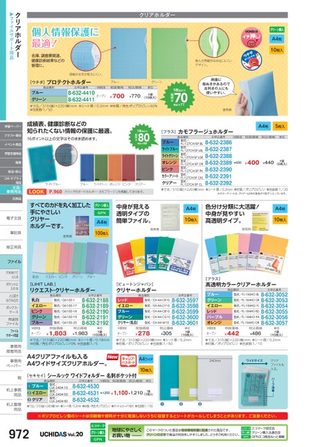 A4判10枚入A4判5枚入挟んだ用紙がはみ出しにくいデザイン。両面に指ぬきがあるので左利きの人にも使いやすい。使用例個人情報保護に最適!名簿、調査票関連、健康診断結果などの管理に。用紙の文字が見えにくい。[ウチダ]プロテクトホルダークリアホルダーグリーンブルー税抜価格1枚あたり70税込¥77税抜¥商品種別お申込番号M価税抜税込価格単位ブルーグリーン●寸法/310(縦)×220(横)mm●シート厚/0.2mm●材質/再生ポリプロピレン40%●包装数:1/508-632-4410オープン8-632-4411¥700(10枚入)¥7701袋クリアホルダー▶ファイルサポート用品学習ペーパークラフト・素材イベント用品学習支援用品保育安全・安心OA・サプライ用品文具・事務用品日用品電子文具電子文筆記具筆記具修正用具修正用ファイル穴をあけて穴をあけてとじるポケットにポケットに入れるとじ具でとじ具ではさみ込むボックス・ボックス・ケース用途別用途別ファイルファイルサポート用品事務用事務接着用品接着用事務用事務用ペーパーペーパー鞄鞄机上事務机上事用品用品机上整理机上整用品用品[プラス]カモフラージュホルダー単位M価税抜税込価格税抜価格お申込番号商品種別型式/FL-127CH-5PBL型式/FL-127CH-5PLBL型式/FL-127CH-5PLGR型式/FL-127CH-5POR型式/FL-127CH-5PPK型式/FL-127CH-5PCAS型式/FL-127CH-5PCLブルーライトブルーライトグリーンオレンジピンクカラーアソートクリアー●寸法/310(縦)×220(横)mm●シート厚/0.2mm●材質/ポリプロピレン●包装数:1/20※カラーアソートは、クリアー以外の各色が1枚ずつ入っています。8-632-23868-632-23878-632-23888-632-23898-632-23908-632-23918-632-2392¥400¥440¥6301袋(5枚入)A4判10枚入色分け分類に大活躍!中身が見やすい高透明タイプ。A4判10枚入使用例1枚あたり80税込¥88税抜¥成績表、健康診断などの知られたくない情報の保護に最適。16ポイント以上の文字はそのまま読めます。ライトブルーP.960ブルーライトグリーンオレンジピンククリアークリップ付ボードホルダー・カモフラージュを掲載しております。すべてのカドを丸く加工した手にやさしいクリヤーホルダーです。使用例A4判100枚入中身が見える透明タイプの簡単ファイル。使用例乳白イエローピンクグリーンブルー[LIHITLAB.]リクエスト・クリヤーホルダー乳白イエローピンクグリーンブルー商品種別型式/G6100-1型式/G6100-17型式/G6100-18型式/G6100-19型式/G6100-20お申込番号8-632-21888-632-21898-632-21908-632-21918-632-2192[ビュートンジャパン]クリヤーホルダー商品種別レッドイエローブルーグリーンクリヤー(乳白)型式/CH-A4-CR10型式/CH-A4-CY10型式/CH-A4-CB10型式/CH-A4-CG10型式/CH-A4-W10お申込番号8-632-35978-632-35988-632-35998-632-36008-632-3601[プラス]高透明カラークリアーホルダーブルーグリーンイエローレッドパープルオレンジ商品種別型式/FL-184HOBL型式/FL-184HOGR型式/FL-184HOYL型式/FL-184HORD型式/FL-184HOPA型式/FL-184HOORお申込番号8-632-30528-632-30538-632-30548-632-30558-632-30568-632-3057税抜価格¥1,803M価税抜オープン(100枚入)●寸法/310縦)×220(横)mm●シート厚/0.18mm●材質/再生ポリプロピレン70%●包装数:1/5税込価格¥1,983単位1袋税抜価格¥278M価税抜オープン(10枚入)●寸法/310(縦)×220(横)mm●シート厚/0.2mm●材質/ポリプロピレン●包装数:1/60税込価格¥305単位1袋税抜価格¥442M価税抜オープン(10枚入)●寸法/310縦)×220横)mm●シート厚/0.2mm●材質/ポリプロピレン●包装数:1/10税込価格¥486単位1袋クリアファイルも入る。ハーフ溶着A4ワイド10枚入240mmワイドサイズ●●●M価税抜税抜価格税込価格単位¥1,200¥1,100¥1,2101袋(10枚入)お申込番号8-632-45308-632-45318-632-4532商品種別型式/CLK-2404-10型式/CLK-2404-50型式/CLK-2404-90ブルーイエロークリア●●●●寸法/310(縦)×240横)mm●シート厚/0.2mm●材質/再生ポリプロピレン●タイトルカード1枚付●包装数:1/100A4クリアファイルも入るA4ワイドサイズクリアホルダー。キャリア・パスポート[セキセイ]シールックワイドフォルダー名刺ポケット付※ポリプロピレン製のシートは印刷物や資料が十分に乾燥しないうちに収容するとシートがカールしてしまうことがあります。ご注意ください。972Vol.20地球にやさしくお買い物このマークのついた商品は地球環境保護に配慮された商品です。グリーンの文字で商品の判別をしやすくしました。どうぞご利用ください。エコマーク認定品グリーン購入法適合品GPNエコ商品ねっと掲載