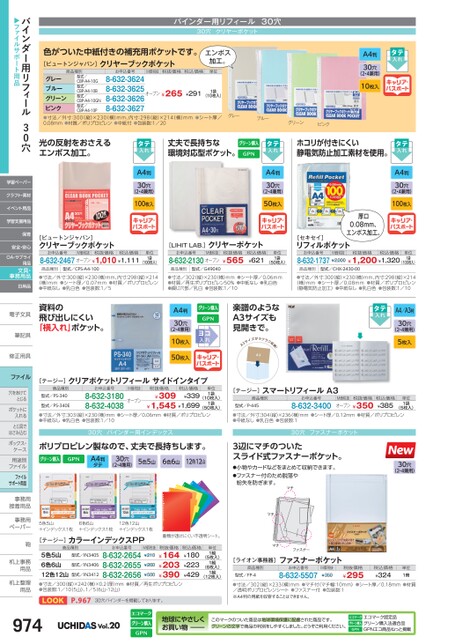 バインダー用リフィール30穴30穴クリヤーポケット色がついた中紙付きの補充用ポケットです。[ビュートンジャパン]クリヤーブックポケットエンボス加工。商品種別お申込番号M価税抜税抜価格税込価格単位型式/CBP-A4-10G型式/CBP-A4-10B型式/CBP-A4-10GN型式/CBP-A4-10Pグレーブルーグリーンピンク●寸法/外寸:300(縦)×230(横)mm、内寸:298(縦)×214(横)mm●シート厚/0.08mm●材質/ポリプロピレン●中紙付●包装数:1/208-632-36248-632-36258-632-36268-632-3627オープン¥265¥291(10枚入)1袋グレーブルーグリーンピンクタテ入れA4判30穴(2・4兼用)10枚入キャリア・パスポート[ビュートンジャパン]クリヤーブックポケットお申込番号M価税抜税抜価格税込価格8-632-2467オープン¥1,010¥1,111商品種別型式/CPS-A4-100単位1袋(100枚入)[LIHITLAB.]クリヤーポケットお申込番号M価税抜8-632-2130オープン商品種別型式/G49040税抜価格¥565税込価格¥621単位1袋(50枚入)お申込番号M価税抜税抜価格税込価格8-632-1737¥2,000¥1,200¥1,320単位1袋(100枚入)商品種別型式/CHX-2430-00[セキセイ]リフィルポケット●寸法/外寸:300縦)×230横)mm、内寸:298(縦)×214(横)mm●シート厚/0.07mm●材質/ポリプロピレン●中紙なし●乳白色●包装数:1/5●寸法/302(縦)×230(横)mm●シート厚/0.06mm●材質/再生ポリプロピレン50%●中紙なし●乳白色●綴じ穴部/乳白●包装数:1/10●寸法/外寸:300(縦)×230(横)mm、内寸:298縦)×214(横)mm●シート厚/0.08mm●材質/ポリプロピレン(静電気防止加工)●中紙なし●乳白色●包装数:1/10タテ入れA4/A3判30穴(2・4兼用)5枚入楽譜のようなA3サイズも見開きで。キャリア・パスポートコれヨ入A4判30穴(2・4兼用)10枚入50枚入資料の飛び出しにくい「横入れ」ポケット。[テージー]クリアポケットリフィールサイドインタイプ商品種別型式/PS-340型式/PS-340Eお申込番号8-632-31808-632-4038M価税抜オープン税抜価格¥309税込価格¥339¥1,545¥1,699単位1袋1袋(10枚入)(50枚入)[テージー]スマートリフィールA3商品種別型式/P-445お申込番号8-632-3400M価税抜税抜価格オープン¥350税込価格¥385単位1袋(5枚入)●寸法/外寸:303縦)×230横)mm●シート厚/0.06mm●材質/ポリプロピレン●中紙なし●乳白色●包装数:1/10●寸法/外寸:304縦)×236横)mm●シート厚/0.12mm●材質/ポリプロピレン●中紙なし●乳白色●包装数:130穴バインダー用インデックス30穴ファスナーポケットポリプロピレン製なので、丈夫で長持ちします。A4判タテ30穴(2・4兼用)5色5山6色6山12色12山5色5山+インデックス1枚6色6山+インデックス1枚12色12山+インデックス1枚[テージー]カラーインデックスPP書類が透けにくい不透明シート。商品種別お申込番号税抜価格型式/IN3406型式/IN34055色5山6色6山12色12山●寸法/300(縦)×242(横)×0.2厚)mm●材質/再生ポリプロピレン●包装数:1/105山)、1/5(6山・12山)8-632-26548-632-26558-632-2656¥164¥203¥390型式/IN3412¥260¥500M価税抜¥210税込価格¥180¥223¥429単位1組1組1組(5枚入)(6枚入)(12枚入)LOOKP.96730穴バインダーを掲載しております。3辺にマチのついたスライド式ファスナーポケット。●小物やカードなどをまとめて収納できます。●ファスナー付のため脱落や紛失を防ぎます。マチマチマチファスナー[ライオン事務器]商品種別型式/FP-4ファスナーポケットお申込番号8-632-5507M価税抜¥350税抜価格¥29530穴(2・4兼用)税込価格¥324単位1冊●寸法/302(縦)×233(横)mm●マチ付(マチ幅:10mm)●シート厚/0.18mm●材質/透明ポリプロピレンシート●ファスナー付●包装数:1※A4判の用紙を収容することはできません。974Vol.20地球にやさしくお買い物このマークのついた商品は地球環境保護に配慮された商品です。グリーンの文字で商品の判別をしやすくしました。どうぞご利用ください。エコマーク認定品グリーン購入法適合品GPNエコ商品ねっと掲載光の反射をおさえるエンボス加工。丈夫で長持ちな環境対応型ポケット。タテ入れA4判30穴(2・4兼用)100枚入キャリア・パスポートタテ入れA4判30穴(2・4兼用)50枚入キャリア・パスポートホコリが付きにくい静電気防止加工素材を使用。タテ入れA4判30穴(2・4兼用)100枚入キャリア・パスポート厚口0.08mm、エンボス加工。バインダー用リフィール30穴▶ファイルサポート用品学習ペーパークラフト・素材イベント用品学習支援用品保育安全・安心OA・サプライ用品文具・事務用品日用品電子文具電子文筆記具筆記具修正用具修正用ファイル穴をあけて穴をあけてとじるポケットにポケットに入れるとじ具でとじ具ではさみ込むボックス・ボックス・ケース用途別用途別ファイルファイルサポート用品事務用事務接着用品接着用事務用事務用ペーパーペーパー鞄鞄机上事務机上事用品用品机上整理机上整用品用品