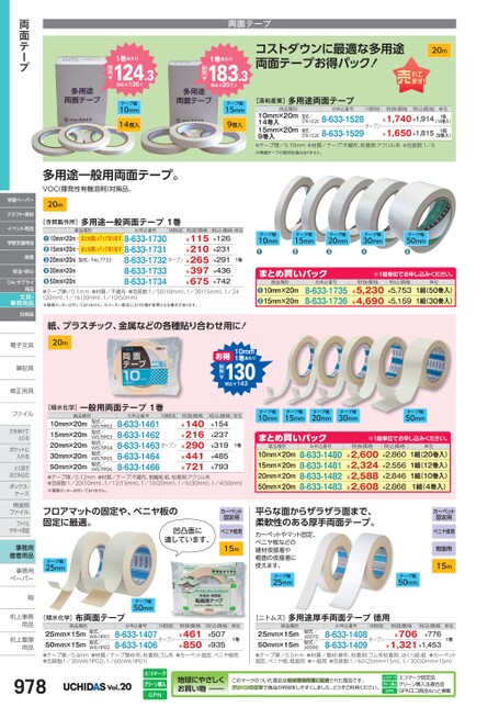 両面テープコストダウンに最適な多用途両面テープお得パック!20m[清和産業]多用途両面テープ商品種別お申込番号M価税抜税抜価格税込価格10mm×20m14巻入15mm×20m9巻入●テープ厚/0.10mm●材質/テープ:不織布、粘着剤:アクリル系●包装数:1/6※両面テープの個別包装はありません。¥1,740¥1,914¥1,650¥1,8158-633-15288-633-1529型式/STR-1020型式/STR-1520オープン単位1箱(14巻入)1箱(9巻入)1巻あたり183.3税込¥201.7税抜¥1巻あたり124.3税込¥136.7税抜¥テープ幅10mm14巻入テープ幅15mm9巻入多用途一般用両面テープ。VOC(揮発性有機溶剤)対策品。20m※1組単位申込。税抜価格¥5,230¥4,690税込価格¥5,753¥5,159単位1組(50巻入)1組(30巻入)お申込番号8-633-17358-633-1736商品種別10mm×20m15mm×20m❷❶❷●まとめ買いパックテープ幅10mm●テープ幅15mm●テープ幅20mm●テープ幅30mm●テープ幅50mm●M価税抜オープンお申込番号8-633-17308-633-17318-633-17328-633-17338-633-1734税抜価格¥115¥210¥265¥397¥675税込価格単位¥126¥231¥291¥436¥7421巻商品種別まとめ買いパックありますまとめ買いパックあります型式/No.773310mm×20m15mm×20m20mm×20m30mm×20m50mm×20m●●●●●[寺岡製作所]多用途一般両面テープ1巻●テープ厚/0.1mm●材質/不織布●包装数:1/5010mm)、1/3015mm)、1/24(20mm)、1/16(30mm)、1/1050mm)※簡易カッターは付いておりません。※メーカー都合により仕様が変更となる場合があります。紙、プラスチック、金属などの各種貼り合わせ用に!両面テープ学習ペーパークラフト・素材イベント用品学習支援用品保育安全・安心OA・サプライ用品文具・事務用品日用品10mm1巻あたり130税込¥143税抜¥お得電子文具電子文20m筆記具筆記具修正用具修正用ファイルファイル穴をあけて穴をあけてとじるポケットにポケットに入れるとじ具でとじ具ではさみ込むボックス・ボックス・ケース用途別用途別ファイルファイルサポート用品事務用接着用品事務用事務用ペーパーペーパー鞄鞄机上事務机上事用品用品机上整理机上整用品用品[積水化学]一般用両面テープ1巻単位M価税抜商品種別税抜価格お申込番号型式/W57IP02型式/W57IP03型式/W57IP04型式/W57IP05型式/W57IP0610mm×20m15mm×20m20mm×20m30mm×20m50mm×20m●テープ厚/0.12mm●材質/テープ:不織布、剥離紙:紙、粘着剤:アクリル系●包装数:1/20(10mm)、1/12(15mm)、1/10(20mm)、1/6(30mm)、1/4(50mm)※簡易カッターは付いておりません。8-633-14618-633-14628-633-14638-633-14648-633-1466¥140¥216¥290¥441¥721税込価格¥154¥237¥319¥485¥793オープン1巻テープ幅10mmテープ幅15mmテープ幅20mmテープ幅30mmテープ幅50mm商品種別お申込番号まとめ買いパック10mm×20m15mm×20m20mm×20m50mm×20m8-633-14808-633-14818-633-14828-633-1483※1組単位申込。税抜価格¥2,600¥2,324¥2,588¥2,608税込価格¥2,860¥2,556¥2,846¥2,868単位1組(20巻入)1組(12巻入)1組(10巻入)1組(4巻入)フロアマットの固定や、ベニヤ板の固定に最適。凹凸面に適しています。テープ幅25mmカーペット固定用ベニヤ板用15m平らな面からザラザラ面まで、柔軟性のある厚手両面テープ。カーペットやマット固定、ベニヤ板などの建材仮接着や粗面の仮接着に使えます。テープ幅25mmカーペット固定用ベニヤ板用粗面用15mテープ幅50mmテープ幅50mm[積水化学]布両面テープ商品種別お申込番号M価税抜税抜価格単位25mm×15m50mm×15m●テープ厚/0.4mm●材質/テープ基材:布、粘着剤:ゴム系●カーペット固定、ベニヤ板用●包装数:1/30(W61IP02)、1/60(W61IP01)8-633-1407オープン8-633-1406型式/W61IP01型式/W61IP02¥461¥8501巻税込価格¥507¥935[ニトムズ]多用途厚手両面テープ徳用商品種別お申込番号25mm×15m50mm×15m●テープ厚/0.5mm●材質/基材:綿布、粘着剤:ゴム系粘着剤、はくり紙:紙●カーペット固定、ベニヤ板、粗面用●一般用●包装数:1/60(25mm×15m)、1/3050mm×15m)8-633-1408オープン8-633-1409税込価格¥776¥1,321¥1,453型式/J0070型式/J0090¥706税抜価格M価税抜単位1巻978Vol.20地球にやさしくお買い物このマークのついた商品は地球環境保護に配慮された商品です。グリーンの文字で商品の判別をしやすくしました。どうぞご利用ください。エコマーク認定品グリーン購入法適合品GPNエコ商品ねっと掲載
