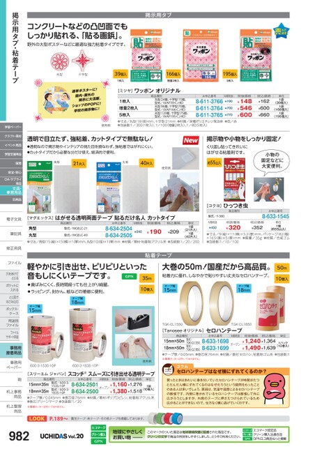 コンクリートなどの凸凹面でもしっかり貼れる、「貼る画鋲」。野外の大型ポスターなどに最適な強力粘着タイプです。掲示用タブ丸型十字型39個入1枚入166個入増量2枚入195個入5枚入[ミツヤ]ワッポンオリジナル商品種別1枚入増量2枚入5枚入●寸法/丸型:18(径)mm、十字型:21mm●材質/架橋ポリエチレン発泡体●色/赤●包装数:1/300(1枚入)、1/100(増量2枚入)、1/805枚入)丸型:24個、十字型:15個、型式/WAP39-CJ-RD丸型:96個、十字型:70個、型式/WAP166-CJ-RD丸型:120個、十字型:75個、型式/WAP195-CJ-RD8-611-37668-611-37648-611-3765¥700¥770お申込番号M価税抜¥190税抜価格¥148¥546¥600税込価格¥162¥600¥660単位1袋1袋1袋(39個入)(166個入)(195個入)使用例透明で目立たず、強粘着、カットタイプで無駄なし!●透明なので掲示物やインテリアの見た目を損なわず、強粘着ではがれにくい。●カットタイプだから必要な分だけ使え、経済的で便利。掲示物や小物をしっかり固定!くり返し貼ってきれいにはがせる粘着剤です。小物の固定などに大変便利。角型21片入丸型40片入使用例約55山入[コクヨ]ひっつき虫商品種別[マグエックス]はがせる透明両面テープ貼るだけ名人カットタイプ商品種別お申込番号M価税抜税抜価格税込価格角型丸型(40片入)●寸法/角型:15(縦)×15横)×1(厚)mm、丸型:10径)×1(厚)mm●材質/基材・粘着剤:アクリル系●包装数:1/20/2008-634-25048-634-2505¥190型式/MGELC-21型式/MGELC-40(21片入)¥209¥2401袋単位1袋粘着テープお申込番号8-633-1545型式/タ-380M価税抜¥450税抜価格¥320税込価格¥352単位1個(約55山入)●寸法/9(縦)×11(横)×3.2(厚)mm、パッケージ:82(幅)×165(奥)×5(厚)mm●質量/35g●材質/合成ゴム●包装数:1/10/100軽やかに引き出せ、ピリピリといった音もしにくいテープです。35m大巻の50m!国産だから高品質。粘着力に優れ、しなやかで貼りやすい丈夫なセロハンテープ。50m10巻入●黄ばみにくく、長時間経っても仕上がり綺麗。●ラッピング、封かん、紙などの補修に便利。10巻入テープ幅15mmテープ幅18mmテープ幅18mmテープ幅15mm600-3-1535-10P600-3-1835-10P使用例[スリーエムジャパン]スコッチ®スムーズに引き出せる透明テープ商品種別お申込番号M価税抜税抜価格税込価格単位型式/600-3-1535-10P型式/600-3-1835-10P8-634-2501オープン¥1,160¥1,276¥1,380¥1,5188-634-250015mm×35m18mm×35m●テープ厚/0.045mm●巻芯径:76mm●材質/基材:ポリプロピレン、粘着剤:アクリル系●巻芯:グリーンマーク●包装数:1/20※簡易カッターは付いておりません。1袋(10巻入)TGK-CL1550TGK-CL1850商品種別[Tanoseeオリジナル]セロハンテープ8-633-1698オープン8-633-169915mm×50m18mm×50m●テープ厚/0.05mm●巻芯径:76mm●材質/基材:セロハン、粘着剤:ゴム系●包装数:1※簡易カッターは付いておりません。¥1,240¥1,364¥1,490¥1,639型式/TGK-CL1550型式/TGK-CL1850お申込番号税抜価格税込価格1パックM価税抜(10巻入)単位セロハンテープはなぜ横にずれてくるのか?買ったときはきれいに巻き付いていたセロハンテープが時間がたつとだんだん横にずれてくるのはなぜだろうという疑問をもったことのある人は多いでしょう。原因は、気温や湿度によるセロハンテープの膨張です。内側に巻かれているセロハンテープは膨張して外に広がろうとしますが、外側のテープに押さえつけられているため広がることができないので、仕方なく横に逃げていくのです。掲示用タブ・粘着テープ学習ペーパークラフト・素材イベント用品学習支援用品保育安全・安心OA・サプライ用品文具・事務用品日用品電子文具電子文筆記具筆記具修正用具修正用ファイルファイル穴をあけて穴をあけてとじるポケットにポケットに入れるとじ具でとじ具ではさみ込むボックス・ボックス・ケース用途別用途別ファイルファイルサポート用品事務用接着用品事務用事務用ペーパーペーパー鞄鞄机上事務机上事用品用品机上整理机上整用品用品LOOKP.189〜養生テープ・布テープ・その他テープを掲載しております。Vol.20地球にやさしくお買い物このマークのついた商品は地球環境保護に配慮された商品です。グリーンの文字で商品の判別をしやすくしました。どうぞご利用ください。エコマーク認定品グリーン購入法適合品GPNエコ商品ねっと掲載