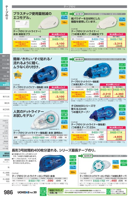 テープのりプラスチック使用量削減のエコモデル。使用例詰め替え用ドットライナー紙配合プラつめ替え用テープテープ幅8.4mm16m紙パウダーを主材料にした樹脂を使用しています。テープ幅8.4mm16m[コクヨ]テープのり〈ドットライナー〉本体・紙配合プラ商品種別型式/タ-DM400-08-E1「まとめ買いパック」は、「1組」単位でお申し込みください。1個8-633-1743M価税抜税抜価格税込価格¥460¥345¥379まとめ買いパック1組(10個入)8-633-1751ー¥3,100¥3,410[コクヨ]テープのり〈ドットライナー〉(つめ替え用テープ)紙配合プラ商品種別型式/タ-D400-08-E1「まとめ買いパック」は、「1組」単位でお申し込みください。1個8-633-1744M価税抜税抜価格税込価格¥350¥245¥269まとめ買いパック1組(15個入)8-633-1763ー¥3,315¥3,646●テープ/8.4(幅)mm×16(長)m●寸法/94(幅)×50(奥)×23(高)mm●質量/31g●アシッドフリー●包装数:1/10/200●テープ/8.4(幅)mm×16(長)m●寸法/94幅)×43(奥)×19(高)mm●質量/15g●アシッドフリー●包装数:1/15/300簡単!きれい!すぐ貼れる!流れるように軽く、ムラなくのり付け。テープ幅8.4mm16m[コクヨ]テープのり〈ドットライナー強粘着〉本体商品種別型式/タ-DM400-08N「まとめ買いパック」は、「1組」単位でお申し込みください。1個8-633-1547M価税抜税抜価格税込価格¥460¥345¥379まとめ買いパック1組(10個入)8-633-1626ー¥3,100¥3,410●テープ/8.4(幅)mm×16(長)m●寸法/94(幅)×50(奥)×23(高)mm●質量/31g●材質/本体ケース:再生ABS、つめ替えケース:再生ポリスチレン●アシッドフリー●包装数:1/10/200人気のドットライナーお試しモデル!テープ幅8.4mm8m[コクヨ]テープのり〈ドットライナー強粘着〉本体透明8m※簡易包装仕様です。お申込番号税抜価格M価税抜¥240商品種別型式/タ-DM400-08NT-S18-633-1659透明●テープ/8.4(幅)mm×8長)m●寸法/94(幅)×50(奥)×23(高)mm●質量/28g●材質/本体ケース:再生ABS、つめ替えケース:再生ポリスチレン●アシッドフリー●包装数:1/10/200¥172税込価格¥189単位1個詰め替え用ドットライナータ-DM400-08N,08NT-S1用[コクヨ]テープのり〈ドットライナー強粘着〉(つめ替え用テープ)16m商品種別型式/タ-D400-08N「まとめ買いパック」は、「1組」単位でお申し込みください。1個M価税抜8-633-1546税抜価格¥245¥269税込価格¥350テープ幅8.4mm16mまとめ買いパック1組(10個入)1組(20個入)8-633-16118-633-1676ー¥2,210¥2,431ー¥4,360¥4,796●テープ/8.4(幅)mm×16(長)m●寸法/94(幅)×43(奥)×19(高)mm●質量/15g●材質/つめ替えケース:再生ポリスチレン●アシッドフリー●包装数:1/10/200タ-DM400シリーズで使える22mのつめ替えテープ!テープ幅8.4mm22m[コクヨ]テープのり〈ドットライナー強粘着〉(つめ替えテープ)22m商品種別型式/タ-D400-08N-S22「まとめ買いパック」は、「1組」単位でお申し込みください。1個8-633-1707M価税抜税抜価格税込価格¥460¥320¥352まとめ買いパック1組(15個入)8-633-1714ー¥4,605¥5,065●テープ/8.4幅)mm×22長)m●寸法/94(幅)×43奥)×19高)mm●質量/17g●アシッドフリー●包装数:1/15/300長形3号封筒約400枚分塗れる、シリーズ最長テープのり。●大容量なのでたっぷり使うことができ、つめ替えの頻度も減ります。●テープのりなので、ベタつかず、乾く時間を待たずに接着でき、手やまわりも汚しません。[コクヨ]テープのり〈ドットライナーロング50〉本体商品種別型式/タ-DM4300-10お申込番号8-633-1761M価税抜¥810税抜価格¥590詰め替え用ドットライナーロング50つめ替え用テープテープ幅10mm50m[コクヨ]テープのり〈ドットライナーロング50〉(つめ替え用テープ)商品種別型式/タ-D4300-10お申込番号8-633-1762M価税抜¥670税抜価格¥460税込価格¥506単位1個テープ幅10mm50m税込価格¥649単位1個●テープ/10(幅)mm×50長)m●寸法/122幅)×66(奥)×24高)mm●質量/63g●アシッドフリー●包装数:1/5/100●テープ/10(幅)mm×50長)m●寸法/105(幅)×57(奥)×20(高)mm●質量/25g●アシッドフリー●包装数:1/5/100Vol.20地球にやさしくお買い物このマークのついた商品は地球環境保護に配慮された商品です。グリーンの文字で商品の判別をしやすくしました。どうぞご利用ください。エコマーク認定品グリーン購入法適合品GPNエコ商品ねっと掲載テープのり学習ペーパークラフト・素材イベント用品学習支援用品保育安全・安心OA・サプライ用品文具・事務用品日用品電子文具電子文筆記具筆記具修正用具修正用ファイルファイル穴をあけて穴をあけてとじるポケットにポケットに入れるとじ具でとじ具ではさみ込むボックス・ボックス・ケース用途別用途別ファイルファイルサポート用品事務用接着用品事務用事務用ペーパーペーパー鞄鞄机上事務机上事用品用品机上整理机上整用品用品