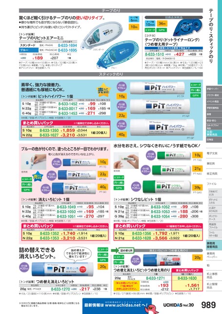 テープのり・スティックのり学習ペーパークラフト・素材イベント用品学習支援用品保育安全・安心OA・サプライ用品文具・事務用品日用品電子文具子筆記具筆記具修正用具正ファイルファイル穴をあけて穴をあけてとじるポケットにポケットに入れるとじ具でとじ具ではさみ込むボックス・ボックス・ケースス用途別用途別ファイルファイルサポート用品事務用接着用品事務用務ペーパーペーパー鞄机上事務上用品品机上整理上用品用品驚くほど軽く引けるテープのりの使い切りタイプ。●静かな場所でも音が気にならない「静音設計」。●持ち運びにピッタリな使い切りコンパクトタイプ。テープ幅6mm10m旧商品消耗品テープ幅10mm36mテープのり[トンボ鉛筆]テープのりピットエアーミニ商品種別スタンダードブルー型式/PN-EAS型式/PN-EASC40お申込番号8-633-16948-633-1695M価税抜¥260税抜価格¥189税込価格¥207単位1個●テープ/6(幅)mm×10(長)m●寸法/32(幅)×20(奥)×73(高)mm●質量/17g●使いきりタイプ●アシッドフリー●包装数:1/5[コクヨ]テープのり〈ドットライナーロング〉(つめ替え用テープ)在庫無次第終了商品お申込番号8-633-1510M価税抜¥610税抜価格¥427税込価格¥469単位1個商品種別型式/タ-D4400-10●テープ/10(幅)mm×36(長)m●寸法/120(幅)×23(奥)×60高)mm●質量/36g●材質/つめ替えケース:再生ポリカーボネート●アシッドフリー●包装数:1/5/100スタンダードブルースティックのり素早く、強力な接着力。普通紙にも厚紙にもOK。[トンボ鉛筆]ピットハイパワー1個商品種別お申込番号S10gN22gG40g●材質/容器:ポリプロピレン樹脂●包装数:1/20寸法/20(直径)×87長)mm、型式/PT-TP寸法/25(直径)×100(長)mm、型式/PT-NP寸法/31(直径)×115(長)mm、型式/PT-GP8-633-14528-633-00178-633-1453M価税抜税抜価格税込価格単位¥140¥99¥169¥271¥108¥185¥2981個¥260¥400商品種別まとめ買いパックS10gN22g8-633-13508-633-1627お申込番号※1組単位申込。税抜価格¥1,859¥3,210税込価格¥2,044¥3,531単位1組(20個入)ブルーの色が付くので、塗ったところが一目でわかります。乾くと色が消えるのできれいな仕上がり。のり径約16mm10gのり径約20mm22gのり径約26mm40gPT-TPPT-NPPT-GP水分をおさえ、シワなくきれいに!うす紙でもOK!のり径約16mm使用例のり径約16mmのり径約20mmのり径約26mm10gPT-TC22gPT-NC40gPT-GC使用例のり径約20mmのり径約26mm[トンボ鉛筆]消えいろピット1個商品種別お申込番号寸法/20直径)×87(長)mm、型式/PT-TC寸法/25直径)×100(長)mm、型式/PT-NC寸法/31直径)×115(長)mm、型式/PT-GCS10gN22gG40g●材質/容器:ポリプロピレン樹脂●包装数:1/208-633-10498-633-10508-633-1051M価税抜税抜価格税込価格単位¥140¥95¥169¥270¥104¥185¥2971個¥260¥400[トンボ鉛筆]シワなしピット1個商品種別お申込番号寸法/20(直径)×87(長)mm、型式/PT-TAS寸法/25(直径)×100(長)mm、型式/PT-NAS寸法/31(直径)×115(長)mm、型式/PT-GASS10gN21gG39g●材質/容器:ポリプロピレン樹脂●包装数:1/208-633-10528-633-10538-633-105410gPT-TAS21gPT-NAS39gPT-GASM価税抜税抜価格税込価格単位¥140¥99¥188¥280¥108¥206¥3081個¥260¥400商品種別まとめ買いパックS10gN22g8-633-13528-633-1353お申込番号※1組単位申込。税抜価格¥1,740¥3,210税込価格¥1,914¥3,531単位1組(20個入)商品種別まとめ買いパックS10gN21g8-633-13568-633-1628お申込番号※1組単位申込。税抜価格¥1,792¥3,566税込価格¥1,971¥3,922単位1組(20個入)詰め替えできる消えいろピット。のり径約20mm詰め替えができるので経済性に優れています!20g[トンボ鉛筆]つめ替え消えいろピット商品種別お申込番号税抜価格型式/PT-NCR20g●寸法/25(直径)×110(長)mm●材質/容器:ポリプロピレン●包装数:1/108-633-1270¥217M価税抜¥290税込価格¥238単位1個詰め替え用消えいろピットつめ替え用のりのり径約20mm20g[トンボ鉛筆]つめ替え消えいろピットつめ替え用のり商品種別20g「まとめ買いパック」は、型式/PR-NCR「1組」単位でお申し込みください。1個8-633-1271M価税抜税抜価格税込価格¥220¥193¥212まとめ買いパック1組(10個入)8-633-1630ー¥1,561¥1,717●寸法/27(直径)×86(長)mm●材質/容器:ポリプロピレン●包装数:1/10※カタログに掲載の商品情報(仕様・価格・税率など)は変更になる場合がございます。最新情報はUCHIDASww.uchidas.netwへ!Vol.20989