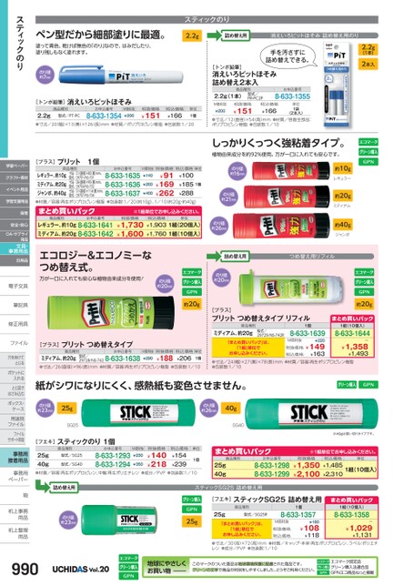 スティックのり2.2g詰め替え用消えいろピットほそみ詰め替え用のりペン型だから細部塗りに最適。塗って青色、乾けば無色の「のり」なので、はみだしたり、塗り残しもなく塗れます。のり径約7mm[トンボ鉛筆]消えいろピットほそみ商品種別お申込番号税抜価格2.2g●寸法/20幅)×13奥)×126長)mm●材質/ポリプロピレン樹脂●包装数:1/208-633-1354型式/PT-PC¥151税込価格¥166単位1個M価税抜¥200[プラス]プリット1個商品種別お申込番号レギュラー、約10gミディアム、約20gジャンボ、約40g●材質/容器:再生ポリプロピレン樹脂●包装数:1/20(約10g)、1/10(約20g・約40g)寸法/21(直径)×85長)mm、型式/29701/NS-701寸法/26(直径)×95長)mm、型式/29704/NS-702寸法/31(直径)×114長)mm、型式/29707/NS-7048-633-16358-633-16368-633-1637¥91¥169¥262¥100¥185¥288¥260¥400M価税抜税抜価格税込価格単位¥1401個商品種別まとめ買いパックレギュラー、約10g8-633-1641ミディアム、約20g8-633-1642お申込番号※1組単位申込。税抜価格¥1,730¥1,600税込価格単位¥1,9031組(20個入)¥1,7601組(10個入)手を汚さずに詰め替えできる。[トンボ鉛筆]消えいろピットほそみ詰め替え2本入商品種別2.2g(1本)型式/PR-PC2Pお申込番号8-633-1355M価税抜¥200税抜価格¥151税込価格¥166単位1袋(2本入)●寸法/12(直径)×54(高)mm●材質/容器全部品:ポリプロピレン樹脂●包装数:1/10しっかりくっつく強粘着タイプ。植物由来成分を約92%使用。万が一口に入れても安心です。のり径約16mmのり径約21mmのり径約26mm約10gレギュラー約20gミディアム約40gジャンボ2.2g(1本)2本入約20gエコロジー&エコノミーなつめ替え式。万が一口に入れても安心な植物由来成分を使用!詰め替え用つめ替え用リフィルのり径約20mmのり径約20mm約20g[プラス]プリットつめ替えタイプ商品種別ミディアム、約20g●寸法/26(直径)×96(長)mm●材質/容器:再生ポリプロピレン樹脂●包装数:1/1029728/NS-7428-633-1638¥206¥188M価税抜税抜価格税込価格単位¥2901個お申込番号型式/[プラス]プリットつめ替えタイプリフィル商品種別ミディアム、約20g型式/29729/NS-742R「まとめ買いパック」は、「1組」単位でお申し込みください。1個8-633-1639¥220M価税抜税抜価格¥149¥163税込価格まとめ買いパック1組(10個入)8-633-1644ー¥1,358¥1,493●寸法/24(幅)×27(奥)×78(長)mm●材質/容器:再生ポリプロピレン樹脂●包装数:1/10紙がシワになりにくく、感熱紙も変色させません。のり径約23mm25gSG25のり径約26mm40gSG40[フエキ]スティックのり1個商品種別お申込番号税抜価格単位型式/SG2525g40g●材質/容器:再生ポリプロピレン、中軸:再生ポリエチレン●成分/PVP●包装数:1/108-633-12938-633-1294¥140¥218型式/SG40¥3501個税込価格¥154¥239M価税抜¥230商品種別まとめ買いパック25g40g8-633-12988-633-1299お申込番号※40gは使い切りタイプです。※1組単位申込。税抜価格¥1,350¥2,100税込価格¥1,485¥2,310単位1組(10個入)詰め替え用のり径約23mmスティックSG25詰め替え用[フエキ]スティックSG25詰め替え用25g商品種別型式/SG25R25g「まとめ買いパック」は、「1組」単位でお申し込みください。1個8-633-1357M価税抜税抜価格税込価格¥180¥108¥118まとめ買いパック1組(10個入)8-633-1358ー¥1,029¥1,131●寸法/30(径)×72高)mm●材質/キャップ・本体:再生ポリプロピレン、ラベル:ポリエチレン●成分/PVP●包装数:1/10スティックのり学習ペーパークラフト・素材イベント用品学習支援用品保育安全・安心OA・サプライ用品文具・事務用品日用品電子文具電子文筆記具筆記具修正用具修正用ファイルファイル穴をあけて穴をあけてとじるポケットにポケットに入れるとじ具でとじ具ではさみ込むボックス・ボックス・ケース用途別用途別ファイルファイルサポート用品事務用接着用品事務用事務用ペーパーペーパー鞄鞄机上事務机上事用品用品机上整理机上整用品用品Vol.20地球にやさしくお買い物このマークのついた商品は地球環境保護に配慮された商品です。グリーンの文字で商品の判別をしやすくしました。どうぞご利用ください。エコマーク認定品グリーン購入法適合品GPNエコ商品ねっと掲載