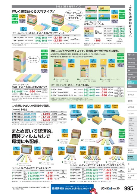 ふせん(通常粘着タイプ)学習ペーパークラフト・素材イベント用品学習支援用品保育安全・安心OA・サプライ用品文具・事務用品日用品電子文具子筆記具筆記具修正用具正ファイルファイル穴をあけて穴をあけてとじるポケットにポケットに入れるとじ具でとじ具ではさみ込むボックス・ボックス・ケースス用途別用途別ファイルファイルサポート用品事務用務接着用品着事務用ペーパー鞄机上事務上用品品机上整理上用品用品ふせん(通常粘着タイプ)詳しく書き込める大判サイズ!100枚×10個入古紙再生紙100%75×127mmの1パック(100枚)個包装です。75×127mm75×100mm商品種別[スリーエムジャパン]ポスト・イット®エコノパックTMノートお申込番号税抜価格税込価格単位型式/6571-K75×100mm75×127mm●セット内容/多色アソート(イエロー×4個、ピンク・ブルー・グリーン×各2個)●材質/再生紙●古紙配合率/100%●包装数:1/10¥2,435¥2,678¥2,728¥3,0008-633-66518-633-6666(100枚×10個入)型式/6551-K¥4,0701箱M価税抜¥3,49075×127mm100枚入古紙再生紙100%[スリーエムジャパン]ポスト・イット®ノート商品種別ピンクイエローグリーンブルーM価税抜¥50075×127mm税抜価格¥395型式/655RP-P型式/655RP-Y型式/655RP-G型式/655RP-B税込価格¥434お申込番号8-633-66528-633-66538-633-66548-633-6655単位1パック(100枚入)●材質/再生紙●接着剤/アクリル系●古紙配合率/100%●包装数:1/100見出しにぴったりのサイズです。資料整理や仕分けなどに便利。●古紙100%の再生紙を使用。環境保全を考え、資源をムダなく利用しています。●色や書き心地、使用感などは、今までとまったく変わりません。50×7.5mm100枚×10個入50×15mm100枚×5個入25×7.5mm100枚×10個入古紙再生紙100%買い置きにおすすめ!50×15mm100枚×10個入古紙再生紙100%●イエロー×2個、ピンク・ブルー・グリーン×1個●ホワイト(赤線入り)・イエロー・ピンク・ブルー・グリーン×2個●イエロー×4個、ピンク・ブルー・グリーン×2個M価税抜¥500¥400¥360税抜価格¥395¥318¥286税込価格¥434¥349¥314単位1パック1パック1パック(100枚×5個入)(100枚×10個入)(100枚×10個入)商品種別お申込番号型式/700RP-K50×15mm50×7.5mm(スリム)型式/710RP-K25×7.5mm(スリム・ミニ)型式/715RP-K●●●材質/再生紙●接着剤/アクリル系●古紙配合率/100%●包装数:1/200(50×15mm)、1/10050×7.5mm、25×7.5mm)8-633-66488-633-66498-633-6650●[スリーエムジャパン]ポスト・イット®見出し[スリーエムジャパン]ポスト・イット®見出しお買い得パックお申込番号8-633-6667M価税抜¥740税抜価格税込価格¥590¥649単位1パック(100枚×10個入)商品種別50×15mm型式/700RP-BK●セット内容/多色アソート(イエロー×4個、ピンク・ブルー・グリーン×各2個)●材質/再生紙●古紙配合率/100%●包装数:1/10●セット内容/イエロー・グリーン・ブルー・ピンク:各5冊(75×25mm)、イエロー:4冊、グリーン・ブルー・ピンク:各2冊(75×50mm・75×75mm)●包装数:1/30まとめ買いで経済的。個装フィルムなしで環境にも配慮。75×75mm100枚×5冊入●イエロー×2冊、ピンク、ブルー、グリーン×1冊75×25mm100枚×20冊入●ピンク・イエロー・グリーン・ブルー×5冊再生紙70%75×12.5mm100枚×20冊入75×25mm100枚×20冊入75×12.5mm100枚×20冊入45×7.5mm100枚×40冊入45×12.5mm100枚×20冊入75×25mm100枚×20冊入75×50mm100枚×10冊入75×75mm100枚×10冊入●●●単位1箱1箱(100枚×20冊入)(100枚×10冊入)M価税抜税抜価格税込価格¥1,249¥1,373¥1,198¥1,317¥1,398¥1,537オープンお申込番号8-633-61208-633-61218-633-6122商品種別75×25mm75×50mm75×75mm❹❺❻人・自然にやさしい水溶性のり使用。[丸石製紙]ふせん●ブルー・グリーン・イエロー・ピンク×5冊●ピンク・イエロー・グリーン・ブルー×5冊●ブルー・グリーン・イエロー・ピンク×5冊●ピンク・イエロー×12冊、グリーン・ブルー×8冊●イエロー×8冊、ピンク・ブルー・グリーン×4冊[ニチバン]ポイントメモTMビジネスパック・パステルライン単位1箱1箱1箱(100枚×20冊入)(100枚×40冊入)(100枚×20冊入)お申込番号M価税抜税抜価格税込価格8-633-6239¥2,120¥1,335¥1,468¥8488-633-6241¥1,320¥932¥918¥1,0098-633-6242¥1,460¥8318-633-6243¥1,320¥914型式/FB-2KP型式/FB-3KP型式/FB-5KP型式/FB-6KP商品種別75×25mm75×12.5mm45×7.5mm45×12.5mm❿⓫⓬⓭単位1箱1箱(100枚×5冊入)(100枚×20冊入)M価税抜税抜価格お申込番号税込価格8-634-3544¥1,060¥7378-633-6455¥2,120¥1,355¥1,4908-633-6456¥1,320¥932¥670¥848型式/MB-2KN型式/FB-2K型式/FB-3K商品種別75×75mm75×25mm75×12.5mm❼❽❾[ニチバン]ポイントメモTMビジネスパック●粘着剤/アクリル系●再生紙70%●1冊100枚●包装数:1/20●粘着剤/アクリル系●再生紙70%●1冊100枚●包装数:1/20※カタログに掲載の商品情報(仕様・価格・税率など)は変更になる場合がございます。最新情報はUCHIDASww.uchidas.netwへ!Vol.20995