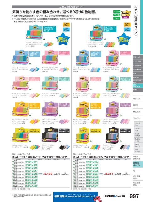 ふせん(強粘着タイプ)学習ペーパークラフト・素材イベント用品学習支援用品保育安全・安心OA・サプライ用品文具・事務用品日用品電子文具子修正用具正ファイルファイル穴をあけて穴をあけてとじるポケットにポケットに入れるとじ具でとじ具ではさみ込むボックス・ボックス・ケースス用途別用途別ファイルファイルサポート用品事務用務接着用品着事務用ペーパー鞄机上事務上用品品机上整理上用品用品ふせん(強粘着タイプ)気持ちを動かす色の組み合わせ。選べる9通りの色物語。●粘着力が約2倍の強粘着タイプ(スリーエムジャパン通常粘着製品比)です。●パソコンや電話、キャビネットなどの樹脂面や垂直面など、今まではがれやすかった場所にもしっかり貼れます。また、繰り返し貼ったりはがしたりできます。【カレイドスコープ】創造力と効率を高める色●アクアスプラッシュ・グアバ・バイタルオレンジ・ライトグリーン×各3個【ブルーアワー】心を落ち着かせる色90枚×12個入75×75mm【フラワー】気持ちを伝える色【カレイドスコープ】創造力と効率を高める色90枚×24個入75×25mm●アクアスプラッシュ・グアバ・バイタルオレンジ・ライトグリーン×各6個【ブルーアワー】心を落ち着かせる色【フラワー】気持ちを伝える色●●●●ブルー・オーキッドフロスト・グリーン・ブルーパラダイス×各3個ポジティブリィピンク・アクアスプラッシュ・ブルー・シトロン×各3個ブルー・オーキッドフロスト・グリーン・ブルーパラダイス×各6個ポジティブリィピンク・アクアスプラッシュ・ブルー・シトロン×各6個【サクラ】心を和ませる色【スイーツ】やさしくなれる色【サクラ】心を和ませる色【スイーツ】やさしくなれる色●●●●ピンク・ポジティブリィピンク・イエロー・アシッドライム×各3個グリーン・イエロー・オーキッドフロスト・ピンク×各3個ピンク・ポジティブリィピンク・イエロー・アシッドライム×各6個グリーン・イエロー・オーキッドフロスト・ピンク×各6個【トロピカルフルーツ】気分を上げる色【フラミンゴ】かわいく魅せる色【トロピカルフルーツ】気分を上げる色【フラミンゴ】かわいく魅せる色筆記具筆記具●●●●ビビットイエロー・トロピカルピンク・パパイヤフィズ・アシッドライム×各3個アイリスインフュージョン・ポジティブリィピンク・トロピカルピンク・ピンク×各3個ビビットイエロー・トロピカルピンク・パパイヤフィズ・アシッドライム×各6個アイリスインフュージョン・ポジティブリィピンク・トロピカルピンク・ピンク×各6個【グッピー】視線を集める色【ギャラクシー】個を引き立てる色【グッピー】視線を集める色【ギャラクシー】個を引き立てる色●●●●シトロン・ライトグリーン・シーグラス・グアバ×各3個ブラック・ペブルグレー・オーキッドフロスト・ブルー×各3個シトロン・ライトグリーン・シーグラス・グアバ×各6個ブラック・ペブルグレー・オーキッドフロスト・ブルー×各6個[スリーエムジャパン]ポスト・イット®強粘着ノートマルチカラー増量パック[スリーエムジャパン]ポスト・イット®強粘着ふせんマルチカラー増量パックM価税抜税抜価格税込価格単位M価税抜税抜価格税込価格単位¥3,630¥2,432¥2,6751箱(90枚×12個入)¥3,300¥2,211¥2,4321箱(90枚×24個入)お申込番号8-634-35238-634-35248-634-35258-634-35268-634-35278-634-35288-634-35298-634-35308-634-3531商品種別型式/5001SS-MC-1N型式/5001SS-MC-2N型式/5001SS-MC-3N型式/5001SS-MC-4N型式/5001SS-MC-5N型式/5001SS-MC-6N型式/5001SS-MC-7N型式/5001SS-MC-8N型式/5001SS-MC-9❿⓫⓬⓭⓮⓯⓰⓱⓲●材質/紙●包装数:1/10お申込番号8-634-35148-634-35158-634-35168-634-35178-634-35188-634-35198-634-35208-634-35218-634-3522商品種別型式/6541SS-MC-1N型式/6541SS-MC-2N型式/6541SS-MC-3N型式/6541SS-MC-4N型式/6541SS-MC-5N型式/6541SS-MC-6N型式/6541SS-MC-7N型式/6541SS-MC-8N型式/6541SS-MC-9❶❷❸❹❺❻❼❽❾●材質/紙●包装数:1/10※カタログに掲載の商品情報(仕様・価格・税率など)は変更になる場合がございます。最新情報はUCHIDASww.uchidas.netwへ!Vol.20