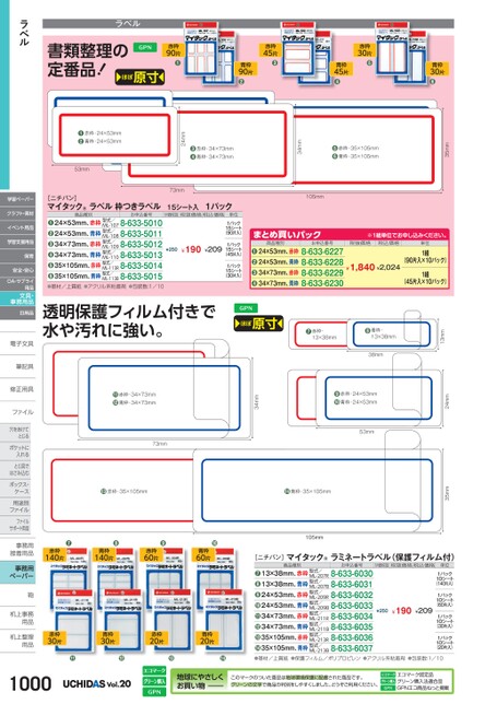 ラベル書類整理の定番品!ほぼ原寸赤枠90片●赤枠45片●青枠90片●赤枠30片●青枠45片●青枠30片●35mm赤枠・35×105mm青枠・35×105mm❻❺34mm105mm※1組単位申込。税抜価格税込価格単位¥1,840¥2,0241組(90片入×10パック)1組(45片入×10パック)お申込番号8-633-62278-633-62288-633-62298-633-6230商品種別24×53mm、赤枠24×53mm、青枠34×73mm、赤枠34×73mm、青枠●●●●まとめ買いパックほぼ原寸❼赤枠・13×38mm❽青枠・13×38mm38mm赤枠・34×73mm青枠・34×73mm❹❸24mm73mm15シート入M価税抜税抜価格税込価格1パック単位¥250¥190¥2091パック15シート(90片入)1パック15シート(45片入)1パック15シート(30片入)赤枠・24×53mm青枠・24×53mm❷❶53mm[ニチバン]マイタック®ラベル枠つきラベル商品種別お申込番号24×53mm、赤枠型式/24×53mm、青枠型式/34×73mm、赤枠型式/34×73mm、青枠型式/35×105mm、赤枠型式/35×105mm、青枠型式/ML-1078-633-5010ML-1088-633-5011ML-1098-633-5012ML-1108-633-5013ML-113R8-633-5014ML-113B8-633-5015●●●●●●●基材/上質紙●アクリル系粘着剤●包装数:1/10透明保護フィルム付きで水や汚れに強い。13mm24mm35mm53mm赤枠・24×53mm青枠・24×53mm❾❿34mm赤枠・34×73mm青枠・34×73mm⓫⓬73mm⓭赤枠・35×105mm⓮青枠・35×105mm[ニチバン]マイタック®ラミネートラベル(保護フィルム付)商品種別お申込番号M価税抜税抜価格税込価格単位¥250¥190¥2091パック10シート(140片入)1パック10シート(60片入)1パック10シート(30片入)1パック10シート(20片入)13×38mm、赤枠型式/13×38mm、青枠型式/24×53mm、赤枠型式/24×53mm、青枠型式/34×73mm、赤枠型式/34×73mm、青枠型式/35×105mm、赤枠型式/35×105mm、青枠型式/ML-207R8-633-6030ML-207B8-633-6031ML-209R8-633-6032ML-209B8-633-6033ML-211R8-633-6034ML-211B8-633-6035ML-213R8-633-6036ML-213B8-633-6037●●●●●●●●●基材/上質紙●保護フィルム/ポリプロピレン●アクリル系粘着剤●包装数:1/10105mm●赤枠140片●❽青枠140片●赤枠60片●青枠60片赤枠30片青枠30片赤枠20片青枠20片●●●●Vol.20地球にやさしくお買い物このマークのついた商品は地球環境保護に配慮された商品です。グリーンの文字で商品の判別をしやすくしました。どうぞご利用ください。エコマーク認定品グリーン購入法適合品GPNエコ商品ねっと掲載ラベル学習ペーパークラフト・素材イベント用品学習支援用品保育安全・安心OA・サプライ用品文具・事務用品日用品電子文具電子文筆記具筆記具修正用具修正用ファイルファイル穴をあけて穴をあけてとじるポケットにポケットに入れるとじ具でとじ具ではさみ込むボックス・ボックス・ケース用途別用途別ファイルファイルサポート用品事務用事務接着用品接着用事務用ペーパー鞄鞄机上事務机上事用品用品机上整理机上整用品用品