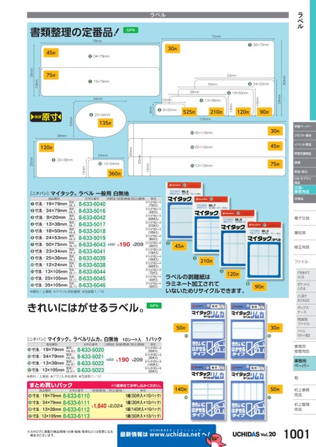 ラベル学習ペーパークラフト・素材イベント用品学習支援用品保育安全・安心OA・サプライ用品文具・事務用品日用品電子文具子筆記具筆記具修正用具正ファイルファイル穴をあけて穴をあけてとじるポケットにポケットに入れるとじ具でとじ具ではさみ込むボックス・ボックス・ケースス用途別用途別ファイルファイルサポート用品事務用務接着用品着事務用ペーパー鞄机上事務上用品品机上整理上用品用品50mm24mm30片45片75片ラベル30片75mm❼50×75mm53mm50mm❻24×53mm38mm❺18×50mm18mm120片90片13mm20mm❹13×38mm525片210片105mm❸8×20mm8mm書類整理の定番品!79mm❷34×79mm❶19×79mm34mm45片75片19mm34mm❽23×34mm135片23mmほぼ原寸⓭35×105mm⓬25×105mm⓫13×105mm13mm25mm35mm24mm❿12×24mm360片12mm38mm120片❾25×38mm25mm●45片●210片●ラベルの剥離紙はラミネート加工されていないためリサイクルできます。●120片50片⓮140片⓰90片30片⓯50片⓱¥250¥190¥209単位1パック15シート(75片入)1パック15シート(45片入)1パック15シート(525片入)1パック15シート(210片入)1パック15シート(120片入)1パック15シート(90片入)1パック15シート(30片入)1パック15シート(135片入)1パック15シート(120片入)1パック15シート(360片入)1パック15シート(75片入)1パック15シート(45片入)1パック15シート(30片入)[ニチバン]マイタック®ラベル一般用白無地M価税抜税抜価格税込価格お申込番号8-633-60408-633-50168-633-60428-633-50178-633-50188-633-50198-633-60438-633-60418-633-60398-633-60388-633-60448-633-60458-633-6046型式/ML-3型式/ML-5型式/ML-6型式/ML-7型式/ML-8型式/ML-9型式/ML-10型式/ML-4型式/ML-2型式/ML-1型式/ML-11型式/ML-12型式/ML-13商品種別寸法/19×79mm寸法/34×79mm寸法/8×20mm寸法/13×38mm寸法/18×50mm寸法/24×53mm寸法/50×75mm寸法/23×34mm寸法/25×38mm寸法/12×24mm寸法/13×105mm寸法/25×105mm寸法/35×105mm●●●●●●●●●●●●●●基材/上質紙●アクリル系粘着剤●包装数:1/10きれいにはがせるラベル。¥250¥190¥2091パック10シート(50片入)1パック10シート(30片入)1パック10シート(140片入)1パック10シート(50片入)[ニチバン]マイタック®ラベルリムカ®白無地10シート入1パックM価税抜税抜価格税込価格単位お申込番号8-633-50208-633-50218-633-50228-633-5023商品種別型式/ML-R3型式/ML-R5型式/ML-R7型式/ML-R11寸法/19×79mm寸法/34×79mm寸法/13×38mm寸法/13×105mm●●●●※1組単位申込。税抜価格税込価格¥1,840¥2,024単位1組(50片入×10パック)1組(30片入×10パック)1組(140片入×10パック)1組(50片入×10パック)寸法/19×79mm8-633-6110寸法/34×79mm8-633-6111寸法/13×38mm8-633-6112寸法/13×105mm8-633-6113●●●●まとめ買いパック商品種別お申込番号●基材/上質紙●アクリル系粘着剤●包装数:1/10※カタログに掲載の商品情報(仕様・価格・税率など)は変更になる場合がございます。最新情報はUCHIDASww.uchidas.netwへ!Vol.201001