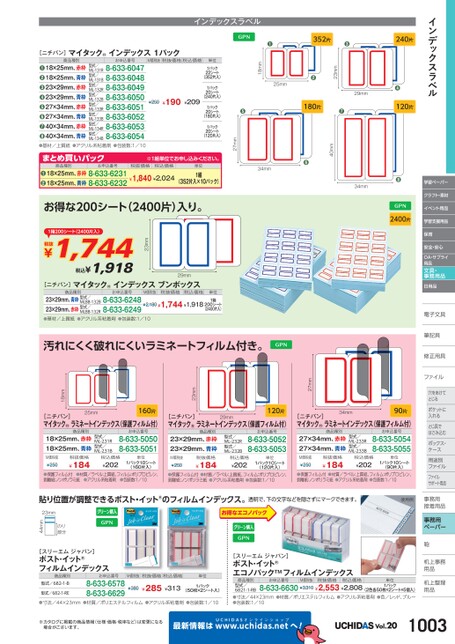 インデックスラベル学習ペーパークラフト・素材イベント用品学習支援用品保育安全・安心OA・サプライ用品文具・事務用品日用品電子文具子筆記具筆記具修正用具正ファイルファイル穴をあけて穴をあけてとじるポケットにポケットに入れるとじ具でとじ具ではさみ込むボックス・ボックス・ケースス用途別用途別ファイルファイルサポート用品事務用務接着用品着事務用ペーパー鞄机上事務上用品品机上整理上用品用品インデックスラベル●34mm2400片352片●240片●●120片29mm180片●23mm●25mm●18mm40mm●34mm単位1パック22シート(352片入)●27mm1パック20シート(240片入)1パック20シート(180片入)1パック20シート(120片入)¥250¥190¥209[ニチバン]マイタック®インデックス1パックM価税抜税抜価格税込価格お申込番号8-633-60478-633-60488-633-60498-633-60508-633-60518-633-60528-633-60538-633-6054型式/ML-131R型式/ML-131B型式/ML-132R型式/ML-132B型式/ML-133R型式/ML-133B型式/ML-134R型式/ML-134B商品種別18×25mm、赤枠18×25mm、青枠23×29mm、赤枠23×29mm、青枠27×34mm、赤枠27×34mm、青枠40×34mm、赤枠40×34mm、青枠●●●●●●●●●基材/上質紙●アクリル系粘着剤●包装数:1/10※1組単位申込。税抜価格税込価格単位¥1,840¥2,0241組(352片入×10パック)18×25mm、赤枠8-633-623118×25mm、青枠8-633-6232●●まとめ買いパック商品種別お申込番号お得な200シート(2400片)入り。23×29mm、青枠型式/23×29mm、赤枠型式/●基材/上質紙●アクリル系粘着剤●包装数:1/10MLBB-132B8-633-6248MLBB-132R8-633-6249¥2,180¥1,744¥1,918単位1箱200シート(2400片入)[ニチバン]マイタック®インデックスブンボックス商品種別お申込番号M価税抜税抜価格税込価格29mm23mm1箱200シート(2400片入)税抜¥1,744税込¥1,91825mm160片[ニチバン]マイタック®ラミネートインデックス(保護フィルム付)[ニチバン]マイタック®ラミネートインデックス(保護フィルム付)29mm[ニチバン]マイタック®ラミネートインデックス(保護フィルム付)商品種別18×25mm、赤枠型式/18×25mm、青枠型式/ML-231RML-231Bお申込番号8-633-50508-633-5051商品種別23×29mm、赤枠23×29mm、青枠M価税抜¥250税抜価格¥184税込価格¥202単位1パック10シート(160片入)M価税抜¥250税抜価格¥184型式/ML-232R型式/ML-232Bお申込番号8-633-50528-633-5053税込価格¥202単位1パック10シート(120片入)商品種別27×34mm、赤枠型式/27×34mm、青枠型式/ML-233RML-233Bお申込番号8-633-50548-633-5055M価税抜¥250税抜価格¥184税込価格¥202単位1パック10シート(90片入)●保護フィルム付●材質/ラベル:上質紙、フィルム:ポリプロピレン、剥離紙:ノンポリラミ紙●アクリル系粘着剤●包装数:1/10●保護フィルム付●材質/ラベル:上質紙、フィルム:ポリプロピレン、剥離紙:ノンポリラミ紙●アクリル系粘着剤●包装数:1/10●保護フィルム付●材質/ラベル:上質紙、フィルム:ポリプロピレン、剥離紙:ノンポリラミ紙●アクリル系粘着剤●包装数:1/10120片34mm90片貼り位置が調整できるポスト・イット®のフィルムインデックス。透明で、下の文字などを隠さずにマークできます。使用例お得なエコノパックのり部分44mm23mm[スリーエムジャパン]ポスト・イット®フィルムインデックス商品種別型式/682-1-B型式/682-1-REお申込番号8-633-65788-633-6629M価税抜税抜価格税込価格単位¥380¥285¥3131パック(50枚×2シート入)●寸法/44×23mm●材質/ポリエステルフィルム●アクリル系粘着剤●包装数:1/10[スリーエムジャパン]ポスト・イット®エコノパックTMフィルムインデックス商品種別型式/6821-1-RBお申込番号M価税抜税抜価格税込価格8-633-6630¥3,310¥2,553¥2,808単位1パック(2色各50枚×2シート×5個入)●寸法/44×23mm●材質/ポリエステルフィルム●アクリル系粘着剤●色/レッド、ブルー●包装数:1/1027mm23mm18mm汚れにくく破れにくいラミネートフィルム付き。※カタログに掲載の商品情報(仕様・価格・税率など)は変更になる場合がございます。最新情報はUCHIDASww.uchidas.netwへ!Vol.201003