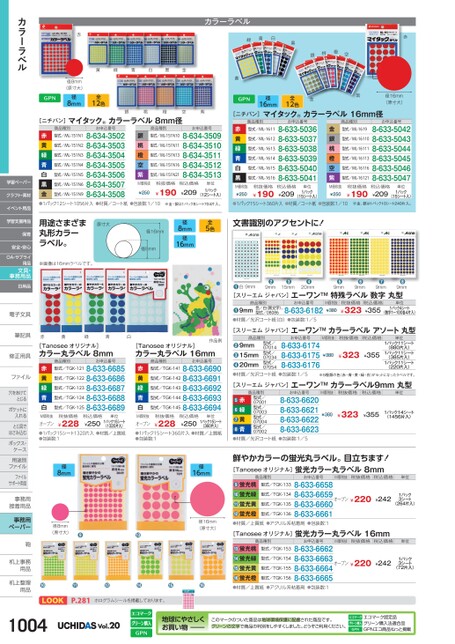 カラーラベル緑青白黒桃橙空銀赤黄径16mm全12色金紫径16mm(原寸大)[ニチバン]マイタック®カラーラベル16mm径黄緑青白黒金赤カラーラベル径8mm(原寸大)径8mm全12色銀桃橙空紫[ニチバン]商品種別型式/ML-151N1マイタック®カラーラベル8mm径お申込番号型式/ML-151N4型式/ML-151N3型式/ML-151N2赤黄緑青白黒金●1パック12シート1056片入●材質/コート紙●包装数:1/108-634-35028-634-35038-634-35048-634-35058-634-35068-634-35078-634-3508銀桃橙空紫型式/ML-151N5型式/ML-151N6型式/ML-151N9M価税抜¥250商品種別型式/ML-151N10型式/ML-151N11型式/ML-151N13型式/ML-151N16型式/ML-151N21お申込番号8-634-35098-634-35108-634-35118-634-35128-634-3513税抜価格¥190税込価格¥209単位1パック(12シート入)商品種別型式/ML-1611型式/ML-1612型式/ML-1613型式/ML-1614型式/ML-1615型式/ML-1616お申込番号8-633-50368-633-50378-633-50388-633-50398-633-50408-633-5041赤黄緑青白黒金銀桃橙空紫商品種別型式/ML-1619型式/ML-16110型式/ML-16111型式/ML-16113型式/ML-16116型式/ML-16121お申込番号8-633-50428-633-50438-633-50448-633-50458-633-50468-633-5047税抜価格¥190税込価格¥209(15シート入)※金、銀は1パック10シート240片入。単位1パックM価税抜¥250税抜価格¥190税込価格¥209単位1パック(15シート入)M価税抜¥250※金・銀は1パック8シート704片入。●1パック15シート360片入●材質/コート紙●包装数:1/10●白9mm●9mm●15mm●20mm●9mm●9mm●9mm●9mm[スリーエムジャパン]エーワンTM特殊ラベル数字丸型商品種別お申込番号9mm色/白(黒文字)、型式/08086●●材質/光沢コート紙(白)●包装数:1/58-633-6182M価税抜¥380税抜価格¥323税込価格¥355単位1パック4シート(数字1〜100各4片入)文書識別のアクセントに!色全5径8mm径16mm径16mm径8mm用途さまざま丸形カラーラベル。原寸大※画像は16mmラベルです。学習ペーパークラフト・素材イベント用品学習支援用品保育安全・安心OA・サプライ用品文具・事務用品日用品電子文具電子文修正用具修正用ファイルファイル穴をあけて穴をあけてとじるポケットにポケットに入れるとじ具でとじ具ではさみ込むボックス・ボックス・ケース用途別用途別ファイルファイルサポート用品事務用事務接着用品接着用事務用ペーパー鞄鞄机上事務机上事用品用品机上整理机上整用品用品オープン¥220¥2421パック3シート(264片入)¥380¥323¥3551パック14シート(1456片入)[スリーエムジャパン]エーワンTMカラーラベルアソート丸型M価税抜税抜価格税込価格単位¥380¥323¥3551パック11シート(880片入)1パック11シート(385片入)1パック11シート(220片入)お申込番号8-633-61748-633-61758-633-6176商品種別型式/07014型式/07034型式/070549mm15mm20mm●●●●材質/光沢コート紙●包装数:1/5※5種類の色(赤・青・黄・緑・白)がセットになったラベルです。[スリーエムジャパン]エーワンTMカラーラベル9mm丸型M価税抜税抜価格税込価格単位お申込番号8-633-66208-633-66218-633-66228-633-6623商品種別型式/07001型式/07003型式/07004型式/07002赤緑黄青❻●●●●材質/光沢コート紙●包装数:1/5鮮やかカラーの蛍光丸ラベル。目立ちます![Tanoseeオリジナル]蛍光カラー丸ラベル8mmM価税抜税抜価格税込価格単位お申込番号8-633-66588-633-66598-633-66608-633-6661商品種別型式/TGK-133型式/TGK-134型式/TGK-135型式/TGK-136蛍光桃蛍光緑蛍光黄蛍光橙❿●●●●材質/上質紙●アクリル系粘着剤●包装数:1お申込番号8-633-66628-633-66638-633-66648-633-6665商品種別型式/TGK-153型式/TGK-154型式/TGK-155型式/TGK-156蛍光桃蛍光緑蛍光黄蛍光橙⓮●●●●材質/上質紙●アクリル系粘着剤●包装数:1[Tanoseeオリジナル]蛍光カラー丸ラベル16mmM価税抜税抜価格税込価格単位オープン¥220¥2421パック3シート(72片入)筆記具筆記具赤黄緑青白作品例[Tanoseeオリジナル]カラー丸ラベル8mm[Tanoseeオリジナル]カラー丸ラベル16mm商品種別お申込番号型式/TGK-1218-633-6685型式/TGK-1228-633-6686型式/TGK-1238-633-6687型式/TGK-1248-633-6688型式/TGK-1258-633-6689赤黄緑青白商品種別お申込番号型式/TGK-1418-633-6690型式/TGK-1428-633-6691型式/TGK-1438-633-6692型式/TGK-1448-633-6693型式/TGK-1458-633-6694赤黄緑青白税抜価格¥228M価税抜1パック15シートオープン(1320片入)●1パック15シート1320片入●材質/上質紙●包装数:1税込価格¥250単位税抜価格¥228M価税抜1パック15シートオープン(360片入)●1パック15シート360片入●材質/上質紙●包装数:1税込価格¥250単位径8mm径8mm(原寸大)❾⓭径16mm径16mm(原寸大)❿⓫⓬⓮⓯⓰P.281ホログラムシールを掲載しております。1004Vol.20地球にやさしくお買い物このマークのついた商品は地球環境保護に配慮された商品です。グリーンの文字で商品の判別をしやすくしました。どうぞご利用ください。エコマーク認定品グリーン購入法適合品GPNエコ商品ねっと掲載