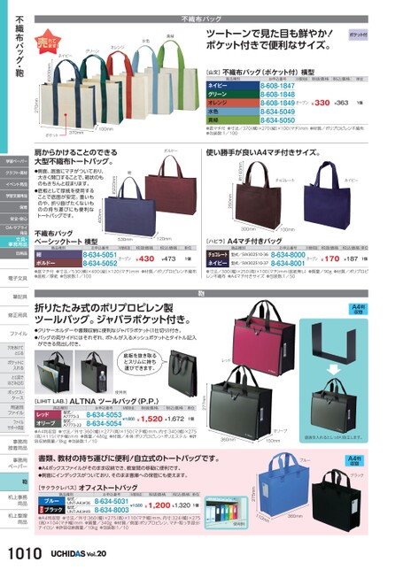 不織布バッグ黄緑水色ツートーンで見た目も鮮やか!ポケット付きで便利なサイズ。ポケット付グリーンオレンジネイビーチョコレートネイビー約140mm250mm300mm100mm[ハピラ]A4マチ付きバッグ商品種別型式/SW302510-36お申込番号M価税抜税抜価格税込価格単位チョコレートネイビー●寸法/300(幅)×250(高)×100(マチ)mm(底紙無し)●質量/90g●材質/ポリプロピレン不織布●A4マチ付きサイズ●包装数:1/508-634-8000オープン8-634-8001型式/SW302510-37¥170¥1871個[山文]不織布バッグ(ポケット付)横型商品種別お申込番号M価税抜税抜価格税込価格単位ネイビーグリーンオレンジ水色黄緑●底マチ付●寸法/370(横)×270(縦)×100(マチ)mm●材質/ポリプロピレン不織布●包装数:1/1008-608-18478-608-18488-608-18498-634-50498-634-5050¥330¥363オープン1個ボルドー使い勝手が良いA4マチ付きサイズ。530mm120mm紺約220mmポケット370mm100mm肩からかけることのできる大型不織布トートバッグ。●側面、底面にマチがついており、大きく開口することで、箱状のものもきちんと収まります。400mm●底板として厚紙を使用することで底面が安定。重いものや、折り曲げたくないものの持ち運びにも便利なトートバッグです。不織布バッグベーシックトート横型A4判収容レッド鞄277mm360mmオリーブ150mm底板を入れるとしっかり自立します。折りたたみ式のポリプロピレン製ツールバッグ。ジャバラポケット付き。●クリヤーホルダーや書類収納に便利なジャバラポケット(1仕切り)付き。●バッグの両サイドにはそれぞれ、ボトルが入るメッシュポケットとタイトル記入ができる見出し付き。底板を抜き取るとスリムに持ち運びできます。使用例[LIHITLAB.]ALTNAツールバッグ〈P.P.〉商品種別お申込番号M価税抜税抜価格税込価格単位型式/A7773-3型式/A7773-22レッドオリーブ●A4判収容●寸法/外寸:360(幅)×277(高)×150(マチ幅)mm、内寸:340(幅)×275(高)×115(マチ幅)mm●質量/480g●材質/本体:ポリプロピレン・ポリエステル●許¥1,800¥1,520¥1,6728-634-50538-634-50541個容収納質量/8kg●包装数:1/10A4判収容ブラック書類、教材の持ち運びに便利!自立式のトートバッグです。ブルー●A4判収容●寸法/外寸:360(幅)×275(高)×110(マチ幅)mm、内寸:324(幅)×275(高)×104(マチ幅)mm●質量/340g●材質/側面:ポリプロピレン、マチ・取っ手部分:ナイロン●許容収納質量/10kg●包装数:1/10使用例110mm360mm275mm単位1個●A4ボックスファイルがそのまま収納でき、教室間の移動に便利です。●側面にインデックスがついており、そのまま書庫への保管にも使えます。[サクラクレパス]オフィストートバッグ商品種別ブルーブラック型式/UNT-A4J#36型式/UNT-A4J#49お申込番号8-634-50318-634-8003M価税抜税抜価格税込価格¥1,500¥1,200¥1,320商品種別お申込番号M価税抜税抜価格税込価格単位紺ボルドー●底マチ付●寸法/530(横)×400(縦)×120マチ)mm●材質/ポリプロピレン不織布●底板/厚紙●包装数:1/1008-634-5051オープン8-634-5052¥430¥4731個約200mm270mm不織布バッグ・学習ペーパークラフト・素材イベント用品学習支援用品保育安全・安心OA・サプライ用品文具・事務用品日用品電子文具電子文筆記具筆記具修正用具修正用ファイルファイル穴をあけて穴をあけてとじるポケットにポケットに入れるとじ具でとじ具ではさみ込むボックス・ボックス・ケース用途別用途別ファイルファイルサポート用品事務用事務接着用品接着用事務用事務用ペーパーペーパー鞄机上事務机上事用品用品机上整理机上整用品用品1010Vol.20