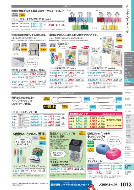クリップ・ゼムクリップ学習ペーパークラフト・素材イベント用品学習支援用品保育安全・安心OA・サプライ用品文具・事務用品日用品電子文具子筆記具筆記具修正用具正ファイルファイル穴をあけて穴をあけてとじるポケットにポケットに入れるとじ具でとじ具ではさみ込むボックス・ボックス・ケースス用途別用途別ファイルファイルサポート用品事務用務接着用品着事務用務ペーパーペーパー机上事務用品机上整理上用品用品綴じ枚数約15枚100個入❹色分け整理ができる豊富なカラーバリエーション!青セット赤セット綴じ枚数約100枚10個入クリップ[ソニック]カラーダブルクリップ中10個入商品種別お申込番号M価税抜税抜価格税込価格単位型式/GP-461-B青セット赤セット●クリップ幅/25mm●綴じ枚数/約100枚●材質/スチール(カラー塗装)●包装数:1/108-634-17018-634-1702¥198型式/GP-461-R¥217¥3601袋(10個入)各色2個特別な器具を使わず、すっと挟むだけ。●繰り返し使えるスライド式クリップ。●クランプ部で紙をはさみ、スライドさせると綴じられます。環境にやさしい、薄くて軽い紙のクリップです。●コピー用紙15枚までしっかりとめることができます。●書類と一緒にシュレッダーにかけられるので廃棄も楽々。❸綴じ枚数約60枚50個入綴じ枚数約15枚30個入30個入りも選べます!❶❷ホワイトが新登場!26mm綴じ枚数約30枚100個入15mm(Sサイズ)20mm(Lサイズ)サッとはさんでサッとはずせる。18mm[デビカ]紙のクリップ30個入[デビカ]紙のクリップ100個入お申込番号●8-634-8119商品種別アソートM価税抜¥400税抜価格¥280税込価格¥308単位1箱(30個入)お申込番号M価税抜税抜価格●8-634-8100¥1,100¥770税込価格¥847単位1箱(100個入)内容量/5色×各6個型式/063206商品種別アソート内容量/5色×各20個型式/063209●8-634-8120¥400¥280¥3081箱(30個入)●8-634-8118¥1,100¥770¥8471箱(100個入)商品種別ホワイト型式/063205商品種別ホワイト型式/063208●寸法/クリップサイズ:18幅)×26高)×1(厚)mm●材質/紙●日本製●包装数:1/10●寸法/クリップサイズ:18(幅)×26(高)×1(厚)mm●材質/紙●日本製●包装数:1/10ゼムクリップ100本入(極大・特大)ほぼ原寸1000本入(大・小)M価税抜¥480¥240¥1,000¥780税抜価格¥312¥175¥609¥486税込価格¥343¥192¥669¥534単位1箱(100本入)1箱(1000本入)49mm❺極大28mm❼大34mm❻特大24mm❽小商品種別お申込番号まとめ買いパック8-634-13988-634-13998-634-14008-634-1401極大特大大小●●●●※1組単位申込。税抜価格¥2,972¥1,508¥5,973¥4,658税込価格¥3,269¥1,658¥6,570¥5,123単位1組(100本入×10箱)1組(1000本入×10箱)散乱しやすいクリップをきれいに収納。約127本入取り出し口の部分は強力なマグネット式なので、磁石の作用によりゼムクリップが散乱せず、すばやく取り出せます。ゼムクリップ50g入り。収納口のマグネットが小さなクリップをしっかりキープ。引出しに入るコンパクトサイズ。約120本入ブルー[クラウン]マグネットボックス(磁石付クリップケース)お申込番号8-634-1316M価税抜¥380税抜価格¥259税込価格¥284単位1個(約127本入)商品種別型式/CR-GM4-B●寸法/44横)×44縦)×67高)mm●ゼムクリップ50g入●包装数:1/10ピンク鞄[プラス]クリップケース商品種別ブルーピンクM価税抜¥500型式/CP-500BL型式/CP-500PKお申込番号8-634-16948-634-1695税抜価格¥324税込価格¥356単位1個●寸法/76(幅)×62奥)×40(高)mm●材質/再生ポリスチレン●ゼムクリップ約120本入●包装数:1/10[文房堂]クリッピー100個入/50個入お申込番号M価税抜8-634-1115¥2,500商品種別Sサイズ税抜価格¥1,780税込価格¥1,958(100個入)クリップ幅/15mm、綴じ枚数/約30枚、型式/S100-SV単位1箱8-634-1116¥2,500¥1,780¥1,9581箱(50個入)クリップ幅/20mm、綴じ枚数/約60枚、型式/CL50-SV商品種別Lサイズ●包装数:1/8Sサイズ)、1/20Lサイズ)発明から100年以上!ペーパークリップのロングライフ商品。商品種別全長49mm、型式/CR-GM00-SL全長34mm、型式/CR-GM0-SL全長28mm、型式/CR-GM110-SL全長24mm、型式/CR-GM310-SLお申込番号8-634-13178-634-13188-634-13198-634-1320極大特大大小●●●●[クラウン]ゼムクリップ1箱●紙箱入●包装数:1/106色使い、きれいに整理。鉄線にカラービニールを巻いています。6色60本入28mm[クラウン]カラーゼムクリップ60本入お申込番号8-634-1315M価税抜¥230税抜価格¥173税込価格¥190単位1箱(60本入)商品種別型式/CR-GM100-X●寸法/全長28mm●金属製6色●包装数:1/20※カタログに掲載の商品情報(仕様・価格・税率など)は変更になる場合がございます。最新情報はUCHIDASww.uchidas.netwへ!Vol.201013