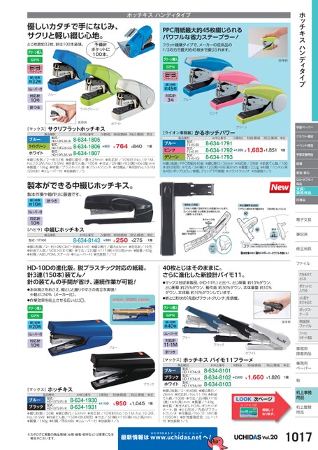ホッチキスハンディタイプ学習ペーパークラフト・素材イベント用品学習支援用品保育安全・安心OA・サプライ用品文具・事務用品日用品電子文具子筆記具筆記具修正用具正ファイルファイル穴をあけて穴をあけてとじるポケットにポケットに入れるとじ具でとじ具ではさみ込むボックス・ボックス・ケースス用途別用途別ファイルファイルサポート用品事務用務接着用品着事務用務ペーパーペーパー鞄机上事務用品机上整理上用品用品優しいカタチで手になじみ、サクリと軽い綴じ心地。とじ枚数約32枚、針は100本装填。予備針ポケットに100本。ホッチキスハンディタイプPPC用紙最大約45枚綴じられるパワフルな省力ステープラー!フラット機構タイプで、メーカーの従来品の1/2の力で最大約45枚まで綴じられます。使用例フラットクリンチ綴じ枚数約32枚リムーバー付対応針10号針つきブルーフラットクリンチ綴じ枚数約45枚対応針3号ブルーライトグリーンピンク[マックス]サクリフラットホッチキス使用例ホワイト商品種別お申込番号M価税抜税抜価格税込価格単位型式/HD-10FL3K/B型式/8-634-1805HD-10FL3K/LG8-634-1806HD-10FL3K/W8-634-1807ブルーライトグリーンホワイト●綴じ枚数/2〜約32枚●綴じ奥行/最大29mm●対応針/10号針(No.10-1M、No.10-2M、No.10-5M)●針装てん数/100本●寸法/28(幅)×83奥)×66(高)mm●質量/106g●材質/プラスチック、鉄●フラットクリンチ●付属品/専用針No.10-1M¥764¥840型式/¥9001個(200本)●リムーバー付●包装数:1/5製本ができる中綴じホッチキス。製本作業や箱作りに最適です。針つき綴じ枚数約10枚リムーバー付[ライオン事務器]かるホッチパワーグリーン商品種別お申込番号M価税抜税抜価格税込価格単位型式/FS-45(B)型式/FS-45P)型式/FS-45(G)ブルーピンクグリーン●綴じ枚数/PPC用紙約45枚●綴じ奥行/35mm●対応針/3号針●針装てん数/100本(針は別売)●寸法/34幅)×120(奥)×80(高)mm●質量/222g●材質/ハンドル:再生ABS・ポリプロピレン樹脂、グリップ:TPE樹脂●フラットクリンチ●包装数:1/58-634-17918-634-17928-634-1793¥1,980¥1,683¥1,8511個対応針10号[ハピラ]中綴じホッチキス商品種別型式/ST300お申込番号8-634-8143M価税抜¥300税抜価格¥250税込価格¥275単位1個●綴じ枚数/2〜約10枚(コピー用紙64/㎡)●綴じ奥行/最大65mm●対応針/10号●針装てん数/50本(45本付属)●寸法/22(幅)×117(奥)×50(高)mm●質量/69g●材質/ABS、POM、スチール●リムーバー付●包装数:1/12HD-10Dの進化版。脱プラスチック対応の紙箱。針3連(150本)装てん!針の装てんの手間が省け、連続作業が可能!●本体高さをおさえ、軽とじと握りやすさの両立を実現!※軽とじ50%(メーカー比)。●作業効率を向上させる広いとじ口。40枚とじはそのままに。さらに進化した新設計バイモ11。●マックス社従来製品(HD-11FL)と比べ、とじ荷重約10%ダウン、とじ衝撃約25%ダウン、動作音約30%ダウン、本体重量約10%ダウン、本体幅約10%ダウンしています。●新とじ形状の「先曲げフラットクリンチ」を搭載。綴じ枚数約20枚リムーバー付対応針10号ブルーブラック[マックス]ホッチキスM価税抜お申込番号商品種別型式/HD-10TLP)/B型式/HD-10TLP)/Kブルーブラック●綴じ枚数/20枚●綴じ奥行/53mm●対応針/10号針(No.10-1M、No.10-2M、No.10-5M)●針装てん数/150本(針は別売)●寸法/30(幅)×110(奥)×62(高)mm●質量/150g●材質/再生ABS●リムーバー付●包装数:1/58-634-19308-634-1931¥950¥1,045¥1,1501個税込価格税抜価格単位綴じ枚数約40枚リムーバー付対応針11-1M針つきブルーブラックホワイト[マックス]ホッチキスバイモ11フラーメ使用例税込価格単位お申込番号8-634-81018-634-81028-634-8103商品種別型式/HD-11FNL/B型式/HD-11FNL/K型式/HD-11FNL/Wブルーブラックホワイト●綴じ枚数/2〜約40枚●綴じ奥行/28mm●対応針/No.11-1M●針装てん数/100本●寸法/26幅)×110(奥)×68(高)mm●質量/149g●材質/再生ABS、POM、ポリカーボネート、鉄●とじ形状/先曲げフラットクリンチ●付属品/No.11-1M1箱(1000本)●針残量確認窓、リムーバ付●包装数:1/5M価税抜税抜価格¥2,000¥1,660¥1,8261個次ページホッチキス針掲載しております。※カタログに掲載の商品情報(仕様・価格・税率など)は変更になる場合がございます。最新情報はUCHIDASww.uchidas.netwへ!Vol.201017