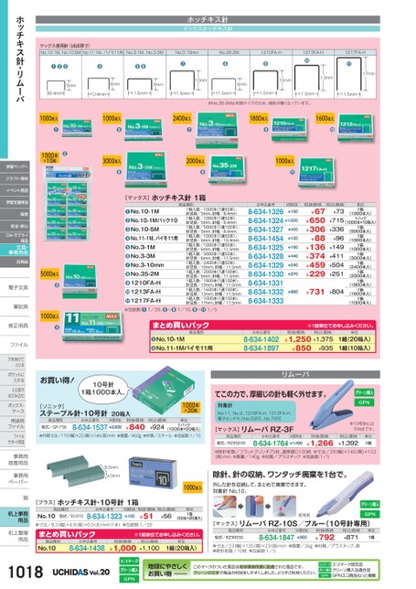 ホッチキス針マックスホッチキス針マックス使用針(ほぼ原寸)No.10-1M、No.10-5MNo.11-1M、バイモ11用No.3-1M、No.3-3MNo.3-10mmNo.35-2M1210FA-H●●●●●●●❼●●1213FA-H●5mm6mm6mm10mm6mm10mm13mm1217FA-H●17mm8.4mm10.4mm11.5mm11.5mm11.5mm11.5mm11.5mm11.5mm1000本入●●1000本×10箱1000本入●3000本入●※No.35-2Mは米国サイズのため、線形が細くなっています。2400本入●1800本入●1600本入●2000本入●1000本入●お申込番号M価税抜¥100¥160¥120¥4508-634-13268-634-1324¥1,0008-634-13278-634-14548-634-13258-634-13288-634-13298-634-13308-634-13318-634-13328-634-1333¥270¥860¥440¥540税抜価格¥67¥650¥306¥88¥136¥374¥459¥229税込価格¥73¥715¥336¥96¥149¥411¥504¥251¥731¥804単位1箱(1000本入)1パック(1000本×10箱入)1箱1箱1箱1箱1箱1箱1箱1箱1箱(5000本入)(1000本入)(1000本入)(3000本入)(2400本入)(2000本入)(1800本入)(1600本入)(1000本入)1箱入数/1000本(1連50本)、針足長/5mm、針幅/8.4mm1箱入数/1000本(1連50本)、針足長/5mm、針幅/8.4mm1箱入数/5000本(1連100本)、針足長/5mm、針幅/8.4mm1箱入数/1000本(1連50本)、針足長/6mm、針幅/10.4mm1箱入数/1000本(1連50本)、針足長/6mm、針幅/11.5mm1箱入数/3000本(1連50本)、針足長/6mm、針幅/11.5mm1箱入数/2400本(1連50本)、針足長/10mm、針幅/11.5mm1箱入数/2000本(1連100本)、針足長/6mm、針幅/11.5mm1箱入数/1800本(1連100本)、針足長/10mm、針幅/11.5mm1箱入数/1600本(1連100本)、針足長/13mm、針幅/11.5mm1箱入数/1000本(1連100本)、針足長/17mm、針幅/11.5mmNo.10-1MNo.10-1Mパック10No.10-5MNo.11-1M、バイモ11用No.3-1MNo.3-3MNo.3-10mmNo.35-2M1210FA-H1213FA-H1217FA-H●●●●●●●●●●●●包装数:●1/20、●〜●1/10、●〜●1/5[マックス]ホッチキス針1箱商品種別※1組単位申込。お申込番号8-634-14028-634-1897税抜価格税込価格¥1,250¥1,375¥935¥850単位1組(20箱入)1組(10箱入)まとめ買いパック商品種別No.10-1MNo.11-1Mバイモ11用●❹5000本入●1000本入●お買い得!10号針1箱1000本入。リムーバてこの力で、厚綴じの針も軽く外せます。[ソニック]ステープル針・10号針20箱入商品種別型式/GP-736お申込番号M価税抜8-634-1537¥2,200税抜価格¥840税込価格¥924(1000本×20箱入)●外箱寸法/110(幅)×25奥)×146高)mm●質量/460g●材質/スチール●包装数:1/10単位1パック1000本×20箱対象針No.11、No.3、1210FA-H、1213FA-H、電子ホッチキスNo.50FE、No.70FE[マックス]リムーバRZ-3F商品種別型式/RZ90039お申込番号M価税抜8-634-1764¥1,490※10号針には不向きです。税抜価格¥1,266税込価格¥1,392単位1個8.5mm4.9mm●除針枚数/フラットクリンチ75枚、通常綴じ100枚●寸法/28(幅)×140(奥)×102(高)mm●質量/140g●材質/プラスチック●包装数:1/5除針、針の収納、ワンタッチ廃棄を1台で。1000本入外した針を収納して、まとめて廃棄できます。対象針No.10。[プラス]ホッチキス針・10号針1箱商品種別お申込番号No.10●寸法/8.5幅)×4.9(高)×0.5(太)mm(1本)●包装数:1/208-634-1323型式/SS-010M価税抜税抜価格税込価格¥100¥51¥56単位1箱(50本×20連入)まとめ買いパックNo.108-634-1438お申込番号商品種別※1組単位申込。税抜価格¥1,000税込価格¥1,100単位1組(20箱入)使用例[マックス]リムーバRZ-10S/ブルー(10号針専用)お申込番号商品種別型式/RZ90050税込価格¥871●寸法/23(幅)×135(奥)×23(高)mm●質量/26g●材質/プラスチック、鉄●除針枚数/10枚●包装数:1/58-634-1847¥792M価税抜¥900税抜価格単位1個ホッチキス針・リムーバ学習ペーパークラフト・素材イベント用品学習支援用品保育安全・安心OA・サプライ用品文具・事務用品日用品電子文具電子文筆記具筆記具修正用具修正用ファイルファイル穴をあけて穴をあけてとじるポケットにポケットに入れるとじ具でとじ具ではさみ込むボックス・ボックス・ケース用途別用途別ファイルファイルサポート用品事務用事務接着用品接着用事務用事務用ペーパーペーパー鞄鞄机上事務用品机上整理机上整用品用品1018Vol.20地球にやさしくお買い物このマークのついた商品は地球環境保護に配慮された商品です。グリーンの文字で商品の判別をしやすくしました。どうぞご利用ください。エコマーク認定品グリーン購入法適合品GPNエコ商品ねっと掲載