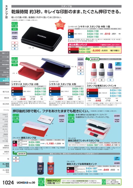乾燥時間約3秒。キレイな印影のまま、たくさん押印できる。スタンプ台軽い力で濃い印影。普通紙にすばやく乾いて水に流れない。※乾燥時間は、紙の種類やインク付着量により異なります。[シヤチハタ]シヤチハタスタンプ台中形1個商品種別お申込番号M価税抜税抜価格税込価格単位型式/HGN-2赤黒藍●インク/油性顔料●寸法/盤面:90(幅)×56(奥)mm●乾燥時間/約3秒●材質/蓋・底:再生ABS、枠:PBT再生樹脂●包装数:1/108-634-11588-634-11598-634-1160¥810¥891¥9001個※1組単位申込。税抜価格税込価格単位¥8,000¥8,8001組(10個入)詰め替え用スタンプ台専用スタンプインキ容量40mL油性顔料赤黒藍商品種別まとめ買いパック赤黒8-634-12978-634-1298お申込番号油性顔料乾燥時間約3秒藍黒赤大形藍お申込番号8-634-11618-634-11628-634-1163赤黒藍[シヤチハタ]スタンプ台専用スタンプインキ商品種別型式/SGN-40お申込番号8-634-11648-634-11658-634-1166中形黒油性顔料乾燥時間約3秒藍黒赤小形赤赤黒藍[シヤチハタ]シヤチハタスタンプ台小形商品種別[シヤチハタ]シヤチハタスタンプ台大形商品種別型式/HGN-1型式/HGN-3お申込番号8-634-11558-634-11568-634-1157赤黒藍筆記具筆記具M価税抜¥720税抜価格¥648税込価格¥712単位1個M価税抜¥990税抜価格¥891税込価格¥980単位1個●インク/油性顔料●寸法/盤面:63(幅)×40(奥)mm●乾燥時間/約3秒●材質/蓋・底:再生ABS、枠:PBT再生樹脂●包装数:1/10●インク/油性顔料●寸法/盤面:106(幅)×67(奥)mm●乾燥時間/約3秒●材質/蓋・底:再生ABS、枠:PBT再生樹脂●包装数:1/10M価税抜¥720税抜価格¥648税込価格¥712単位1個●インク/油性顔料●容量/40mL●スタンプ台エコス(HGシリーズ)への補充もできます●包装数:1/10押印後約3秒で乾く。フタをあけたままでも乾きにくい。※乾燥時間は、紙の種類やインク付着量により異なります。赤・黒便利な1台2役の省スペースタイプ!快適便利なワンタッチオープンのスタンプ台。油性顔料乾燥時間約3秒油性顔料乾燥時間約3秒黒赤[マックス]瞬乾スタンプ台M価税抜お申込番号商品種別型式/SA-201SEカミバコ型式/SA-202SEカミバコ黒赤●インク/超微粒子油性顔料●寸法/盤面:93(幅)×54奥)mm●質量/76g●乾燥時間/約3秒●材質/本体:再生ABS●包装数:1/10¥1,400¥1,190¥1,3098-634-18858-634-18861台税込価格単位税抜価格[マックス]瞬乾2段式ワンタッチスタンプ台商品種別型式/SA90247、SA‒212NWカミバコ8-634-1907¥2,300¥1,953¥2,1481台お申込番号M価税抜税抜価格税込価格単位●インク/超微粒子油性顔料●寸法/盤面:93幅)×54奥)mm●質量/128g●インク色/赤・黒●乾燥時間/約3秒●材質/本体:再生ABS樹脂●包装数:1/10[マックス]瞬乾スタンプ台専用補充インクお申込番号商品種別型式/SA-30クロカミバコ型式/SA-30アカカミバコ黒赤●インク/超微粒子油性顔料●容量/30mL●包装数:1/108-634-18878-634-1888¥1,000M価税抜容量30mL油性顔料税抜価格税込価格単位¥849¥9331本赤黒詰め替え用瞬乾スタンプ台、瞬乾2段式ワンタッチスタンプ台専用補充インクVol.20地球にやさしくお買い物このマークのついた商品は地球環境保護に配慮された商品です。グリーンの文字で商品の判別をしやすくしました。どうぞご利用ください。エコマーク認定品グリーン購入法適合品GPNエコ商品ねっと掲載スタンプ台学習ペーパークラフト・素材イベント用品学習支援用品保育安全・安心OA・サプライ用品文具・事務用品日用品電子文具電子文修正用具修正用ファイルファイル穴をあけて穴をあけてとじるポケットにポケットに入れるとじ具でとじ具ではさみ込むボックス・ボックス・ケース用途別用途別ファイルファイルサポート用品事務用事務接着用品接着用事務用事務用ペーパーペーパー鞄鞄机上事務用品机上整理机上整用品用品