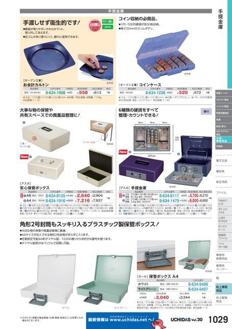 手提金庫学習ペーパークラフト・素材イベント用品学習支援用品保育安全・安心OA・サプライ用品文具・事務用品日用品電子文具子筆記具筆記具修正用具正ファイルファイル穴をあけて穴をあけてとじるポケットにポケットに入れるとじ具でとじ具ではさみ込むボックス・ボックス・ケースス用途別用途別ファイルファイルサポート用品事務用務接着用品着事務用務ペーパーペーパー鞄机上事務用品机上整理上用品用品手渡しせず衛生的です!●硬貨が取りやすいやわらかマット。取り外して洗えます。●足ゴムがあり滑りにくく、静かに使用できます。手提金庫コイン収納の必需品。●1円〜500円硬貨が各50枚収納。●厚さ32mmのスリムボディ。[オープン工業]お会計カルトン商品種別型式/KN-80-BUお申込番号8-634-1908使用例M価税抜¥620税抜価格¥558税込価格¥613単位1枚[オープン工業]コインケース商品種別型式/M-650お申込番号8-634-1236使用例M価税抜¥650税抜価格¥520税込価格¥572単位1個●寸法/170幅)×170奥)×25高)mm●材質/再生樹脂●質量/118g●包装数:1/10●寸法/150(幅)×125(奥)×32高)mm●材質/ポリプロピレン●1円〜500円硬貨各50枚収納●色/クリアブルー●包装数:1/40大事な物の保管や共有スペースでの貴重品管理に!6種類の硬貨をすべて整理・カウントできる!鍵付●三連ダイヤル錠●ワイヤー付き使用例●●[アスカ]安心保管ボックス商品種別お申込番号M価税抜●●8-634-8125¥4,400A6型式/SB50A4型式/SB2008-634-1916¥8,800税抜価格¥2,640¥7,216税込価格¥2,904¥7,937単位1台[アスカ]手提金庫商品種別使用例●●寸法/270幅)×190奥)×80高)mm、質量/約1.9kg、型式/MCB250寸法/270(幅)×190奥)×117高)mm、質量/2.4kg、型式/MCB370お申込番号M価税抜税抜価格税込価格単位¥9,500¥5,700¥6,2708-634-81178-634-1479¥10,000¥6,000¥6,6001台●寸法/❶外形寸法:200幅)×150奥)×80高)mm、内寸法:198幅)×148奥)×65高)mm、❷外形寸法:360幅)×253(奥)×110高)mm、内寸法:357幅)×247奥)×108(高)mm●質量/❶約840g、❷約2650g●材質/スチール●付属品/ワイヤー、スポンジ、取扱説明書●取っ手付き●ダイヤル錠(3桁)●包装数:1/20❶)、1/6❷)●寸法(内寸)/❸240幅)×164奥)×55高)mm(トレー内蔵時深さ:17mm)、❹240幅)×164(奥)×90高)mm(トレー内蔵時深さ:53mm)●材質/❸スチール、❹スチール、ABS●内容量/❸約2.1L、❹約3.5L●付属品/鍵2本、取扱説明書●取っ手付き●収納書類サイズ/A5●❸鍵錠のロック、❹ダイヤル錠と鍵錠の二重ロック●包装数:1/12❸)、1/8❹)角形2号封筒もスッキリ入るプラスチック製保管ボックス!●大切な物の保管や貴重品管理に最適。●A4サイズが封入できる角形2号封筒が折らずに入ります。●任意設定可能な4桁ダイヤル錠。10,000通りからお好きな番号を選べます。●ダイヤル錠部分はバックルで目隠し可能。[カール]保管ボックスA4商品種別ホワイトライトグリーン型式/HBP-200-W型式/HBP-200-U使用例お申込番号8-634-94068-634-9407ホワイトライトグリーンM価税抜¥3,800税抜価格¥3,040税込価格¥3,344単位1台●寸法/370(幅)×286(奥)×77(高)mm●内寸/350(幅)×245(奥)×68(高)mm●質量/970g●材質/ABS、SPCC●施錠/4桁ダイヤル錠(任意設定可能)●収納サイズ/A4(角形2号封筒収納可能)●包装数:1/6※カタログに掲載の商品情報(仕様・価格・税率など)は変更になる場合がございます。最新情報はUCHIDASww.uchidas.netwへ!Vol.201029