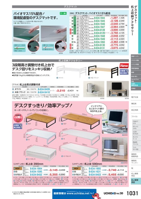 デスクマット・机上収納アクセサリー学習ペーパークラフト・素材イベント用品学習支援用品保育安全・安心OA・サプライ用品文具・事務用品日用品筆記具筆記具修正用具正ファイルファイル穴をあけて穴をあけてとじるポケットにポケットに入れるとじ具でとじ具ではさみ込むボックス・ボックス・ケースス用途別用途別ファイルファイルサポート用品事務用務接着用品着事務用務ペーパーペーパー鞄机上事務上用品品机上整理用品使用例電子文具子使用例⓱使用例⓰●使用例M価税抜税抜価格税込価格単位¥4,400¥3,740¥4,114¥6,500¥5,455¥6,0001台デスクマットバイオマス15%配合!環境配慮型のデスクマットです。※マウスの種類によっては反応が悪い場合があります。※●〜●は下敷きがありません。上敷マット:1.2mm下敷:1.3mm上敷マット:1.2mm※下敷はありません。使用例使用例[森松]デスクマットバイオマス15%配合下敷き商品種別お申込番号M価税抜税抜価格税込価格単位●●●●●●●●●●●緑なし寸法/990横)×690縦)mm、寸法/990(横)×590縦)mm、寸法/900(横)×600縦)mm、寸法/1190(横)×590縦)mm、寸法/1390(横)×690縦)mm、寸法/600(横)×450縦)mm、質量/449g、型式/051-10DM-MBW8-634-1944質量/923g、型式/051-11DM-007BW8-634-1945質量/977g、型式/051-12DM-106BW8-634-1946質量/1134g、型式/051-13DM-107BW8-634-1947質量/1878g、型式/051-14DM-126BW8-634-8128質量/2566g、型式/051-15DM-147BW8-634-8129質量/850g、型式/051-05DM-007BS8-634-1948質量/920g、型式/051-06DM-106BS8-634-1949質量/1008g、型式/051-02DM-107BS8-634-1950質量/1112g、型式/051-07DM-126BS8-634-8130質量/1519g、型式/051-08DM-147BS8-634-8131寸法/1390横)×690縦)mm、寸法/1190横)×590縦)mm、寸法/900横)×600縦)mm、寸法/990横)×590縦)mm、寸法/990(横)×690縦)mm、オープン¥1,297¥1,426¥2,128¥2,340¥2,540¥2,794¥2,564¥2,820¥3,000¥3,300¥3,750¥4,125¥2,048¥2,252¥2,112¥2,323¥2,362¥2,598¥2,775¥3,052¥3,675¥4,0421枚1枚●材質/上敷:ポリ塩化ビニル(1.2mm透明)、●〜●下敷:不織布(1.3mmグリーン)●非転写処理の有無/有●光学マウス可否/可●バイオマス15%配合●包装数:1/103段階高さ調整付き机上台でデスク回りをスッキリ収納!●高さを活かした収納ができます。●耐荷重10kgのため事務用品の収納にピッタリです。机上収納アクセサリー●ホワイト●木目/ブラック[アスカ]机上台高さ調整付き商品種別お申込番号M価税抜税抜価格税込価格単位型式/DSK07W⓬ホワイト⓭木目/ブラック●高さ調整/3段階(80・120・160mm)●寸法/500幅)×250奥)×160高)mm●質量/約1.8kg●材質/天板:合成樹脂化粧MDF(メラミン樹脂)、フレーム:スチール●付属品/取扱説明書、六角レンチ、目隠しシール●耐荷重/10kg●要組立●包装数:1/58-634-9409オープン8-634-9410¥2,210型式/DSK07BK¥2,4311台デスクすっきり!効率アップ!キーボードやノートパソコンの収納に。インテリアになじむウッド調のMDF机上台。590mm590mm590mm63mmmm052●MDFmm05267mm●白mm05280mm80mm100mm●白・引出し付390mm390mm390mm63mm67mmmm052●MDFmm05280mm●白80mmmm052100mm●白・引出し付※カタログに掲載の商品情報(仕様・価格・税率など)は変更になる場合がございます。最新情報はUCHIDASww.uchidas.netwへ!Vol.20●寸法/390(幅)×250奥)×80(高)mm(●は100(高)mm)●有効内寸/●:345(幅)×250(奥)×63(高)mm、●:360(幅)×250(奥)×67(高)mm●質量/●:1450g、⓯:1290g、●:2000g●材質/●:天板:MDF、脚:スチール、●●:スチール●耐荷重/15kg(等分布)●引出し仕様/内寸:335(幅)×235奥)×74高)mm、材質:ABS樹脂(引出し)・硬質塩ビ(レール)●お客様組立商品(工具付)●包装数:●:1/6、●:1/10、●:1/5●寸法/590(幅)×250奥)×80(高)mm(●は100(高)mm)●有効内寸/●:545(幅)×250(奥)×63(高)mm、●:560(幅)×250(奥)×67(高)mm●質量/●:2000g、●:1680g、●:2150g●材質/●:天板:MDF、脚:スチール、●●:スチール●耐荷重/15kg(等分布)●引出し仕様/内寸:537(幅)×226(奥)×30(高)mm、材質:ABS樹脂(引出し)・硬質塩ビ(レール)●お客様組立商品(工具付)●包装数:●:1/5、●:1/6、●:1/4[LIHITLAB.]机上台590mmお申込番号8-634-19058-634-16318-634-9403商品種別型式/A8001-9型式/A7332-0型式/A7338-0MDF白白・引出し付●●⓳お申込番号8-634-19048-634-15958-634-9402M価税抜税抜価格税込価格単位¥3,700¥3,145¥3,459¥6,300¥5,355¥5,8901台商品種別型式/A8003-9型式/A7330-0型式/A7341-0MDF白白・引出し付●●●[LIHITLAB.]机上台390mm