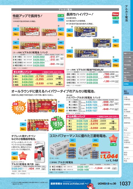 アルカリ電池学習ペーパークラフト・素材イベント用品学習支援用品保育安全・安心OA・サプライ用品文具・事務用品日用品電化消耗品工具・具・作業用品業収納用品納雨具・具・生活雑貨活飼育・育・園芸用品芸清掃用品掃トイレレ用品品ティッシュティッシュペーパー・パタオルル洗面所・洗面所・洗濯用品濯保健室保健室飲料・料・食品食品キッチンキッチン用品品税抜価格税込価格¥698¥767¥568¥624¥648¥712単位1パック(4個入)1パック(8個入)[富士通]ハイパワーアルカリ乾電池1パック商品種別お申込番号M価税抜オープン単一(4個入)型式/単二(4個入)型式/単三(8個入)型式/単四(8個入)型式/LR20FH(4S)8-636-1524LR14FH(4S)8-636-1525LR6FH(8S)8-636-1526LR03FH(8S)8-636-1527⓲⓳●単三8個入お申込番号8-636-15298-636-15308-636-15318-636-1532※1組単位申込。税抜価格¥3,280¥2,670¥3,050税込価格¥3,608¥2,937¥3,355単位1組(20個入)1組(40個入)単一単二単三単四●●●電圧/1.5V●包装数:1/5まとめ買いパック商品種別単四1パックあたり610税込¥671税抜¥お得コストパフォーマンスに優れた三菱乾電池。単三40個入単四40個入※カタログに掲載の商品情報(仕様・価格・税率など)は変更になる場合がございます。最新情報はUCHIDASww.uchidas.netwへ!Vol.2010371パック(40個入)税抜¥1,044税込¥1,148お申込番号M価税抜税抜価格8-636-1497オープン¥1,0448-636-1498税込価格単位¥1,1481パック(40個入)●単三、40個入●単四、40個入[三菱電機]アルカリ乾電池商品種別●電圧/1.5V●包装数:1/10単三(40個入)型式/LR6N/4S単四(40個入)型式/LR03N/4S●●単位1パック(2個入)税込価格¥444[エナジャイザー]アルカリ乾電池単六形2個入お申込番号M価税抜税抜価格8-636-2401オープン¥404商品種別型式/E96-B2●電圧/1.5V●包装数:1/12単位税抜価格税込価格¥780¥8581パック¥680¥748(4個入)¥1,380¥1,5181パック(20個入)[オーム電機]Vアルカリ電池PREMIUM商品種別お申込番号M価税抜オープン単一(4個入)型式/LR20VPS4P単二(4個入)型式/LR14VPS4P単三(20個入)型式/LR6VPS20P単四(20個入)8-639-20328-639-20338-639-2034型式/LR03VPS20P8-639-2035⓯●●●●電圧/1.5V●包装数:1※1組単位申込。税抜価格¥2,750¥2,295¥2,530税込価格¥3,025¥2,524¥2,783単位1組(20個入)1組(80個入)アルカリ電池性能アップで長持ち!(当社従来品比)10年保存可能(保存条件JIS準拠)。●単一4個入●単三20個入1.5V●単二4個入●単四20個入[オーム電機]Vアルカリ乾電池1パックお申込番号8-639-20028-639-20038-639-20048-639-2005M価税抜税抜価格税込価格¥610¥671¥510¥561¥640¥704単位1パック(4個入)1パック(20個入)オープン長持ちハイパワー!●水銀0使用。●大電流域でも本領発揮。●10年保存可能(保存条件JIS準拠)。●単一4個入●単三20個入1.5V●単二4個入●単四20個入オールラウンドに使えるハイパワータイプのアルカリ乾電池。液漏れ防止構造で保存性能も10年で買い置きにも安心。商品種別型式/LR20VS4P単一(4個入)単二(4個入)型式/LR14VS4P単三(20個入)型式/LR6VS20P単四(20個入)型式/LR03VS20P●●●●●電圧/1.5V●包装数:1まとめ買いパック商品種別お申込番号8-636-25608-636-25618-636-25628-636-2563単一単二単三単四●●●●●単四8個入タブレット用タッチペンなどの小型機器用電池。タブレット用タッチペンやペンライトなどの小型機器に使われる、単四よりさらに小さいサイズの電池です。単六2個入単三1パックあたり610税込¥671税抜¥お得