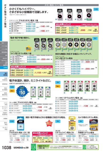 ボタン電池・コイン電池小さくてもハイパワー。さまざまな小型機器で活躍します。※商品のデザインが変更になる場合があります。1.5V※1組単位申込。税抜価格税込価格単位¥690¥7591組(5個入)3Vお申込番号8-636-11708-636-11718-636-1172商品種別型式/LR41P型式/LR43P型式/LR44P❶●●❶●●まとめ買いパック●●●●お申込番号8-636-11228-636-11238-636-11248-636-2347M価税抜税抜価格税込価格単位¥146¥1601個¥220¥198¥217商品種別用途/時計・電子体温計型式/LR41P用途/カメラ・電卓・ゲーム型式/LR43P用途/カメラ・電卓・ゲーム型式/LR44P用途/時計・電卓型式/LR1130P●●●●[パナソニック]アルカリボタン電池1個●電圧/1.5V●包装数:1/5電卓・電子手帳・時計に。※商品のデザインが変更になる場合があります。M価税抜¥550税抜価格税込価格単位¥409¥449¥330¥255¥2801個お申込番号8-636-22818-636-22828-636-23488-636-23498-636-23508-636-2351商品種別●電圧/3V●包装数:1/100型式/CR2477型式/CR3032型式/CR1220P型式/CR1616P型式/CR-1632型式/CR-2450●●●●●●3V2個入●●●●●❿⓫⓬●多彩な機器に対応する幅広いラインアップ。[パナソニック]コイン型リチウム電池お申込番号8-636-00238-636-00248-636-0025M価税抜税抜価格税込価格単位¥330¥255¥2801個[パナソニック]コイン型リチウム電池1個商品種別用途/電卓・電子手帳・時計型式/CR2016P用途/電卓・電子手帳型式/CR2025P用途/電卓・電子手帳・ゲーム型式/CR2032P●●●●電圧/3V●包装数:1/5※1組単位申込。税抜価格税込価格単位¥1,152¥1,2671組(5個入)お申込番号8-636-11738-636-11748-636-1175まとめ買いパック商品種別型式/CR2016P型式/CR2025P型式/CR2032P●●●電子体温計、時計、ミニライトなどに。水銀0ゼロ)使用・誤飲対策パッケージ。※⓮⓯のみ●●●1.5V1個あたり50税込¥55税抜¥1.5V2個入時計・電子手帳などの小型機器に対応する電池。カメラ用のリチウム電池。3V3V※商品のデザインが変更になる場合があります。●●●●●[オーム電機]リチウムボタン電池2個商品種別M価税抜税抜価格税込価格単位オープン¥138¥1511組(2個入)お申込番号8-639-20068-639-20078-639-20088-639-20158-639-2016型式/CR1616B2P型式/CR1632B2P型式/CR2016B2P型式/CR2025B2P型式/CR2032B2P●●●●●●電圧/3V●包装数:1税抜価格税込価格単位¥100¥138¥110¥1511組(2個入)お申込番号8-639-20008-639-20018-639-2009M価税抜オープン[オーム電機]アルカリボタン電池2個商品種別型式/LR41B2P型式/LR44B2P型式/LR1130B2P●●●●電圧/1.5V●包装数:11.5V[富士通]アルカリボタン電池1.5V1個商品種別型式/LR44Cお申込番号8-636-1055M価税抜¥200税抜価格¥138税込価格¥151単位1個●電圧/1.5V●包装数:1/5まとめ買いパック※1組単位申込。商品種別型式/LR44C税抜価格¥653税込価格¥718お申込番号8-636-1176単位1組(5個入)[富士通]リチウムコイン電池3V[パナソニック]円筒形リチウム電池商品種別型式/CR2032お申込番号8-636-1054M価税抜¥300税抜価格¥186税込価格¥204単位1個●電圧/3V●包装数:1/5商品種別用途/カメラ型式/CR-123AWM価税抜オープン●電圧/3V●包装数:1¥754税抜価格お申込番号8-636-1210税込価格¥829単位1個1038Vol.20地球にやさしくお買い物このマークのついた商品は地球環境保護に配慮された商品です。グリーンの文字で商品の判別をしやすくしました。どうぞご利用ください。エコマーク認定品グリーン購入法適合品GPNエコ商品ねっと掲載ボタン電池・コイン電池学習ペーパークラフト・素材イベント用品学習支援用品保育安全・安心OA・サプライ用品文具・事務用品日用品電化消耗品工具・工具作業用品作業用収納用品収納用雨具・雨具生活雑貨生活雑飼育・飼育園芸用品園芸用清掃用品清掃用トイレトイ用品用品ティッシュティッシュペーパー・タオルタオル洗面所・洗面所・洗濯用品洗濯用保健室保健室飲料・飲料食品食品キッチンキッチン用品用品