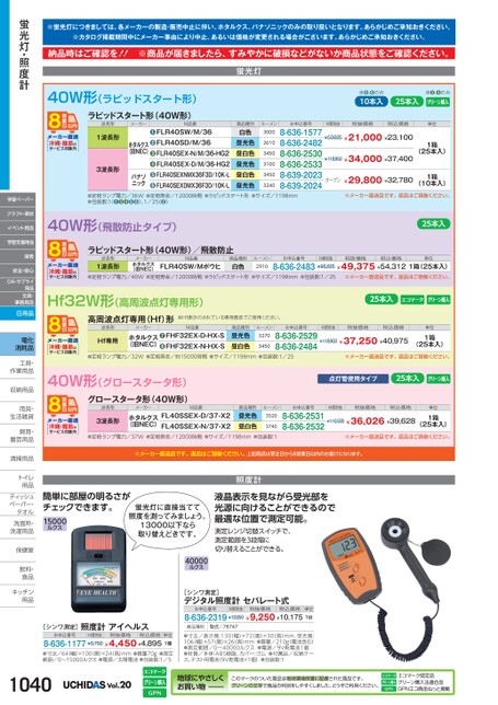 ※蛍光灯につきましては、各メーカーの製造・販売中止に伴い、ホタルクス、パナソニックのみの取り扱いとなります。あらかじめご承知おきください。※カタログ掲載期間中にメーカー事由により中止、あるいは価格が変更される場合がございます。あらかじめご承知おきください。納品時はご確認を!!※商品が届きましたら、すみやかに破損などがないか商品状態をご確認ください。40W形(ラピッドスタート形)ラピッドスタート形(40W形)波長形メーカーM品番沖縄・離島はサービス対象外1波長形3波長形❶FLR40SW/M/36❷FLR40SD/M/36❸FLR40SEX-N/M/36-HG2❹FLR40SEX-D/M/36-HG2❺FLR40SEXNMX36F3D/10K-L❻FLR40SEXDMX36F3D/10K-Lホタルクス(旧NEC)パナソニック蛍光灯商品種別白色昼光色昼白色昼光色昼白色昼光色ルーメン300026103450310034503240お申込番号8-636-15778-636-24828-636-25308-636-25338-639-20238-639-2024●定格ランプ電力/36W●定格寿命/12000時間●ラピッドスタート形●サイズ/1198mm●包装数:1●●●●●)、1/25(●)40W形(飛散防止タイプ)※●、●のみ10本入25本入※●、●のみM価税抜税抜価格税込価格単位¥53,625¥21,000¥23,100¥118,950¥34,000¥37,4001箱(25本入)オープン¥29,800¥32,7801箱(10本入)※メーカー直送品です。返品はご容赦ください。25本入ラピッドスタート形(40W形)/飛散防止波長形1波長形メーカーホタルクス(旧NEC)M品番FLR40SW/Mボウヒ商品種別白色ルーメン2910沖縄・離島はサービス対象外●定格ランプ電力/40W●定格寿命/12000時間●ラピッドスタート形●サイズ/1198mm●包装数:1/25お申込番号M価税抜税抜価格税込価格8-636-2483¥95,225¥49,375¥54,3121箱(25本入)※メーカー直送品です。返品はご容赦ください。単位Hf32W形(高周波点灯専用形)25本入高周波点灯専用(Hf)形波長形メーカーM品番Hf専用ホタルクス(旧NEC)❼FHF32EX-D-HX-S❽FHF32EX-N-HX-S※Hf表示のされている専用器具でご使用ください。商品種別昼光色昼白色ルーメン32703450お申込番号8-636-25298-636-2484M価税抜税抜価格税込価格単位¥118,950¥37,250¥40,9751箱(25本入)●定格ランプ電力/32W●定格寿命/約15000時間●サイズ/1198mm●包装数:1/25※メーカー直送品です。返品はご容赦ください。沖縄・離島はサービス対象外40W形(グロースタータ形)点灯管使用タイプ25本入沖縄・離島はサービス対象外グロースタータ形(40W形)波長形メーカー3波長形ホタルクス(旧NEC)M品番FL40SSEX-D/37-X2FL40SSEX-N/37-X2商品種別昼光色昼白色ルーメン35203740お申込番号8-636-25318-636-2532M価税抜税抜価格税込価格単位¥110,500¥36,026¥39,6281箱(25本入)●定格ランプ電力/37W●定格寿命/12000時間●サイズ/1198mm●包装数:1※メーカー直送品です。返品はご容赦ください。※メーカー直送品です。返品はご容赦ください。上記商品は受注日から8営業日以内のお届けになります。簡単に部屋の明るさがチェックできます。15000ルクス蛍光灯に直接当てて照度を測ってみましょう。13000以下なら取り替えどきです。照度計液晶表示を見ながら受光部を光源に向けることができるので最適な位置で測定可能。測定レンジ切替スイッチで、測定範囲を3段階に切り替えることができる。40000ルクス[シンワ測定]デジタル照度計セパレート式お申込番号M価税抜税抜価格税込価格単位8-636-2319¥12,650¥9,250¥10,1751台商品種別型式/78747●寸法/表示側:130(幅)×72(奥)×30(高)mm、受光側:106(幅)×57奥)×26(高)mm●質量/210g電池含む)●測定範囲/0〜40000ルクス●電源/9V乾電池1個●材質/本体:ABS樹脂、カバー:ゴム●付属品/収納ケース、テスト用電池(9V乾電池×1個)●包装数:1[シンワ測定]照度計アイヘルスお申込番号M価税抜税抜価格税込価格単位8-636-1177¥5,750¥4,450¥4,8951個●寸法/64(幅)×100(奥)×24(高)mm●質量70g●測定範囲/0〜15000ルクス●電源/太陽電池●包装数:1/5蛍光灯・照度計学習ペーパークラフト・素材イベント用品学習支援用品保育安全・安心OA・サプライ用品文具・事務用品日用品電化消耗品工具・工具作業用品作業用収納用品収納用雨具・雨具生活雑貨生活雑飼育・飼育園芸用品園芸用清掃用品清掃用トイレトイ用品用品ティッシュティッシュペーパー・タオルタオル洗面所・洗面所・洗濯用品洗濯用保健室保健室飲料・飲料食品食品キッチンキッチン用品用品1040Vol.20地球にやさしくお買い物このマークのついた商品は地球環境保護に配慮された商品です。グリーンの文字で商品の判別をしやすくしました。どうぞご利用ください。エコマーク認定品グリーン購入法適合品GPNエコ商品ねっと掲載