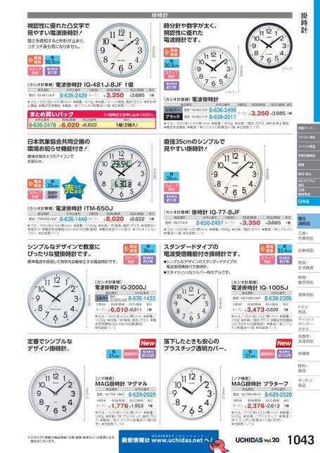 掛時計学習ペーパークラフト・素材イベント用品学習支援用品保育安全・安心OA・サプライ用品文具・事務用品日用品電化消耗品工具・具・作業用品業収納用品納雨具・具・生活雑貨活飼育・育・園芸用品芸清掃用品掃トイレレ用品品ティッシュティッシュペーパー・パタオルル洗面所・洗面所・洗濯用品濯保健室保健室飲料・料・食品食品キッチンキッチン用品品ブラック305mmシルバー電波受信径30.5cmステップ秒針電池寿命約1年[カシオ計算機]電波掛時計商品種別お申込番号M価税抜税抜価格税込価格単位型式/IQ-482J-8JF8-636-2496オープン¥3,350¥3,6851個シルバーブラック●寸法/305(径)×49厚)mm●質量/800g●材質/風防:ガラス●秒針停止機能●電波受信機能●電源/単三アルカリ乾電池×1個●包装数:1/10型式/IQ-482J-1JF8-639-2017税込価格¥3,685単位1個350mm直径35cmのシンプルで見やすい掛時計!径35cmスムーズ秒針電池寿命約1年[カシオ計算機]掛時計IQ-77-8JF商品種別型式/IQ-77-8JFお申込番号M価税抜8-636-2497オープン税抜価格¥3,350●寸法/350(径)×45(厚)mm●質量/890g●材質/風防:ガラス●電源/単三アルカリ乾電池×1個●包装数:1/5スタンダードタイプの電波受信機能付き掛時計です。●シンプルなデザインのスタンダードタイプの電波受信機能付き掛時計。●スタイリッシュなシルバー枠モデルです。電波受信ステップ秒針径32.4cm電池寿命約1年[カシオ計算機]電波掛時計IQ-1005J商品種別型式/IQ-1005J-8JFお申込番号8-636-2306M価税抜税抜価格税込価格オープン¥3,473¥3,820単位1個324mm掛時計時分針や数字が太く、視認性に優れた電波時計です。305mm単位1個視認性に優れた凸文字で見やすい電波掛時計!暗さを感知すると秒針が止まり、コチコチ音も気になりません。電波受信ステップ秒針径30.5cm電池寿命約1年[カシオ計算機]電波掛時計IQ-481J-8JF1個商品種別型式/IQ-481J-8JFお申込番号M価税抜8-636-2429オープン税抜価格¥3,350税込価格¥3,685●寸法/305(径)×49(厚)mm●質量/810g●材質/ケース:樹脂、風防:ガラス●秒針停止機能●電波受信機能●電源/単三アルカリ乾電池×1個●包装数:1/10まとめ買いパック8-636-2478お申込番号¥6,020税抜価格※1組単位申込。税込価格¥6,622単位1組(2個入)350mm税込価格¥8,822単位1個日本気象協会共同企画の環境お知らせ機能付き!環境状態を4つのアイコンでお知らせ。電波受信ステップ秒針径35cm温度計湿度計[カシオ計算機]電波掛時計ITM-650J商品種別型式/ITM-650J-8JFお申込番号M価税抜8-636-1440オープン税抜価格¥8,020●寸法/350径)×54(厚)mm●質量/1500g●材質/枠:樹脂、風防:ガラス●温度計+湿度計付●電波受信機能(60/40kHz自動選局)●電波受信マーク表示●フルオートカレンダー●包装数:1/5シンプルなデザインで教室にぴったりな壁掛時計です。標準電波を受信して時刻を自動修正する電波時計です。電波受信ステップ秒針径36cm電池寿命約3年●寸法/360(径)×54(厚)mm●質量/1500g●材質/枠:樹脂、風防:ガラス●電波受信機能(60/40kHz自動選局)●包装数:1/5●寸法/324(径)×52(厚)mm●質量/790g●材質/風防:ガラス●電波受信機能(40/60KHz自動選局)●電源/単三アルカリ乾電池×1個●包装数:1/5落下したときも安心のプラスチック透明カバー。径31cm連続秒針電池寿命約10カ月径31cm連続秒針電池寿命約10カ月[ノア精密]MAG掛時計プラターフ商品種別型式/W-798WH-Zお申込番号8-639-2028単位1個税抜価格税込価格¥2,376¥2,613M価税抜オープン●寸法/310(径)×53(厚)mm●質量/500g●材質/プラスチック●電源/単三マンガン乾電池×1個(別売)●包装数:1/12310mm[ノア精密]MAG掛時計マグマル商品種別型式/W-759SM-Zお申込番号8-639-2029単位1個税込価格税抜価格¥1,776¥1,953M価税抜オープン●寸法/310(径)×53(厚)mm●質量/580g●材質/枠:プラスチック、風防:ガラス●電源/単三マンガン乾電池×1個(別売)●包装数:1/12[カシオ計算機]電波掛時計IQ-2000JシルバーM価税抜商品種別型式/お申込番号IQ-2000J-8JF8-636-1433税抜価格税込価格オープン¥6,010¥6,611単位1個360mm310mm定番でシンプルなデザイン掛時計。※カタログに掲載の商品情報(仕様・価格・税率など)は変更になる場合がございます。最新情報はUCHIDASww.uchidas.netwへ!Vol.201043
