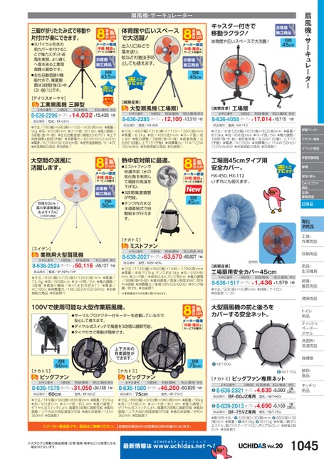 扇風機・サーキュレーター学習ペーパークラフト・素材イベント用品学習支援用品保育安全・安心OA・サプライ用品文具・事務用品日用品電化消耗品工具・具・作業用品業収納用品納雨具・具・生活雑貨活飼育・育・園芸用品芸清掃用品掃トイレレ用品品ティッシュティッシュペーパー・パタオルル洗面所・洗面所・洗濯用品濯保健室保健室飲料・料・食品食品キッチンキッチン用品品扇風機・サーキュレーター体育館や広いスペースで大活躍!出入り口などで風を送り、蚊などの害虫予防としても使えます。沖縄・離島はサービス対象外羽径45cm沖縄・離島はサービス対象外羽径43.5cmキャスター付きで移動ラクラク!体育館や広いスペースで大活躍!羽径45cm三脚が折りたたみ式で移動や片付けが楽にできます。●スパイラル形状の前カバーを付けることで強力スポット送風を実現。より遠くへ風を送る工業扇風機三脚型です。●左右自動首振り機能付きで、風量調節は3段階「強(3)・中(2)・弱(1)」です。[アイリスオーヤマ]工業扇風機三脚型お申込番号M価税抜税抜価格税込価格8-636-2296オープン¥14,032¥15,435単位1台商品種別型式/KF-431S●寸法/790(幅)×690(奥)×1120〜1430(高)mm●質量/5kg●羽/435(径)mm●コード長/約1.8m●風力調整/3段階(強・中・弱)●左右自動首振り機能付(約75°)●上下角度調整4段階(手動)●消費電力/80/95W(50/60Hz)●電源/AC100V(50/60Hz共用)●使用温度範囲/0〜40℃●お客様組立商品●包装数:1大空間の送風に活躍します。沖縄・離島はサービス対象外羽径50cm税込価格単位¥55,1271台羽径50cm!風の到達範囲はおよそ17m。(※60Hz地区)[スイデン]業務用大型扇風機お申込番号M価税抜8-636-2524オープン税抜価格¥50,116商品種別型式/SF-50FS-1VP●寸法/850(幅)×735(奥)×1260(高)mm●質量/13.1kg●羽/50(径)cm●コード長/2m●風力調整/3段階●首振り機能/あり(左右合計87°)●電源/AC100V●消費電力/180/265W(50/60Hz)●お客様組立商品●包装数:1[鯛勝産業]大型扇風機(工場扇)お申込番号M価税抜税抜価格8-636-2285オープン¥12,100¥13,310税込価格単位1台[鯛勝産業]工場扇お申込番号M価税抜税抜価格税込価格8-636-4055オープン¥17,014¥18,715単位1台商品種別型式/HX-450商品種別型式/HX-112●寸法/490(幅)×310(奥)×1110〜1300(高)mm●質量/6.2kg●羽/450(径)mm●コード長/約2.4m●風力調整/3段階(強・中・弱)●首振角度/左右80°(自動)、上下15°(手動)●消費電力/114/123W(50/60Hz)●お客様組立商品●包装数:1●寸法/本体:520(幅)×835奥)×820(高)mm●質量/約7.3kg●羽/450径)mm●コード長/5m●風力調整/3段階(強・中・弱)●首振角度/左右80°(自動)、上下15°(手動)●電源/AC100V●消費電力/114W(50Hz)/123W(60Hz)●お客様組立商品●包装数:1熱中症対策に最適。●ミスト+ファンで快適冷却(水の気化熱を利用して周囲の気温を下げる)。●3段階風量調整が可能。●タンク内の水は水道直結式で自動給水が行えます。工場扇45cmタイプ用安全カバー。HX-450、HX-112いずれにも使えます。沖縄・離島はサービス対象外羽径45cm[ナカトミ]ミストファンお申込番号M価税抜税抜価格8-639-2027オープン¥63,570¥69,927税込価格単位1台商品種別型式/MISF-45N●寸法/1120幅)×950(奥)×1485〜1700(高)mm●質量/本体:10.5kg、タンク:約8.3kg●羽/450径)mm●コード長/本体:約2.4m、タンク:約5m●風力調整/3段階(強・中・弱)●風向調整/首振り角度:約80°、首折れ:4段階●消費電力/単相100V(50/60Hz)●タンク容量/約25L●包装数:1※季節商品のため台数に限りがあります。使用例[鯛勝産業]工場扇用安全カバー45cmお申込番号M価税抜税抜価格税込価格8-636-1517オープン¥1,436¥1,579単位1枚●寸法/500径)×10厚)mm●材質/ナイロン●包装数:1/20大型扇風機の前と後ろをカバーする安全ネット。100Vで使用可能な大型作業扇風機。●サーマルプロテクター付モーターを搭載しているので、安心して使えます。●ダイヤル式スイッチで風量を3段階に調節可能。●タイヤ付きで移動が簡単です。羽径60cm[ナカトミ]ビッグファン上下方向の角度調整ができます。[ナカトミ]ビッグファン沖縄・離島はサービス対象外羽径75cm●NET-60Gお申込番号M価税抜税抜価格8-636-1579オープン¥31,050¥34,155税込価格単位1台お申込番号M価税抜税抜価格税込価格8-636-1580オープン¥46,200¥50,820単位1台商品種別60cm型式/BF-60JZ商品種別75cm型式/BF-75VZ●寸法/745幅)×360(奥)×830高)mm●質量/23.5kg●羽/60径)cm●コード長/約2.4m●風力調整/ダイヤル式スイッチにより、風量を3段階に調節可能●風向調整/上下方向の角度調整が可能●適応床面積/745×360mm●包装数:1●寸法/890(幅)×360奥)×980(高)mm●質量/30kg●羽/75(径)cm●コード長/約2.4m●風力調整/ダイヤル式スイッチにより、風量を2段階に調節可能●風向調整/上下方向の角度調整が可能●適応床面積/890×360mm●包装数:1※メーカー直送品です。返品はご容赦ください。上記商品は受注日から8営業日以内のお届けになります。●NET-75G●商品種別●商品種別[ナカトミ]ビッグファン専用ネットお申込番号M価税抜税抜価格税込価格8-636-2321オープン¥4,630¥5,093単位1組(2枚入)BF-60JZ専用型式/NET-60G8-639-2013オープン¥4,690¥5,1591組(2枚入)BF-75