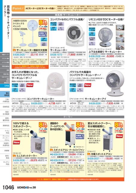 Point!ACモーターとDCモーターの違い扇風機で比較すると、ACモーターは、消費電力・運転音ともに大きいですが、比較的安価です。DCモーターは、消費電力・運転音が小さく、また風量を細かく調節できるという特徴があります。電気代は、一般的に1時間あたりACモーターが約0.5〜1円、DCモーターは約0.1〜0.6円程度です。冷暖房の空気をかくはんする45cmの大型強力扇風機。扇風機・サーキュレーターコンパクトなのにパワフル送風!リモコン付きでDCモーター仕様!適応床面積〜20畳羽径23cm左右首振りACモーター●上下90°、左右85°の首振りができます。●最大風速7.5m/sのパワフル風量。適応床面積〜32畳羽径19.5cm上下左右首振りDCモーター沖縄・離島はサービス対象外羽径45cm左右首振り[スイデン]サーキュレーター機能付大型扇お申込番号M価税抜税抜価格8-636-2425オープン¥23,110¥25,421税込価格単位1台[アイリスオーヤマ]サーキュレーターお申込番号M価税抜税抜価格税込価格8-636-1573オープン¥7,900¥8,690単位1台商品種別型式/NF-45V2MK商品種別型式/PCF-HM23-W●寸法/354(幅)×232(奥)×400(高)mm●質量/3kg●羽/23(径)cm●コード長/約1.4m●電源/AC100V(50/60Hz)●定格消費電力/28/29W(50/60Hz)●風量調整/3段階●風向調整/上下6段階(-20〜+90°)、左右自動首振り●適応床面積/20畳●包装数:1/2[スリーアールソリューション]上下左右首振りサーキュレーターお申込番号M価税抜8-636-2538¥9,990税抜価格¥9,500税込価格単位¥10,4501台商品種別型式/3R-SKR03●寸法/260幅)×237奥)×329高)mm●質量/1.7kg●羽/19.5(径)cm●コード長/1.5m●風量切替/12段階●風向調整/左右:85°、上下:90°●定格消費電力/22W●リモコン付属●適応床面積/32畳●包装数:1●寸法/510(幅)×510奥)×1050〜1290(高)mm●質量/11kg●羽/45(径)cm●角度調整/上下調節:70°●首振り機能/左右計75°●お客様組立商品●包装数:1※メーカー直送品です。返品はご容赦ください。上記商品は受注日から8営業日以内のお届けになります。お手入れが簡単になった、コンパクトでパワフルなサーキュレーター!風量は3段階(強・中・静音)の調節が可能。適応床面積〜8畳羽径左右首振りAC15cmモーターパワフルで大風量のコンパクトサーキュレーター!エアコンと併用して夏は涼しく冷気を部屋全体へ、冬は暖かい空気を足元へ一年中使えます。適応床面積〜18畳羽径15cm左右首振りACモーター[アイリスオーヤマ]コンパクトサーキュレーターお申込番号M価税抜税抜価格税込価格商品種別型式/PCF-HD15EC-W8-639-2031オープン¥4,738¥5,211ホワイト●寸法/242(幅)×175(奥)×290(高)mm●質量/1.6kg●羽/15(径)cm●コード長/約1.4m●電源/AC100V(50/60Hz)●定格消費電力/29/27W(50/60Hz)●風量調節/3段階(強・中・静音)●風向調整/左右:約80°、上下:上約90°、下約20°●左右自動首振り●適応床面積(目安)/8畳●包装数:1/6単位1台[アイリスオーヤマ]サーキュレーターアイ商品種別お申込番号M価税抜税抜価格税込価格型式/PCF-SC15-W8-639-2030オープン¥7,635¥8,398ホワイト●寸法/210(幅)×210奥)×290(高)mm●質量/1.9kg●羽/15径)cm●コード長/約1.4m●電源/AC100V(50/60Hz)●定格消費電力/首振固定時:33W/32W、首振時:36W/35W(50/60Hz)●風量調節/5段階(弱〜ターボ)●風向調整/左右:約90°、上下:水平〜約75°●左右自動首振り●適応床面積(目安)/18畳●包装数:1/4単位1台クーラー運動時のクールダウンや、熱中症対策に。沖縄・離島はサービス対象外100Vで使えるスポットクーラー。●環境に配慮した冷媒R32を採用。●チリやホコリの侵入を防ぐ全閉モーターを採用。夏はスポットクーラー、冬は補助暖房に。●自動首振り装置付きで、より広範囲に適度な冷風・温風を送れます。●「暖房」は、8〜22℃の範囲で使用可能です。沖縄・離島はサービス対象外●自動首振りあり沖縄・離島はサービス対象外税込価格¥148,500単位1台[ナカトミ]ミニスポットクーラーお申込番号8-639-2036M価税抜オープン型式/SAC-18商品種別税抜価格税込価格¥59,976¥65,973単位1台[スイデン]スポットエアコンクールスイファンお申込番号M価税抜❶8-639-2018オープン商品種別自動首振りあり❷8-639-2019オープン商品種別自動首振りなし税抜価格税込価格単位¥124,894¥137,3831台型式/SS-25DL-1T¥107,216¥117,9371台型式/SS-25EL-1T●寸法/475(幅)×275(奥)×610(高)mm●質量/23kg●コード長/1.8m●材質/スチール・ABS●電源/AC100V(50/60Hz)●冷房能力/1.6/1.8kW(50/60Hz)●消費電力/670/730W(50/60Hz)●風向調整/ダクト:360°(手動)●タンク容量/3L●包装数:1●寸法/396(幅)×397奥)×833(高)mm●質量/❶:34kg、❷:32kg●コード長/1.8m●材質/鉄・樹脂●電源/100V●冷房能力/2.3/2.8kW(50/60Hz)●消費電力/❶:0.78/0.92kW(50/60Hz)、❷:0.70/0.87kW(50/60Hz)●ドレンタンク容量/5L●お客様組立商品●包装数:1※屋内使用※屋内使用※屋内使用※メーカー直送品です。返品はご容赦ください。上記商品は受注日から8営業日以内のお届けになります。1046Vol.20[ナカトミ]冷暖スポットエアコンお申込番号M価税抜税抜価格8-639-2037オープン¥135,000商品種別型式/SAC-27HCS●寸法/390幅)×475奥)×855高)mm●質量/48kg●コード長/約2m●材質/スチール・樹脂●電源/AC100V●冷房能力/2.3