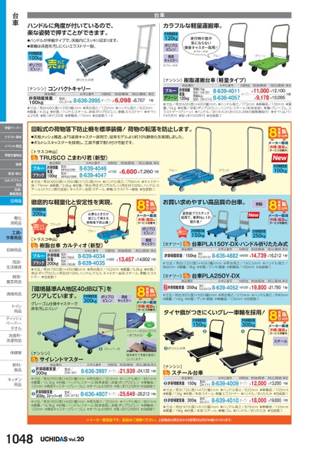 ハンドルに角度が付いているので、楽な姿勢で押すことができます。●ハンドルが伸縮タイプで、床面内にスッキリ収まります。●車輪は床面を汚しにくいエラストマー製。許容積載質量100kgポリプロピレン折りたたみ時台車カラフルな軽量運搬車。許容積載質量120kgポリプロピレン微音キャスター※ブルーのみ走行時の音が気にならない微音キャスター採用!※ブルーのみブルーグリーン[ナンシン]コンパクトキャリー商品種別お申込番号M価税抜税抜価格税込価格単位型式/CC-211K許容積載質量/100kg●寸法/荷台:600(長)×390(幅)mm●ハンドル高さ/820mm●質量/4.5kg●材質/ハンドル:スチール、床板:ポリプロピレン、車輪:エラストマー●すべり止2カ所●取っ手穴3カ所●車輪径/75mm●包装数:1/48-636-3995オープン¥6,098¥6,707●荷台高さ/125mm1台商品種別お申込番号[ナンシン]樹脂運搬台車(軽量タイプ)8-639-4011オープン型式/LSK-211G8-636-4057ブルーグリーン●寸法/荷台:600長)×400幅)mm●ハンドル高さ/775mm●車輪径/100mm●質量/6kg●材質/床板:ポリプロピレン、ハンドル:スチール(粉体塗装)、車輪:グレーゴム、エラストマー(グリーン)●ハンドル/折りたたみ(折りたたみ時の緩衝機能付)●すべり止パッド4カ所付●取っ手穴4カ所付●包装数:1¥11,000¥12,100¥9,178¥10,095質量6.5kg、型式/LSK-201質量6kg、許容積載質量/120kg税込価格単位税抜価格M価税抜1台回転式の荷物落下防止柵を標準装備!荷物の転落を防止します。●天板メッシュ構造、φ75省音キャスター採用で、従来モデルより約10%静音化を実現しました。●ボルトレスキャスターを採用し、工具不要で取り付け可能です。[トラスコ中山]TRUSCOこまわり君(新型)商品種別お申込番号M価税抜税抜価格税込価格単位許容積載質量/100kg型式/MPK6039B型式/MPK6039BKブルーブラック●寸法/荷台:600(長)×390幅)×125(高)mm●ハンドル高さ/790mm●キャスター径/75mm●質量/3.9kg●材質/荷台:再生ポリプロピレン(再生材100%)、ハンドル:スチール(メラミン焼付塗装)、キャスター金具:スチール、車輪:エラストマー樹脂●包装数:1¥6,600¥7,2601台8-639-40468-639-4047¥7,700徹底的な軽量化と安定性を実現。許容積載質量200kgブラック必要なときだけ起こして使える荷物落下防止柵!ブルー沖縄・離島はサービス対象外ポリプロピレン[トラスコ中山]樹脂台車カルティオ(新型)商品種別お申込番号M価税抜税抜価格許容積載質量/200kg型式/MPK-780-B型式/MPK-780-BKブルーブラック●寸法/荷台:780(長)×490幅)mm●荷台高さ/162mm●質量/6.8kg●材質/荷台:ポリプロピレン再生材100%、ハンドル:アルミ、キャスター金具:スチール、車輪:エラストマー●包装数:1¥13,457¥14,8021台8-639-40348-639-4035¥16,900「環境基準AA地区40dB以下」をクリアしています。許容積載質量300kgポリプロピレングレーゴム仕様キャスターで床を汚しにくい!●ブルーブラックお買い求めやすい高品質の台車。樹脂高性能プラスチック採用で、業界No.1の耐久性!沖縄・離島はサービス対象外許容積載質量100kg沖縄・離島はサービス対象外静音キャスター税込価格単位[カナツー]商品種別許容積載質量150kg台車PLA150Y-DX・ハンドル折りたたみ式許容積載質量250kgお申込番号M価税抜税抜価格税込価格単位型式/許容積載質量/150kg●寸法/荷台:720(長)×456(幅)mm●荷台高さ/145.5mm●ハンドル高さ/860mm●質量/9kg●材質/デッキ:樹脂●車輪径/100mm●包装数:1PLA150Y-DX8-636-4882¥20,600¥14,739¥16,2121台[カナツー]台車PLA250Y-DX商品種別許容積載質量/250kgお申込番号M価税抜税抜価格税込価格単位型式/PLA250Y-DX8-639-4052¥37,200¥19,800¥21,7801台微音キャスター沖縄・離島はサービス対象外ストッパーONストッパーのON/OFFが一目でわかる!●寸法/荷台:825(長)×500幅)mm●荷台高さ/215mm●ハンドル高さ/890mm●質量/14kg●材質/デッキ:樹脂●車輪径/130mm●包装数:1タイヤ痕がつきにくいグレー車輪を採用!許容積載質量150kg●許容積載質量300kg●沖縄・離島はサービス対象外スチール[ナンシン]サイレントマスター商品種別●許容積載質量/300㎏型式/DSK-301●ストッパー付●折りたたみ時簡単操作で車輪を確実にロックします!お申込番号M価税抜税抜価格税込価格単位8-636-3997オープン¥21,939¥24,1321台●寸法/荷台:900(長)×600(幅)mm●荷台高さ/203mm●ハンドル高さ/861mm●質量/15.3kg●材質/ハンドル:スチール(粉体塗装)、床面:ポリプロピレン●車輪径/125mm●微音キャスター(グレーゴム)●すべり止4カ所付●取っ手穴2カ所付●包装数:1●●8-636-4807オープン¥25,649¥28,213型式/DSK-301B2許容積載質量/300㎏、ストッパー付●寸法/荷台:900(長)×600(幅)mm●荷台高さ/203mm●ハンドル高さ/861mm●質量/16.9kg●材質/ハンドル:スチール(粉体塗装)、床面:ポリプロピレン●車輪径/125mm●微音キャスター(グレーゴム)●すべり止4カ所付●取っ手穴2カ所付●包装数:11台[ナンシン]スチール台車商品種別お申込番号M価税抜税抜価格型式/許容積載質量/150㎏DX-1118-639-4009オープン●●寸法/荷台:726(長)×470(幅)mm●ハンドル高さ/820mm●車輪径/100mm●質量/10㎏●材質/本体:スチール、車輪:エラストマー●ハンドル/折りたたみ●包装数:1●8-639-4010オープ