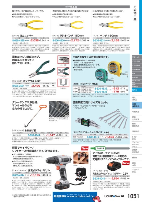その他工具単位1本握りやすく、切れ味の良いニッパーです。●鉄線・銅線類の切断作業に便利。●グリップは滑りにくいビニールコーティング。先端が細く、狭いところの作業に適しています。●鉄線・銅線類の切断作業に便利。●グリップは滑りにくいビニールコーティング。針金の切断や折り曲げに適しています。●鉄線・銅線類の切断作業に便利。●グリップは滑りにくいビニールコーティング。その他工具[ツノダ]強力ニッパーお申込番号M価税抜税抜価格税込価格8-636-4529¥2,500¥2,038¥2,241[ツノダ]ラジオペンチ150mmお申込番号M価税抜税抜価格税込価格8-636-4530¥2,560¥2,172¥2,389単位1本単位1本[ツノダ]ペンチ150mmお申込番号M価税抜税抜価格税込価格8-636-4531¥2,780¥2,188¥2,406商品種別型式/CN-125商品種別型式/RP-150商品種別型式/CP-150●寸法/132幅)×50(奥)×10高)mm、頭部:17幅)×10厚)mm、柄:50(幅)mm、先端:20(長)mm●質量/105g●材質/炭素鋼●切断能力/ステンレス線:直径1.0mm、鉄線:直径1.0mm、軟鉄線:直径1.8mm、銅線:直径2.6mm、より線:2.0mm2●包装数:1●寸法/161(幅)×52奥)×10高)mm、頭部:17幅)×10(厚)mm、柄:52幅)mm、先端:50(長)mm●質量/125g●材質/炭素鋼●切断能力/ステンレス線:直径1.0mm、鉄線:直径1.2mm、軟鉄線:直径2.0mm、銅線:直径2.6mm、より線:2.0mm2●包装数:1●寸法/163幅)×52奥)×10(高)mm、頭部:22(幅)×12厚)mm、柄:49(幅)mm、先端:25長)mm●質量/205g●材質/炭素鋼●切断能力/ステンレス線:直径1.2mm、鉄線:直径1.6mm、軟鉄線:直径2.6mm、銅線:直径3.2mm、より線:5.5mm2●包装数:1潰れたネジ、びたネジ、固着ネジをガッチリ掴んで外します。[エンジニア]ネジザウルスGTお申込番号M価税抜8-636-3531¥3,070税抜価格¥2,490税込価格¥2,739単位1本商品種別型式/PZ58●寸法/全長:160mm、グリップ幅:54mm、先端幅:17.5mm、グリップ厚み:15mm●質量/130g●材質/本体:S58C、グリップ:エラストマー●対応トラスネジ/先端くわえ部:φ3〜φ9.5、本体くわえ部:φ5.5〜φ10●刃部硬度/HRC56±2●包装数:1/5グレーチングや浄化槽、マンホールなどのふたの持ち上げに。カット作業バネひらき先端くわえ使用例細目のグレーチングにも対応した薄型仕様です。[ベストツール]もちあげ君商品種別お申込番号型式/ML-001税込価格¥1,701●寸法/115(幅)×350(長)mm●質量/350g●材質/S-50C●包装数:1/12※先端が尖っていますので、お取り扱いには十分注意を払ってください。※機械や重機に取り付けての作業は絶対にお止めください。8-636-4844オープン¥1,547税抜価格M価税抜単位1本さまざまなサイズ計測に便利です。●検査基準を保ちつつJIS1級を付けないことで価格を抑え、品質と価格を両立したメジャーです。●爪の厚み分の誤差を修正する移動爪仕様。3.5m学習ペーパークラフト・素材イベント用品学習支援用品5.5m保育[原度器]プロマートMKⅡ商品種別お申込番号M価税抜税抜価格寸法/63(幅)×33(奥)×65(高)mm、質量/145g、型式/MK1935寸法/63(幅)×35(奥)×70(高)mm、質量/195g、型式/MK19553.5m5.5m●テープ幅/19mm●仕様/テープロックレバー、減速ボタン、ショックアブソーバー、片面印刷、移動爪●材質/テープ:スチール●包装数:18-636-4532オープン¥612¥7798-636-4533税込価格単位¥673¥8561個使用頻度の高いサイズをセット。スパナタイプとメガネタイプがセットになったハイブリットタイプ。[豊光]コンビネーションスパナ6本組お申込番号商品種別型式/No.3050税込価格¥1,655●寸法/210(幅)×50(奥)×40(高)mm●質量/450g●材質/炭素工具鋼●包装数:1/5〈セット内容〉8、10、12、13、14、17mm8-636-4617オープン¥1,505税抜価格M価税抜単位1セット(6本組)安全・安心OA・サプライ用品文具・事務用品日用品電化化消耗品耗工具・作業用品収納用品納雨具・具・生活雑貨活飼育・育・園芸用品芸清掃用品掃トイレレ用品品ティッシュティッシュペーパー・パタオルル洗面所・洗面所・洗濯用品濯保健室保健室飲料・料・食品食品キッチンキッチン用品品軽量でハイパワー!ソフトケース付充電式ドライバドリルです。●クラッチ機能が13段階で、トルク(締め付け力)の調整ができるので、素材が割れるのを防ぎます。●バッテリー2個付属なので、片方は充電することができ、使用したいときに使えます。使用例取り替え用アイリスオーヤマ10.8Vの電動工具・園芸機械シリーズ対応の充電式リチウムイオンバッテリーです。[アイリスオーヤマ]M価税抜お申込番号充電式ドライバドリル税抜価格税込価格8-639-4044オープン¥13,195¥14,514単位1台商品種別型式/JCD28-C●寸法/200(幅)×70(奥)×210高)mm●質量/830g●最大チャック把握径/10mm●無負荷回転数/1(低速):0-350min-1、2(高速):0-1300min-1●最大トルク/28N・m●定格電圧/DC10.8V●充電時間/約60分●付属品/充電式リチウムイオンバッテリー(2個)、充電器、ACアダプター、ビットセット(10種)、ソフトケース●包装数:1/5※カタログに掲載の商品情報(仕様・価格・税率など)は変更になる場合がございます。最新情報は[アイリスオーヤマ]充電式リチウムイオンバッテリー10.8Vお申込番号M価税抜税抜価格8-639-4045オープン¥6,854税込価格¥7,539単位1個商品種別型式/DBL1020C●寸