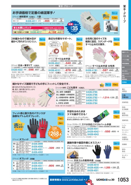学習ペーパークラフト・素材イベント用品学習支援用品保育安全・安心OA・サプライ用品文具・事務用品日用品電化化消耗品耗工具・作業用品収納用品納雨具・具・生活雑貨活飼育・育・園芸用品芸清掃用品掃トイレレ用品品ティッシュティッシュペーパー・パタオルル洗面所・洗面所・洗濯用品濯保健室保健室飲料・料・食品食品キッチンキッチン用品品軍手・グローブ7ゲージ12双入女性用に指のサイズを細身に設定。スタンダードなすべり止め付き軍手。使用例7ゲージ5双入軍手・グローブ351双あたり税込¥38.5税抜¥お得●寸法/全長:230mm、中指:85mm、掌幅:85mm●材質/ポリエステル、綿、その他●包装数:1/40まとめ買いパック1組(12双入×10袋)8-636-4012お申込番号商品種別※1組単位申込。M価税抜オープン税込価格¥4,617¥4,198税抜価格2本編みなので編み目が細かく汚れが入りにくい。7ゲージ12双入身近な作業をサポート。12双入は1双あたり¥73.1(税込¥80.4)すべりにくい!7ゲージ5双入12双入お手頃価格で定番の綿混軍手![アトム]綿特軍手12双入1袋商品種別型式/201お申込番号8-636-4011M価税抜¥870税抜価格¥465税込価格¥511単位1袋(12双入)[アトム]日本一軍手YT12双入お申込番号8-639-4022M価税抜¥880税抜価格¥598税込価格¥657単位1袋(12双入)商品種別型式/209●寸法/全長:230mm、中指:80mm、掌幅:95mm●材質/ポリエステル・レーヨン・その他●2本編み●包装数:1/40[アトム]すべり止め手袋お申込番号M価税抜税抜価格8-636-4842オープン¥540商品種別5双入型式/4989-5P税込価格¥594単位1袋(5双入)お申込番号M価税抜税抜価格8-636-4010オープン¥878税込価格¥965単位1袋(12双入)商品種別12双入型式/4989-12P[アトム]すべり止め手袋女性用お申込番号M価税抜税抜価格8-636-4136オープン¥587税込価格¥645単位1袋(5双入)商品種別5双入型式/4990LA-5P●寸法/全長:230mm、中指:80mm、掌幅:95mm●材質/手袋:ポリエステル・綿・その他、すべり止め:ポリ塩化ビニル●包装数:1/40(5双入)、1/2012双入)●寸法/全長:210mm、中指:約75mm、掌幅:95mm●材質/手袋:ポリエステル・その他、すべり止め:ポリ塩化ビニル●包装数:1/40細かなサイズ展開で子どもの手にフィットして安全です。綿100%で子どもの手のサイズ、幅、長さ、指の長さまでしっかり作りこんであります。商品種別[シンエイ産業]こども軍手10双入寸法/全長:約150mm、中指:約55mm3S、幼児〜幼稚園児SS、幼稚園児〜小学校低学年寸法/全長:約160mm、S、小学校中学年〜高学年寸法/全長:約180mm、M、小学校高学年〜中学生寸法/全長:約190mm、L、中学生・女性用●材質/綿100%●包装数:1/2中指:約66mm寸法/全長:約200mm、中指:約69mm中指:約58mm中指:約63mmお申込番号8-636-37858-636-37868-636-37828-636-37838-636-37847ゲージ10双入M価税抜税抜価格税込価格単位オープン¥1,214¥1,3351袋(10双入)13ゲージ1双入3双入3双組1双あたり268.4税込¥295手袋をはめたままスマホ操作できる!ニトリルゴムコーティングにより、耐油性と耐摩耗性に優れています。13ゲージ1双入[ショーワグローブ]スマホ対応ニトリルパーム手袋商品種別お申込番号M価税抜税抜価格税込価格単位寸法/全長:230mm、手のひらまわり:寸法/全長:220mm、手のひらまわり:160mm、中指:75mm、型式/AP800S8-639-4041175mm、中指:77mm、型式/AP800M8-639-40428-639-4043SML●材質/合成ゴム(ニトリルゴム)●包装数:1/120寸法/全長:250mm、手のひらまわり:185mm、中指:79mm、型式/AP800Lオープン¥550¥6051双税込価格単位¥3521双運搬作業や園芸作業にオススメ!グリップ力としなやかさを両立した天然ゴムの背抜き手袋です。13ゲージ10双入使用例[アトム]天然ゴム作業用手袋10双組商品種別お申込番号M価税抜税抜価格税込価格単位寸法/全長:210mm、中指:71mm、掌幅:92mm、型式/BP146S寸法/全長:225mm、中指:75mm、掌幅:95mm、型式/BP146M寸法/全長:240mm、中指:83mm、掌幅:110mm、型式/BP146LSML●材質/手袋:ポリエステル、すべり止め:天然ゴム●背抜き手袋●包装数:1/248-639-40198-639-40208-639-4021¥1,200¥1,320¥1,2801袋(10双入)[アトム]タフレッド商品種別お申込番号M価税抜税抜価格寸法/全長:195mm、中指:70mm、掌幅:85mm、型式/1470-SS寸法/全長:209mm、中指:70mm、掌幅:92mm、型式/1470-S寸法/全長:219mm、中指:76mm、掌幅:95mm、型式/1470-M寸法/全長:232mm、中指:80mm、掌幅:104mm、型式/1470-LSSSML●材質/手袋:ナイロン、すべり止め:天然ゴム●包装数:1/2408-636-39998-636-40008-636-40018-636-4002オープン¥320[アトム]タフレッド3双組寸法/全長:209mm、中指:70mm、掌幅:92mm、型式/1470-3P寸法/全長:219mm、中指:76mm、掌幅:95mm、型式/1470-3P寸法/全長:232mm、中指:80mm、掌幅:104mm、型式/1470-3PSML●材質/手袋:ナイロン、すべり止め:天然ゴム●包装数:1/808-636-45508-636-45518-636-4552商品種別お申込番号M価税抜税抜価格税込価格単位オープン¥805¥8851袋(3双入)S税抜¥LMSSS3Sフィット感と耐久性のバランスが抜群なアトムのタフレッド。※カタログに掲載の商品情報(仕様・価格・税率など)は変更になる場合がございます。最新情報はUCHIDASww.uchidas.netwへ!Vol.201053