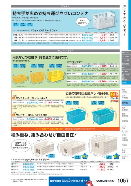 コンテナ・かご・バスケット学習ペーパークラフト・素材イベント用品学習支援用品保育安全・安心OA・サプライ用品文具・事務用品日用品電化化消耗品耗工具・具・作業用品業収納用品雨具・具・生活雑貨活飼育・育・園芸用品芸清掃用品掃トイレレ用品品ティッシュティッシュペーパー・パタオルル洗面所・洗面所・洗濯用品濯保健室保健室飲料・料・食品食品キッチンキッチン用品品370mm333mm丈夫で便利な金属ハンドル付き。ハンドルを内側に倒すと、中身を入れたまま積み重ねができます。容量81.2L許容積載質量40kg容量120L許容積載質量50kg沖縄・離島はサービス対象外mm076470mmmm808553mm●●[三甲]サンテナー81.2Lハンドル付き商品種別お申込番号M価税抜税抜価格税込価格型式/107601-018-636-4430¥11,010●●寸法/670幅)×470奥)×333(高)mm●有効内寸/584(幅)×384奥)×306高)mm●質量/3.48kg●材質/本体:ポリプロピレン、ハンドル:スチール●許容積載質量/40kg●包装数:1/6¥7,157¥7,872単位1個[三甲]サンテナー120Lハンドル付き商品種別お申込番号M価税抜税抜価格税込価格型式/113001-018-636-4431●●寸法/808幅)×553(奥)×370高)mm●有効内寸/692(幅)×447奥)×302(高)mm●質量/4.56kg●材質/本体:ポリプロピレン、ハンドル:スチール●許容積載質量/50kg●包装数:1/5¥10,800¥9,039¥9,942単位1個※メーカー直送品です。返品はご容赦ください。上記商品は受注日から8営業日以内のお届けになります。積み重ね、組み合わせが自由自在!mm544mm543mm544●容量16.8L350mm●容量29.6L250mm145mm容量7.6L350mm寸法/内寸[JEJアステージ]asバスケットアイボリー215mm●145mm各種サイズで組み合わせて積み重ねができる。●材質/ポリプロピレン●包装数:1/8(❼❽)、1/6(❾)※積み重ねる際は、本体の底部4カ所の脚先端ツメ部分を、下段の本体上部4カ所の溝にそれぞれ差し込んでください。※カタログに掲載の商品情報(仕様・価格・税率など)は変更になる場合がございます。最新情報はUCHIDASww.uchidas.netwへ!Vol.201057質量/容量325g/7.6L635g/16.8L750g/29.6LM価税抜オープン税抜価格¥582¥920¥1,220税込価格¥640¥1,012¥1,342単位1個215(幅)×345(奥)×145高)mm/180(幅)×308奥)×137高)mm350(幅)×445奥)×145(高)mm/308幅)×398奥)×137(高)mm350(幅)×445(奥)×250高)mm/308(幅)×398奥)×242高)mmお申込番号8-636-32948-636-32968-636-3298商品種別型式/#1型式/#2型式/#3●●●174mm単位1個非常に丈夫です。●BR1Wmm623お申込番号8-636-45018-636-45028-636-4503M価税抜オープン税抜価格¥781税込価格¥859¥1,111¥1,222¥1,441¥1,585コンテナ持ち手が広めで持ち運びやすいコンテナ。●同じサイズの積み重ねができます。●ブライトコンテナーBR-3の上にBR-1が2つ積み重ねができます。221mm[三甲]サンテナー商品種別型式/B#25-6お申込番号M価税抜税抜価格税込価格●●寸法/526幅)×367(奥)×158高)mm●有効内寸/481(幅)×322奥)×142(高)mm●質量/1.24kg●材質/ポリプロピレン●容量/24L●許容積載質量/20kg●包装数:1/108-636-4387オープン¥1,130¥1,243単位1個型式/B#49●●寸法/526幅)×367(奥)×309高)mm●有効内寸/481幅)×322奥)×286(高)mm●質量/2.05kg●材質/ポリプロピレン●容量/47.2L●許容積載質量/20kg●包装数:1/88-636-4388オープン¥1,329¥1,4611個型式/106921●●寸法/616幅)×425(奥)×311高)mm●有効内寸/573幅)×381奥)×295(高)mm●質量/2.6kg●材質/ポリプロピレン●容量/67.8L●許容積載質量/20kg●包装数:1/68-636-4429オープン¥3,204¥3,5241個311mmmm616●309mmmm625425mm●158mm●mm367※底面はメッシュです。mm6257mm36容量8.7L容量18.4L容量31.2L[サンコープラスチック]ブライトコンテナーホワイト商品種別●容量/8.7L寸法/326幅)×221(奥)×174高)mm、内寸/285幅)×185(奥)×165(高)mm、質量/497g、型式/BR-1W容量/18.4L寸法/383幅)×277(奥)×240高)mm、内寸/345幅)×235(奥)×227(高)mm、質量/798g、型式/BR-2W容量/31.2L寸法/454幅)×326(奥)×280高)mm、内寸/410幅)×285(奥)×267(高)mm、質量/1060g、型式/BR-3W●材質/ポリプロピレン●色/ホワイト●包装数:1/24(8.7L)、1/18(18.4L)、1/12(31.2L)かご・バスケット用具などの収納や、持ち運びに便利です。積み重ねて保管できます。容量24L許容積載質量20kg容量47.2L許容積載質量20kg容量67.8L許容積載質量20kg
