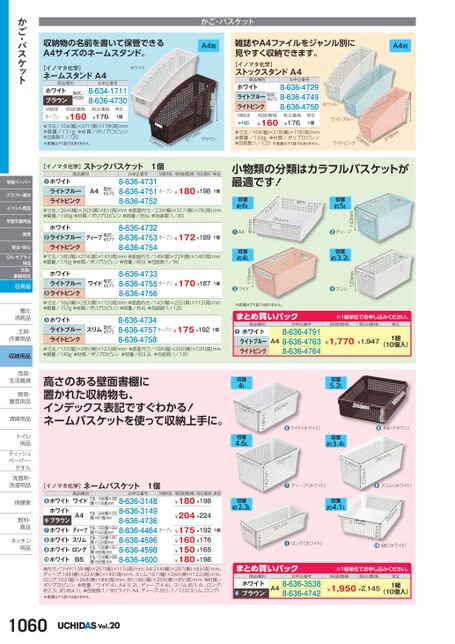 178mmmm872104mmライトピンクホワイトライトブルー[イノマタ化学]ストックスタンドA4商品種別ホワイトライトブルーライトピンク型式/4575お申込番号8-636-47298-636-47498-636-4750M価税抜¥165税抜価格¥160税込価格¥176単位1個●寸法/104幅)×278奥)×178(高)mm●質量/134g●材質/ポリプロピレン●包装数:1/120※底面はアミ目ではありません。小物類の分類はカラフルバスケットが最適です!mm472180mmmm592容量約5L143mm●ディープ容量約3.2L353mm264mmmm392166mm容量約6L81mm●A4容量約4L115mm●ワイド※1組単位申込。税抜価格税込価格単位¥1,770¥1,9471組(10個入)133mm123mm●スリム※底面はアミ目ではありません。まとめ買いパック●商品種別ホワイトライトブルーライトピンクお申込番号8-636-47918-636-47638-636-4764A4mm192●スリム(ホワイト)125mm133mm●ディープ(ホワイト)142mm332mm87mm244mm容量5.2Lm●ワイド(ホワイト)●A4(ブラウン)容量約3.4Lmmm4092118mm容量4L168mm容量4.6L182mm62178mmmm172ブラウン税抜価格税込価格単位ホワイト[イノマタ化学]ネームスタンドA4商品種別ホワイトブラウン型式/4580お申込番号8-634-17118-636-4730単位1個税抜価格¥160税込価格¥176M価税抜オープン●寸法/104幅)×271奥)×178高)mm●質量/131g●材質/ポリプロピレン●包装数:1/120※底面はアミ目ではありません。104mm[イノマタ化学]ストックバスケット1個商品種別●ホワイトライトブルーライトピンクM価税抜お申込番号8-636-47318-636-47518-636-4752A4型式/4570オープン¥180¥1981個●寸法/264(幅)×353(奥)×81(高)mm●底面内寸/239(幅)×317(奥)×78(高)mm●質量/190g●材質/ポリプロピレン●容量/約6L●包装数:1/80●ホワイトライトブルーライトピンクディープ型式/45778-636-47328-636-47538-636-4754オープン¥172¥1891個●寸法/180幅)×274奥)×143高)mm●底面内寸/149(幅)×229(奥)×140(高)mm●質量/170g●材質/ポリプロピレン●容量/約5L●包装数:1/90ホワイトライトブルーライトピンク8-636-47338-636-47558-636-4756ワイド型式/4571オープン¥170¥1871個●●寸法/166(幅)×293奥)×115高)mm●底面内寸/143幅)×255(奥)×113(高)mm●質量/157g●材質/ポリプロピレン●容量/約4L●包装数:1/120●ホワイトライトブルーライトピンクスリム型式/45728-636-47348-636-47578-636-4758オープン¥175¥1921個●寸法/133(幅)×295奥)×123高)mm●底面内寸/108(幅)×250(奥)×120(高)mm●質量/140g●材質/ポリプロピレン●容量/約3.2L●包装数:1/120高さのある壁面書棚に置かれた収納物も、インデックス表記ですぐわかる!ネームバスケットを使って収納上手に。かご・バスケット学習ペーパークラフト・素材イベント用品学習支援用品保育安全・安心OA・サプライ用品文具・事務用品日用品電化電化消耗品消耗品工具・工具作業用品作業用収納用品雨具・雨具生活雑貨生活雑飼育・飼育園芸用品園芸用清掃用品清掃用トイレトイ用品用品ティッシュティッシュペーパー・タオルタオル洗面所・洗面所・洗濯用品洗濯用保健室保健室飲料・飲料食品食品キッチンキッチン用品用品かご・バスケット収納物の名前を書いて保管できるA4サイズのネームスタンド。A4判雑誌やA4ファイルをジャンル別に見やすく収納できます。A4判まとめ買いパック商品種別ホワイトブラウン●お申込番号8-636-35388-636-4742A4※1組単位申込。税抜価格税込価格単位¥1,950¥2,1451組(10個入)●B5(ホワイト)289mm88mm214mm容量約2.3L容量約4.1L●ロング(ホワイト)88mmmm1038mm121個M価税抜税抜価格税込価格単位¥180¥198¥204¥224¥175¥192¥160¥176¥150¥165¥180¥198オープン[イノマタ化学]ネームバスケット1個お申込番号8-636-31488-636-31498-636-47368-636-44648-636-45968-636-45988-636-4600商品種別A4(奥)×118高)mm寸法/244幅)×332(奥)×87(高)mmホワイトワイド寸法/168幅)×290ホワイトブラウンホワイトホワイトスリムホワイトロングホワイト(奥)×142高)mm寸法/133幅)×291(奥)×125高)mm寸法/128幅)×301(奥)×88(高)mm寸法/214幅)×289(奥)×88(高)mmディープ寸法/182幅)×264B5❺●❼●❾●●内寸/ワイド:139(幅)×257(奥)×115(高)mm、A4:214(幅)×297(奥)×83(高)mm、ディープ:148幅)×224(奥)×140高)mm、スリム:107幅)×260(奥)×122高)mm、ロング:102(幅)×268奥)×84(高)mm、B5:186(幅)×259(奥)×85高)mm●材質/ポリプロピレン●容量/ワイド:4L、A4:5.2L、ディープ:4.6L、スリム:約3.4L、ロング:約2.3L、B5:約4.1L●包装数:1/90(ワイド、A4、ディープ、B5)、1/120(スリム、ロング)※底面はアミ目ではありません。1060Vol.20