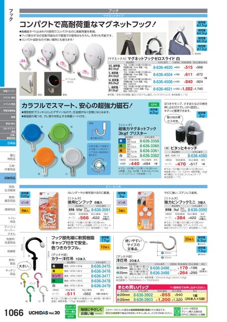 耐荷重約2.5kgf耐荷重約4.0kgf耐荷重約6.0kgf耐荷重約12kgf使用例税込価格単位ほうきやモップ、さすまたなどの柄を押し込むだけでしっかり固定し、キチンと整理できます。耐荷重2kgf取り付け用ビス付き。[光]ピタッとキャッチ商品種別型式/KMC-13お申込番号8-636-4080M価税抜オープン税抜価格¥470税込価格¥517単位1個●寸法/50(幅)×50(奧)×32(高)mm●装着寸法/13〜32mm●耐荷重/2kgf●付属品/ビス2本、クッションテープ●包装数:1/10サビに強い、ステンレス金具。[ニトムズ]強力ピンフックミニ3個入商品種別耐荷重/3kgf型式/H2820お申込番号8-636-3092単位税抜価格¥384税込価格¥422M価税抜オープン●寸法/21(幅)×8.5奥)×41高)mm●材質/ABS樹脂、ステンレススチール●取り付けタイプ/ピン●包装数:1/1001セット(3個入)20本入耐荷重6.5kgf●20mm耐荷重12kgf●25mm●●20mm25mm商品種別寸法/20(幅)×31奥)×2.4(線径)mm、型式/CYT-20寸法/25(幅)×38奥)×2.7(線径)mm、型式/CYT-25お申込番号M価税抜税抜価格税込価格単位8-636-3496オープン¥179¥196¥264¥2908-636-34981袋(20本入)20mm25mm●●※1組単位申込。税抜価格¥855税込価格¥940¥1,200¥1,320単位1組(20本入×5袋)お申込番号8-636-39028-636-3903商品種別20mm25mm●●まとめ買いパック●材質/鉄(ニッケルメッキ)●耐荷重/20mm:6.5kgf、25mm:12kgf●包装数:1/50(20mm)、1/10(25mm)[アンテナ印]洋灯吊20本入[アンテナ印]カラー洋灯吊10本入黒黄ピンク緑白商品種別型式/ATA-1-35-B型式/ATA-1-35-Y型式/ATA-1-35-P型式/ATA-1-35-G型式/ATA-1-35-Wお申込番号8-636-34758-636-34768-636-34778-636-34788-636-3479税抜価格¥511M価税抜オープン●寸法/29(幅)×54(奥)×4(線径)mm●材質/鉄(焼付塗装)●耐荷重/17kgf●包装数:1/100税込価格¥5621袋(10本入)単位Vol.20地球にやさしくお買い物このマークのついた商品は地球環境保護に配慮された商品です。グリーンの文字で商品の判別をしやすくしました。どうぞご利用ください。エコマーク認定品グリーン購入法適合品GPNエコ商品ねっと掲載フックマグネットタイプコンパクトで高耐荷重なマグネットフック!●高機能すべり止めR-FIX使用でコンパクトなのに高耐荷重を実現。●フック部分が360°回転可能なので壁面での使用はもちろん、天吊りも可能です。●コンパクト設計なので狭い場所にも使えます!SSSMすべり止めR-FIXL側面裏面[マグエックス]マグネットフックゼロスライド白商品種別お申込番号M価税抜税抜価格¥6508-636-4620SS、耐荷重/約2.5kgfS、耐荷重/約4.0kgfM、耐荷重/約6.0kgfL、耐荷重/約12kgf●材質/本体:ABS樹脂、磁石:ネオジウム磁石、フック:ステンレス●包装数:1/10寸法/25幅)×24奥)×50(高)mm、吊部最大幅/5mm、質量/16g、型式/MZR-2W寸法/38幅)×30奥)×53(高)mm、吊部最大幅/7mm、質量/32g、型式/MZR-4W寸法/47幅)×40奥)×64(高)mm、吊部最大幅/7mm、質量/46g、型式/MZR-6W寸法/58幅)×50奥)×87(高)mm、吊部最大幅/10mm、質量/82g、型式/MZR-12W8-636-4506¥1,0508-636-4621¥1,950¥1,582¥1,740¥515¥611¥8408-636-4504¥566¥672¥924¥7901個カラフルでスマート、安心の超強力磁石!●薄型設計でスッキリとしたデザインなので、圧迫感がなく空間になじみます。●着磁面の傷つき、ズレ落ちを防止する保護シート付き。耐荷重約3kgf青緑側面[ソニック]超強力マグネットフック3kgfブリスター最大幅6mm半球を描いて回転する可動フックなので、上下左右、自由自在に動きます。青緑橙白商品種別型式/MG-752-B型式/MG-752-G型式/MG-752-OR型式/MG-752-Wお申込番号8-636-33588-636-33608-636-33618-636-3362M価税抜¥630税抜価格¥440税込価格¥484単位1個橙白●寸法/48(幅)×23(奥)×58(高)mm●質量/30g●材質/本体:ABS・POM、フック:ステンレス●包装数:1/5ピン・ネジ式カレンダーや小物を掛けるのに最適。[ニトムズ]徳用ピンフック8個入商品種別耐荷重/500gf型式/H2380お申込番号8-636-3091単位税抜価格¥566税込価格¥622M価税抜オープン●寸法/16幅)×30(奥)×30(高)mm●材質/スチロール系樹脂、ステンレススチール●取り付けタイプ/ピン●包装数:1/100(8個入)1セット耐荷重3kgfピン式3個入フック部先端に軟質樹脂キャップ付きで安全。色つきカラフル。耐荷重17kgf10本入使いやすいサイズの定番品。フック学習ペーパークラフト・素材イベント用品学習支援用品保育安全・安心OA・サプライ用品文具・事務用品日用品電化電化消耗品消耗品工具・工具作業用品作業用収納用品雨具・雨具生活雑貨生活雑飼育・飼育園芸用品園芸用清掃用品清掃用トイレトイ用品用品ティッシュティッシュペーパー・タオルタオル洗面所・洗面所・洗濯用品洗濯用保健室保健室飲料・飲料食品食品キッチンキッチン用品用品54mm黒35mm大きい。黄ピンク耐荷重500gfピン式8個入緑白1066