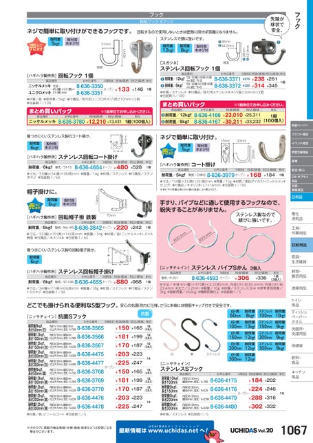フック先端が球状で安全。●42.9mm38mm●●M価税抜税抜価格税込価格単位¥270¥238¥261¥314¥345¥3201個36mm44.3mm●●ステンレスで錆に強いです。耐荷重12kgf耐荷重8kgf取付用木ネジ付商品種別お申込番号寸法/50(幅)×38奥)×8高)mm、型式/TK-30寸法/60幅)×42.9奥)×8高)mm、型式/TK-458-636-33718-636-3372耐荷重/12kgf耐荷重/8kgf●●[スガツネ]ステンレス回転フック1個側面ネジで簡単に取り付けができるフックです。回転するので使用しないときは壁側に倒せば邪魔になりません。フック回転フック・Sフック学習ペーパークラフト・素材イベント用品学習支援用品保育安全・安心OA・サプライ用品文具・事務用品日用品電化化消耗品耗工具・具・作業用品業収納用品雨具・具・生活雑貨活飼育・育・園芸用品芸清掃用品掃トイレレ用品品ティッシュティッシュペーパー・パタオルル洗面所・洗面所・洗濯用品濯保健室保健室飲料・料・食品食品キッチンキッチン用品品※1組単位申込。税抜価格税込価格¥23,010¥25,311¥30,211¥33,232単位1組(100個入)お申込番号8-636-41668-636-4167商品種別耐荷重/12kgf耐荷重/8kgf●●まとめ買いパック●材質/ステンレス●付属品/取付用ステンレス木ネジ(長さ20mm)×2個●包装数:1/10035mmネジで簡単に取り付け。耐荷重5kgf取付用木ネジ付15mm33mm[ハギハラ製作所]コート掛け商品種別お申込番号M価税抜税抜価格型式/CHN-S8-636-3979オープン¥168耐荷重/5kgf●寸法/15(幅)×33奥)×35(高)mm●質量/15g●材質/亜鉛ダイカスト(ニッケルメッキ仕上げ)●付属品/木ネジ2本(2.7×16mm)●包装数:1/100※吊り下げ荷重は取り付け面の強度により異なります。税込価格¥184単位1個手すり、パイプなどに通して使用するフックなので、紛失することがありません。ステンレス製なので錆びに強いです。mm0.53約mm3.42約[ニッサチェイン]ステンレスパイプSかん3個入商品種別型式/P-251お申込番号M価税抜8-636-4593オープン税抜価格¥306税込価格¥336単位1袋(3個入)●寸法/本体:65(幅)×37(奥)×3.2(高)mm、内径(大):約30.5mm、内径(小):約23.4mm●太さ/3.2mm●質量/10g●材質/ステンレス304●参考使用荷重/3kg●破断荷重/24.6kg●電解研磨仕上●包装数:1/5ステンレス100mmステンレス150mmステンレス200mmステンレス300mm耐荷重10kgf耐荷重9kgf耐荷重9kgf耐荷重9kgf白・黒50mm白・黒100mm白・黒150mm白・黒200mm白・黒300mm耐荷重8kgf耐荷重13kgf耐荷重12kgf耐荷重12kgf耐荷重12kgf白黒ステンレス[ニッサチェイン]ステンレスSフック商品種別お申込番号内径30/30mm、線径4mm、型式/A-789内径38/38mm、線径4mm、型式/A-829内径38/38mm、耐荷重10kgf、長さ100mm耐荷重9kgf、長さ150mm耐荷重9kgf、長さ200mm耐荷重9kgf、長さ300mm●材質/ステンレス●包装数:1/58-636-41758-636-4176線径4mm、型式/A-839K8-636-4479線径4mm、型式/A-849K8-636-4480内径38/38mm、単位1本M価税抜税抜価格税込価格¥202¥184¥224¥288¥302¥246¥316¥332オープン45mm側面耐荷重5kgf取付用木ネジ付31mm[ハギハラ製作所]回転フック1個商品種別お申込番号M価税抜税抜価格税込価格ニッケルメッキ寸法/ユニクロメッキ●材質/鉄●耐荷重/5kgf●付属品/取付用ユニクロ木ネジ(長さ10mm)×2個●包装数:1/1008-636-3350オープン¥133¥1468-636-335145(幅)×31(奥)×31(高)mm単位1個まとめ買いパックニッケルメッキ商品種別※1組単位申込。お申込番号税抜価格税込価格8-636-3780¥12,210¥13,431単位1組(100個入)傷つきにくいステンレス製のコート掛け。耐荷重6kgf取付用木ネジ付[ハギハラ製作所]ステンレス回転コート掛け商品種別お申込番号M価税抜税抜価格耐荷重/6kgf●寸法/33(幅)×34(奥)×38(高)mm●質量/14g●材質/ステンレス●付属品/ステン木ネジ●包装数:1/608-636-4654オープン¥480型式/ST-15税込価格¥528単位1個[ハギハラ製作所]回転帽子掛鉄製商品種別お申込番号M価税抜税抜価格税込価格型式/No.1058-636-3842オープン¥220¥242耐荷重/6kgf●寸法/32(幅)×70(奥)×74(高)mm●質量/34g●材質/鉄(ニッケルメッキ)、EVA樹脂●付属品/木ネジ4本●包装数:1/60単位1個傷つきにくいステンレス製の回転帽子掛け。耐荷重取付用6kgf木ネジ付[ハギハラ製作所]ステンレス回転帽子掛け商品種別お申込番号M価税抜税抜価格型式/ST-1008-636-4655オープン¥880耐荷重/6kgf●寸法/34(幅)×77(奥)×69(高)mm●質量/38g●材質/ステンレス●付属品/ステントラスネジ●包装数:1/30税込価格¥968単位1個29mm70mm74mm帽子掛けに。耐荷重6kgf取付用木ネジ付どこでも掛けられる便利なS型フック。[ニッサチェイン]抗菌Sフック商品種別お申込番号内径38/38mm、線径4mm内径38/38mm、線径4mm内径38/38mm、線径4mm内径30/30mm、線径4mm内径15/15mm、線径2.9mm耐荷重8kgf、長さ50mm(白)耐荷重13kgf、長さ100mm(白)耐荷重12kgf、長さ150mm(白)耐荷重12kgf、長さ200mm(白)耐荷重12kgf、長さ300mm(白)耐荷重8kgf、長さ50mm(黒)耐荷重13kgf、長さ100mm(黒)耐荷重12kgf、長さ150mm(黒)耐荷重12kgf、長さ200mm(黒)耐荷重12kgf、長さ300mm(黒)●材質/鉄、ビニールコート●包装数:1/5(仕上がり4mm)、型式/A-700K8-636-3565(仕上がり5mm)、型式/A-780K8-636-3566(仕上がり5mm)、型式/A-820K8-636-3567(仕上がり5mm)、型式/A-830K8-636-4475(仕上がり5mm)、型式/A-840K8-636-4477(仕上がり4mm)、型式/A-705K8-636-3768(仕上がり5mm)、型式/A-785