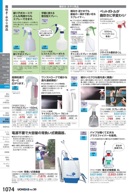 霧吹き・水やり用品横向き・逆さまでも最後の一滴まで使い切るスプレイヤー。●ノズルを回すと噴霧量の調節が可能。どのような角度からでも連続噴霧OK。●吸引口にはネットを採用。アルコールOK※70%未満※希釈洗剤にてご利用ください。※原液や次亜塩素酸などの強い薬剤には使用できません。(ボトル腐食、目詰まり原因)※70%未満のアルコールも入れられます。[山崎産業]キャニヨンスプレーH-500商品種別型式/C356-000X-MB-GM価税抜¥1,200¥979税抜価格お申込番号8-637-9470税込価格¥1,076単位1個●寸法/110(幅)×80(奥)×240(高)mm●容量/500mL●質量/80g●材質/スプレイヤー・容器:ポリプロピレン、ジャバラホース:低密度ポリエチレン●包装数:1/30ペットボトルが霧吹きに早変わり!注ぎ口内径20mmのペットボトルに対応します。※一部例外品がございます。500mLペットボトルに最適![コンパル]リサイクル霧吹きくんお申込番号8-637-9052単位1個税抜価格¥297税込価格¥326M価税抜オープン●寸法/100(幅)×30(奥)×300(高)mm●ストロー長さ/210mm●安心のキャップ付●口径の内径20mmのペットボトルに対応●包装数:1/20※アルコールには使用できません。アルコールOK※80%以下容量200mL細かいミクロな霧を長く噴霧!細かい霧を満遍なく吹けるので、爬虫類の湿度管理や消毒液噴霧、植物への葉水に。体へ吹きかけて気化熱で熱中症対策をしたり、冬の乾燥した季節の室内の湿度管理にも。容量500mL容量500mL振り子式ホースでどんな角度からもスプレーできます。おもりの付いた給水ホースが傾けた方向に動くので、少ない水もシッカリキャッチ。手軽に使える普及型スプレー。アルコールOK※80%以下ノズルキャップを回すと霧の出方を調整できます。アルコールOK※80%以下容量500mL[マルハチ産業]振り子式スプレー商品種別型式/#50B)お申込番号8-637-9321単位1本税抜価格¥650税込価格¥715M価税抜オープン●寸法/95(径)×195(高)mm●容量/500mL●質量/76g●材質/ポリエチレン●包装数:1※80%以下のアルコールも入れられます。超微粒霧で均一に広がります。容量150mL※アルコールには使用できません。[マルハチ産業]ピストルスプレーボトル商品種別お申込番号型式/HM-500B/W)8-637-9704M価税抜オープン税抜価格¥389税込価格¥427単位1本●寸法/110幅)×98(奥)×210(高)mm●容量/500mL●質量/70g●材質/ポリエチレン、ポリプロピレン●包装数:1※80%以下のアルコールも入れられます。ワンストロークで細かな霧を連続噴射!●1回の噴射で約1.2mLの噴霧量。●非常にきめ細かなミストを連続して噴霧できる特殊なトリガーを採用しています。●室内の加湿にもおすすめ。使用例霧吹き・水やり用品学習ペーパークラフト・素材イベント用品学習支援用品保育安全・安心OA・サプライ用品文具・事務用品日用品電化電化消耗品消耗品工具・工具作業用品作業用収納用品収納用雨具・雨具生活雑貨生活雑飼育・園芸用品清掃用品清掃用トイレトイ用品用品ティッシュティッシュペーパー・タオルタオル洗面所・洗面所・洗濯用品洗濯用保健室保健室飲料・飲料食品食品キッチンキッチン用品用品使用例アルコールOK※80%以下容量500mL二頭口ノズル付容量12L[EIGERTOOL]マイクロスプレー150mL商品種別型式/EM-150お申込番号8-637-9237単位1個税抜価格¥570税込価格¥627M価税抜オープン●寸法/80(幅)×50(奥)×190(高)mm●容量/150mL●質量/59g●材質/スプレー部:ポリプロピレン樹脂・ポリエチレン樹脂、ボトル部:PET樹脂●引っ掛けホルダー付●色/ピンク●包装数:1/12[マルハチ産業]マイクロンスプレーラビットお申込番号M価税抜8-638-8618オープン税抜価格¥820税込価格¥902単位1本商品種別型式/#2405●寸法/90(幅)×60(奥)×205(高)mm●容量/200mL●質量/92g●材質/ポリプロピレン、PET樹脂●包装数:1※80%以下のアルコールも入れられます。電源不要で大容量の背負い式噴霧器。●加圧をするための操作レバーを左右に切り替えられるユニバーサル仕様で、右利き・左利きのどちらにも対応!●高い場所に便利な延長ジョイントパイプと、大きな肩パッドおよび背パッド付き。[マルハチ産業]背負い式噴霧器商品種別型式/#12000お申込番号M価税抜税抜価格8-637-9722オープン¥7,875使用例税込価格¥8,662単位1台使用例[マルハチ産業]スプレーボトル商品種別型式/#2201お申込番号8-637-9721単位1本税抜価格¥769税込価格¥845M価税抜オープン●寸法/105(幅)×100(奥)×230(高)mm●容量/500mL●質量/95g●材質/ポリプロピレン、PET樹脂●包装数:1※80%以下のアルコールも入れられます。パイプは軽くて丈夫なグラスファイバーを使用。ノズル先端を回すと霧の出方を調整できます。アルコール安全弁装置付き。OK※80%以下レギュラーノズル付容量4L[マルハチ産業]蓄圧式噴霧器4Lお申込番号M価税抜税抜価格税込価格8-637-9498オープン¥2,553¥2,808単位1台●寸法/本体:180(径)×360(高)mm、箱:190幅)×190(奥)×370(高)mm、ホース長:125cm、レギュラーノズル:38cm●片掛けストラップ付●包装数:1※80%以下のアルコールも入れられます。●寸法/350(幅)×130(奥)×500高)mm●容量/12L●質量/3.28kg●材質/ポリプロピレン、