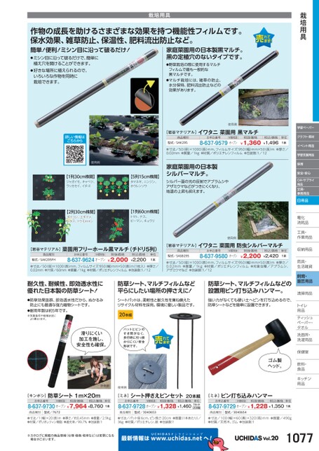 栽培用具学習ペーパークラフト・素材イベント用品学習支援用品保育安全・安心OA・サプライ用品文具・事務用品日用品電化化消耗品耗工具・具・作業用品業収納用品納雨具・具・生活雑貨活飼育・園芸用品清掃用品掃トイレレ用品品ティッシュティッシュペーパー・パタオルル洗面所・洗面所・洗濯用品濯保健室保健室飲料・料・食品食品キッチンキッチン用品品栽培用具作物の成長を助けるさまざまな効果を持つ機能性フィルムです。保水効果、雑草防止、保温性、肥料流出防止など。簡単!便利!ミシン目に沿って破るだけ!●ミシン目に沿って破るだけで、簡単に家庭菜園用の日本製黒マルチ。黒の定植穴のないタイプです。植え穴を開けることができます。●好きな場所に植えられるので、いろいろな作物を同時に栽培できます。詳しい情報はこちらから使用例【1列30cm株間】ジャガイモ、キャベツ、ラッカセイ、イチゴ【5列15cm株間】タマネギ、ニンジン、ホウレンソウ【2列30cm株間】ダイコン、エダマメ、レタス、トウモロコシ【1列60cm株間】トマト、ナス、ピーマン、キュウリ[岩谷マテリアル]菜園用フリーホール黒マルチ(チドリ5列)商品種別型式/SAK295FHお申込番号M価税抜8-637-9624オープン税抜価格¥2,000税込価格¥2,200単位1本●寸法/50(径)×1000長)mm、フィルムサイズ:950(幅)mm×50(長)m(1枚入)●厚さ/0.02mm●穴径/60mm●質量/1kg●材質/ポリエチレンフィルム●包装数:1/12●野菜栽培の際に使用するマルチフィルムで最も一般的な黒マルチです。●マルチ栽培には、雑草の防止、水分保特、肥料流出防止などの効果があります。使用例[岩谷マテリアル]イワタニ菜園用黒マルチ商品種別型式/SAK295お申込番号M価税抜8-637-9579オープン税抜価格¥1,360税込価格¥1,496単位1本●寸法/50(径)×1000(長)mm、フィルムサイズ:950(幅)mm×50(長)m●厚さ/0.02mm●質量/1kg●材質/ポリエチレンフィルム●包装数:1/12家庭菜園用の日本製シルバーマルチ。シルバー面の光の反射でアブラムシやアザミウマなどがつきにくくなり、地温の上昇も抑えます。使用例[岩谷マテリアル]イワタニ菜園用防虫シルバーマルチ商品種別型式/SASB295お申込番号M価税抜8-637-9580オープン税抜価格¥2,200税込価格¥2,420単位1本●寸法/50(径)×1000(長)mm、フィルムサイズ:950(幅)mm×50(長)m●厚さ/0.02mm●質量/1kg●材質/ポリエチレンフィルム●対象虫種/アブラムシ、アザミウマなど●包装数:1/12耐久性、耐候性、即効透水性に優れた日本製の防草シート!防草シート、マルチフィルムなど平らにしたい場所の押さえに!防草シート、マルチフィルムなどの設置用ピン打ち込みハンマー。●防草効果抜群、即効透水性だから、ぬかるみ防止にも最適な強力織物シートです。シートパットは、柔軟性と耐久性を兼ね備えたリサイクル材料を採用。環境に優しい製品です。強い力がなくても硬い土へピンを打ち込めるので、防草シートなどを簡単に設置できます。●耐用年数は約5年です。※気象条件や使用状況により異なります。20本組滑りにくい加工を施し、安全性も確保。パットとピンのすき間がなく、歩行時に引っ掛かりにくい安全形状です。使用例使用例ゴム製ヘッド。[キンボシ]防草シート1m×20mお申込番号M価税抜税抜価格税込価格8-637-9730オープン¥7,964¥8,760単位1本[ミネ]シート押さえピンセット20本組お申込番号M価税抜税抜価格税込価格8-637-9728オープン¥1,328¥1,460単位1セット(20本組)商品種別型式/7672商品種別型式/3040653[ミネ]ピン打ち込みハンマーお申込番号M価税抜税抜価格税込価格8-637-9729オープン¥1,228¥1,350単位1本商品種別型式/3040654●寸法/1(幅)×20(長)m●厚さ/約0.45mm●質量/2.9kg●材質/ポリオレフィン樹脂●遮光率/99.7%●包装数:1●寸法/パット径:6cm、ピン長さ:20cm●質量(1本あたり)/36g●材質/ポリエチレン、鉄●包装数:1●寸法/100幅)×60奥)×320高)mm●質量/490g●材質/天然木、ゴム●包装数:1※カタログに掲載の商品情報(仕様・価格・税率など)は変更になる場合がございます。最新情報はUCHIDASww.uchidas.netwへ!Vol.201077