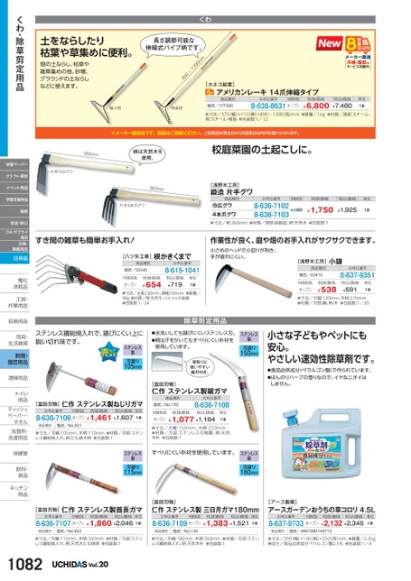 土をならしたり枯葉や草集めに便利。畑の土ならし、枯草や雑草集めの他、砂場、グラウンドの土ならしなどに使えます。くわ長さ調節可能な伸縮式パイプ柄です。890〜1390mm縮小時伸長時[カネコ総業]アメリカンレーキ14爪伸縮タイプ商品種別型式/177300お申込番号M価税抜8-638-8631オープン税抜価格¥6,800●寸法/370(幅)×110(奥)×890〜1390(高)mm●質量/1kg●材質/頭部:スチール、柄:スチール・樹脂●包装数:1/12沖縄・離島はサービス対象外税込価格¥7,480単位1本※メーカー直送品です。返品はご容赦ください。上記商品は受注日から8営業日以内のお届けになります。360mm柄は天然木を使用。片手巾広グワ360mm片手4本爪グワ校庭菜園の土起こしに。[浅野木工所]鍛造片手グワ商品種別お申込番号M価税抜税抜価格巾広グワ4本爪グワ●寸法/柄:360mm●材質/頭部:鉄鍛造、柄:天然木●包装数:18-636-71028-636-7103¥1,750¥1,980税込価格単位¥1,9251本すき間の雑草も簡単お手入れ!作業性が良く、庭や畑のお手入れがサクサクできます。小さめのヘッドで小回りが利き、手が疲れにくい。[浅野木工所]小鎌商品種別型式/03410お申込番号8-637-9351[八ツ矢工業]根かきくまで商品種別型式/55545お申込番号8-615-1041税抜価格¥654税込価格¥719M価税抜オープン●寸法/全長230mm、掃幅100mm●質量/90g●材質/柄:天然木、ツメ:メッキ鉄線●包装数:1/24単位1本税抜価格¥538M価税抜オープン●寸法/刃幅:120mm、木柄:270mm●材質/刃部:鋼、柄:木●包装数:1/20税込価格¥591単位1本小さな子どもやペットにも安心。やさしい速効性除草剤です。●食品由来成分(ペラルゴン酸)で作られています。●ほんのりハーブの香りなので、イヤなニオイはしません。除草剪定用品●水洗いしてもびにくいステンレス刃。●柄は汗をかいてもすべりにくい朴材を使用しています。ステンレス製刃渡り150mm草取りに使いやすい鋸刃付き。[富田刃物]仁作ステンレス製鋸ガマ商品種別型式/No.150お申込番号8-636-7108M価税抜税抜価格税込価格オープン¥1,077¥1,184単位1本●寸法/刃幅:150mm、木柄:220mm●材質/刃部:ステンレス刃物鋼、柄:天然木朴●包装数:1すべりにくい朴材を使用しています。ステンレス製刃渡り180mm[富田刃物]仁作ステンレス製三日月ガマ180mmお申込番号M価税抜税抜価格税込価格8-636-7109オープン¥1,383¥1,521単位1本[アース製薬]アースガーデンおうちの草コロリ4.5Lお申込番号8-637-9733オープン¥2,132¥2,345M価税抜税抜価格税込価格単位1本ステンレス鋼総焼入れで、びにくい上に鋭い切れ味です。ステンレス製刃渡り105mm[富田刃物]仁作ステンレス製ねじりガマお申込番号M価税抜税抜価格税込価格8-636-7106オープン¥1,461¥1,607単位1本商品種別型式/No.921●寸法/刃幅:105mm、木柄:110mm●材質/刃部:ステンレス鋼総焼入れ、柄:たも焼木柄●包装数:1ステンレス製刃渡り115mm[富田刃物]仁作ステンレス製首長ガマお申込番号M価税抜税抜価格税込価格8-636-7107オープン¥1,860¥2,046単位1本くわ・除草剪定用品学習ペーパークラフト・素材イベント用品学習支援用品保育安全・安心OA・サプライ用品文具・事務用品日用品電化電化消耗品消耗品工具・工具作業用品作業用収納用品収納用雨具・雨具生活雑貨生活雑飼育・園芸用品清掃用品清掃用トイレトイ用品用品ティッシュティッシュペーパー・タオルタオル洗面所・洗面所・洗濯用品洗濯用保健室保健室飲料・飲料食品食品キッチンキッチン用品用品商品種別型式/No.922商品種別型式/No.130商品種別型式/4901080144713●寸法/刃幅:115mm、木柄:300mm●材質/刃部:ステンレス鋼総焼入れ、柄:天然木たも焼柄●包装数:1●寸法/刃幅:180mm、木柄:360mm●材質/刃部:ステンレス鋼総焼入れ、柄:天然木朴●包装数:1●寸法/290幅)×140奥)×250高)mm●質量/5.5kg●成分/食品由来成分ペラルゴン酸2.5%●包装数:1/41082Vol.20