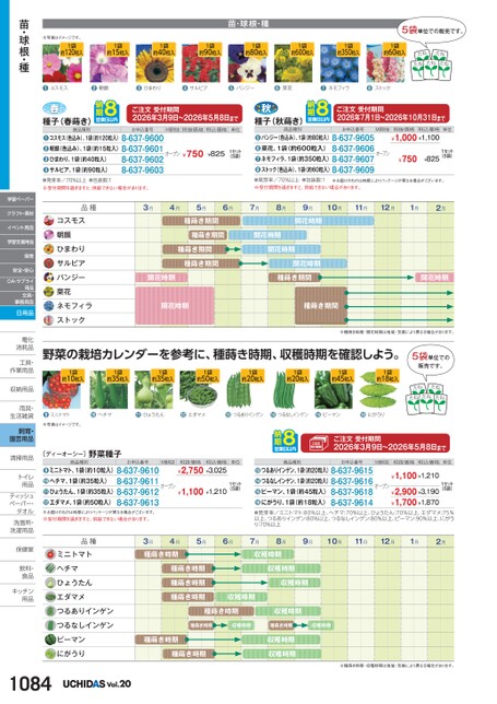 苗・球根・種5袋単位での販売です。1袋約15粒入1袋約40粒入1袋約90粒入1袋約80粒入1袋約600粒入1袋約350粒入1袋約60粒入たねたねたねたねたね※写真はイメージです。1袋約120粒入苗・球根・種❶コスモス❷朝顔❸ひまわり❹サルビア❺パンジー❻菜花❼ネモフィラ❽ストックご注文受付期間2026年7月1日〜2026年10月31日までM価税抜オープン税抜価格税込価格単位¥1,000¥1,100¥750¥8251セット(5袋)お申込番号パンジー(色込み)、1袋(約80粒入)8-637-9605菜花、1袋(約600粒入)8-637-9606ネモフィラ、1袋(約350粒入)8-637-9607ストック(色込み)、1袋(約60粒入)8-637-9609●●●●種子(秋蒔き)商品種別●発芽率/70%以上●包装数:1※受付期間を過ぎますと、供給できない場合があります。※お届けのものは時期によりパッケージが異なる場合がございます。ご注文受付期間2026年3月9日〜2026年5月8日までM価税抜税抜価格税込価格単位オープン¥750¥8251セット(5袋)お申込番号コスモス(色込み)、1袋(約120粒入)8-637-9600朝顔(色込み)、1袋(約15粒入)8-637-96018-637-9602ひまわり、1袋(約40粒入)8-637-9603サルビア、1袋(約90粒入)●発芽率/70%以上●包装数:1※受付期間を過ぎますと、供給できない場合があります。❶●●●種子(春蒔き)商品種別品種3月4月5月6月7月8月9月10月11月12月1月2月コスモス朝顔ひまわりサルビアパンジー菜花ネモフィラストック種蒔き期間種蒔き期間種蒔き期間種蒔き期間開花時期開花時期開花時期開花時期開花時期開花時期種蒔き期間種蒔き期間開花時期※種蒔き時期・開花時期は地域・気候により異なる場合があります。野菜の栽培カレンダーを参考に、種蒔き時期、収穫時期を確認しよう。1袋約10粒入1袋約35粒入1袋約35粒入1袋約50粒入1袋約20粒入1袋約20粒入1袋約45粒入1袋約18粒入5袋単位での販売です。たねたねたねたねたね●ミニトマト●ヘチマ●ひょうたん●エダマメ●つるありインゲン●つるなしインゲン●ピーマン●にがうり※写真はイメージです。ご注文受付期間2026年3月9日〜2026年5月8日までM価税抜税抜価格税込価格単位オープン¥1,100¥1,210¥2,900¥3,190¥1,700¥1,8701セット(5袋)商品種別お申込番号つるありインゲン、1袋(約20粒入)8-637-9615つるなしインゲン、1袋(約20粒入)8-637-9616ピーマン、1袋(約45粒入)8-637-9618にがうり、1袋(約18粒入)8-637-9614●●●●M価税抜税抜価格税込価格単位¥2,750¥3,025オープン¥1,100¥1,2101セット(5袋)商品種別お申込番号ミニトマト、1袋(約10粒入)8-637-96108-637-9611ヘチマ、1袋(約35粒入)ひょうたん、1袋(約35粒入)8-637-96128-637-9613エダマメ、1袋(約50粒入)●●●●[ディーオーシー]野菜種子※お届けのものは時期によりパッケージが異なる場合がございます。※受付期間を過ぎますと、供給できない場合があります。●発芽率/ミニトマト:80%以上、ヘチマ:70%以上、ひょうたん:70%以上、エダマメ:75%以上、つるありインゲン:80%以上、つるなしインゲン:80%以上、ピーマン:90%以上、にがうり:70%以上品種ミニトマトヘチマひょうたんエダマメつるありインゲンつるなしインゲンピーマンにがうり5月6月7月8月9月10月11月12月1月2月3月4月種蒔き時期種蒔き時期種蒔き時期種蒔き時期収穫時期収穫時期収穫時期収穫時期種蒔き時期収穫時期種蒔き時期収穫時期種蒔き時期収穫時期種蒔き時期種蒔き時期収穫時期収穫時期※種蒔き時期・収穫時期は地域・気候により異なる場合があります。学習ペーパークラフト・素材イベント用品学習支援用品保育安全・安心OA・サプライ用品文具・事務用品日用品電化電化消耗品消耗品工具・工具作業用品作業用収納用品収納用雨具・雨具生活雑貨生活雑飼育・園芸用品清掃用品清掃用トイレトイ用品用品ティッシュティッシュペーパー・タオルタオル洗面所・洗面所・洗濯用品洗濯用保健室保健室飲料・飲料食品食品キッチンキッチン用品用品1084Vol.20