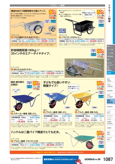 リヤカー・一輪車沖縄・離島はサービス対象外スチール製許容積載質量100kg内側に10Lごとの目盛り付き。リヤカー・一輪車●タイヤは16インチノーパンクタイヤを採用。●バケット容量は90L。プラスチック製で軽く、びません。補強を加えて積載荷重を大幅にアップ。●アルミ合金で軽量化、さらにワンタッチで折りたたみできます。●収納も運搬も楽々。タイヤは20インチ。●ノーパンクタイヤを採用。アルミ製沖縄・離島はサービス対象外許容積載質量150kg折りたたみ時[アルインコ]アルミ製折りたたみ式リヤカー[アルインコ]プラバケット付キャリー商品種別お申込番号M価税抜税抜価格税込価格単位型式/HKM1508-637-9441¥169,00¥138,000¥151,8001台許容積載質量/150kg●寸法/870(幅)×1860奥)×630(高)mm、折りたたみサイズ:370幅)×1020奥)×750高)mm、荷台寸法/900全長)×600幅)×310高)mm●質量/20.2kg●材質/アルミ、ゴム、樹脂●包装数:1商品種別お申込番号M価税抜税抜価格税込価格単位許容積載質量/100kg●寸法/700(幅)×1270(奥)×780(高)mm、バケット寸法:425(幅)×710奥)×315型式/SKDS-90K8-637-9365¥35,000¥35,000¥38,5001台質量/12.2kg、(高)mm●材質/スチール、プラスチック●お客様組立商品●包装数:1許容積載質量180kg!!20インチのエアータイヤタイプ。[ハラックス]折りたたみ式リヤカー商品種別許容積載質量/180kg●寸法/885(幅)×1680奥)×620(高)mm、折りたたみサイズ:310(幅)×970(奥)×620(高)mm、荷台寸法(内寸)600幅)×900奥)×320高)mm●質量/17.8kg●材質/アルミ●包装数:1(アルミパネル付)8-637-9067¥126,300¥123,000¥135,3001台型式/HC-906Aお申込番号M価税抜税抜価格税込価格単位園芸・農作業の必需品!スチール製許容積載質量60kgスチール製で頑丈!沖縄・離島はサービス対象外子どもでも扱いやすい軽量タイプ!軽量で錆びにくいアルミ製フレーム。アルミ製許容積載質量180kg沖縄・離島はサービス対象外沖縄・離島はサービス対象外アルミ製許容積載質量50kg浅型深型[富士]スチール一輪車浅型41L商品種別許容積載質量/60kgお申込番号8-637-9059税込価格税抜価格¥16,504M価税抜オープン●寸法/600(幅)×1400(奥)×680高)mm、バケット板厚:1.0mm、パイプ径:25.4径)mm、バケット寸法:680幅)×770奥)×150高)mm●質量/14kg●材質/スチール●包装数:1¥18,154単位1台[富士][富士]アルミ一輪車浅型41Lアルミ一輪車深型53L商品種別許容積載質量/50kgお申込番号8-637-9207商品種別許容積載質量/50kgお申込番号8-637-9208税込価格税抜価格¥19,200M価税抜オープン●寸法/550(幅)×1330(奥)×440(高)mm、パイプ径:25.4径)mm、バケット寸法:650幅)×820(奥)×160高)mm●質量/7.7kg●材質/フレーム:アルミ、バケット:ポリプロピレン●包装数:1¥21,120単位1台税込価格税抜価格¥21,804M価税抜オープン●寸法/520(幅)×1230奥)×450高)mm、パイプ径:25.4(径)mm、バケット寸法:505(幅)×775(奥)×290¥23,984(高)mm●質量/7.9kg●材質/フレーム:アルミ、単位1台バケット:ポリプロピレン●包装数:1ハンドルは二重パイプ構造でとても丈夫。[ハラックス]アルミ一輪車プラバケット付商品種別許容積載質量/100kg●寸法/670(幅)×1385(奥)×530(高)mm、バケット寸法:650(幅)×800(奥)×150高)mm●質量/7.7kg●材質/フレーム:アルミ、バケット:ポリプロピレン●包装数:1¥21,400¥20,500¥22,5501台8-637-9062型式/CF-2お申込番号M価税抜税抜価格税込価格単位沖縄・離島はサービス対象外アルミ製許容積載質量100kg学習ペーパークラフト・素材イベント用品学習支援用品保育安全・安心OA・サプライ用品文具・事務用品日用品電化化消耗品耗工具・具・作業用品業収納用品納雨具・具・生活雑貨活飼育・園芸用品清掃用品掃トイレレ用品品ティッシュティッシュペーパー・パタオルル洗面所・洗面所・洗濯用品濯保健室保健室飲料・料・食品食品キッチンキッチン用品品※メーカー直送品です。返品はご容赦ください。上記商品は受注日から8営業日以内のお届けになります。※カタログに掲載の商品情報(仕様・価格・税率など)は変更になる場合がございます。最新情報はUCHIDASww.uchidas.netwへ!Vol.201087